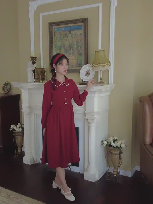 【予約商品】エレガントレトロネイビーブルーワンピース+スリムリボン+ブローチ
