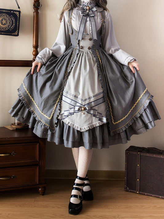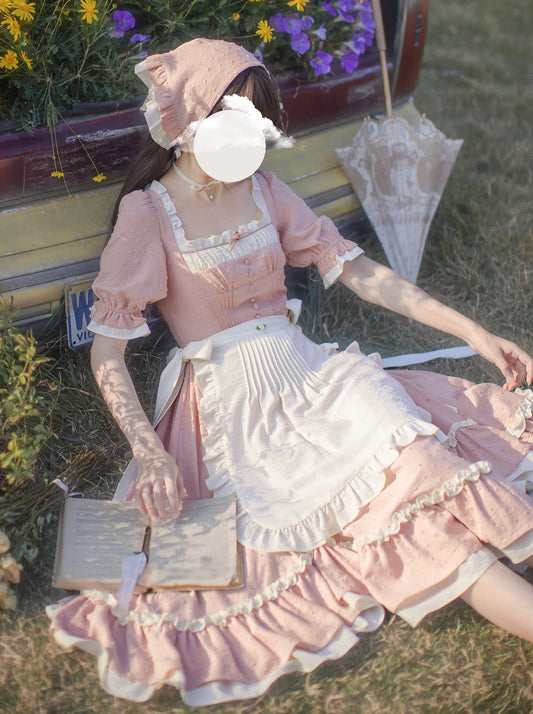 Sweet Elegant Light Lolita Frilled Shirt + Dotted Lace Sundress + Top Ribbon + Waist Ribbon [Reserved Item].