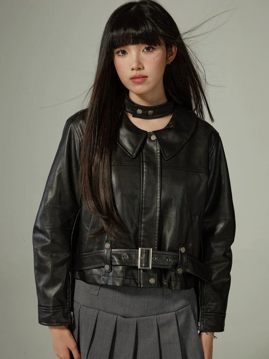 Ensemble veste en cuir + jupe plissée rétro avec ceinture rose à rivets