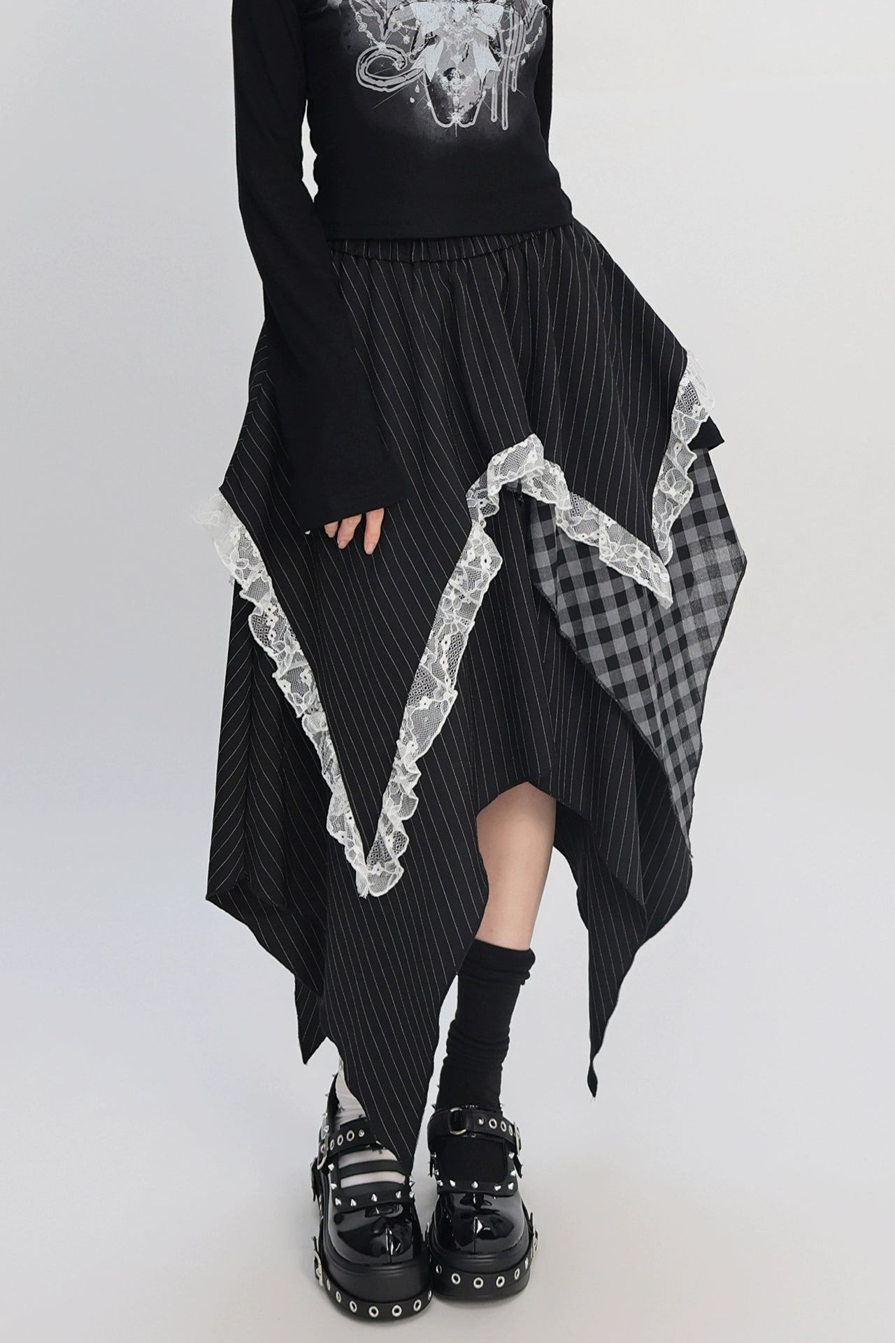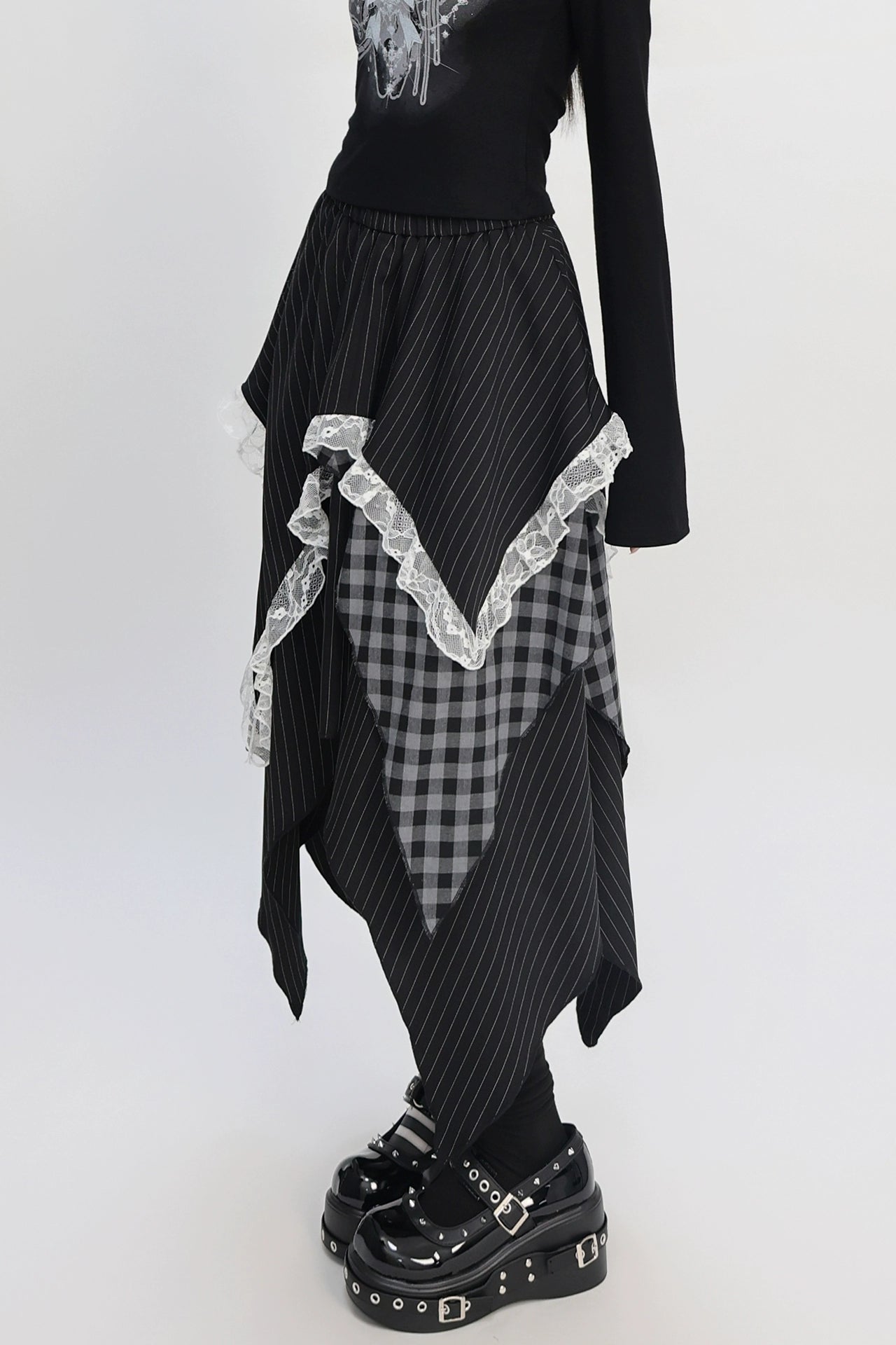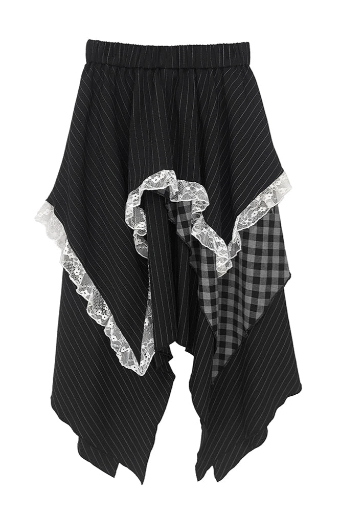 パッチワークアシメストライプチェックレーススカート