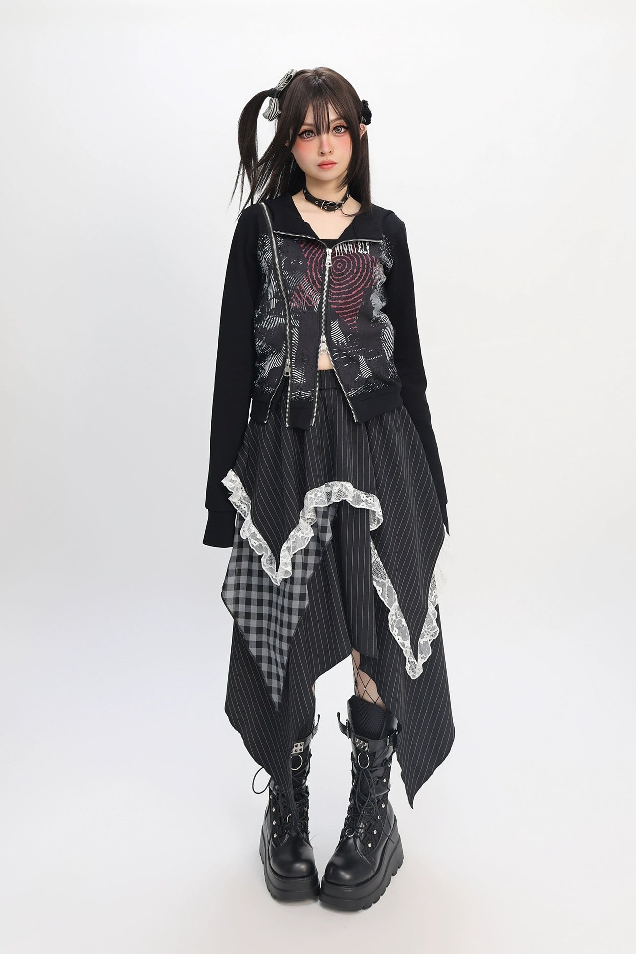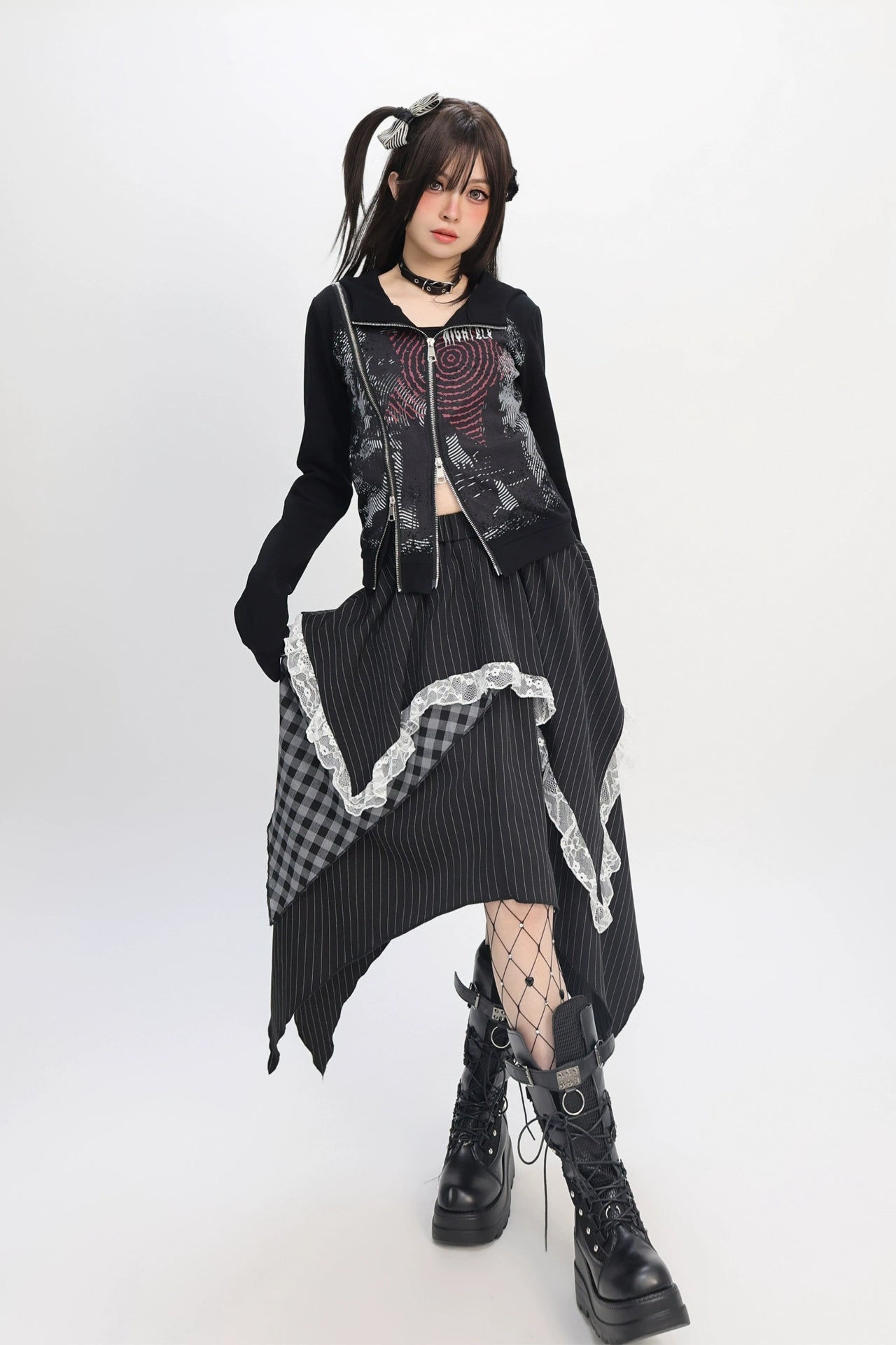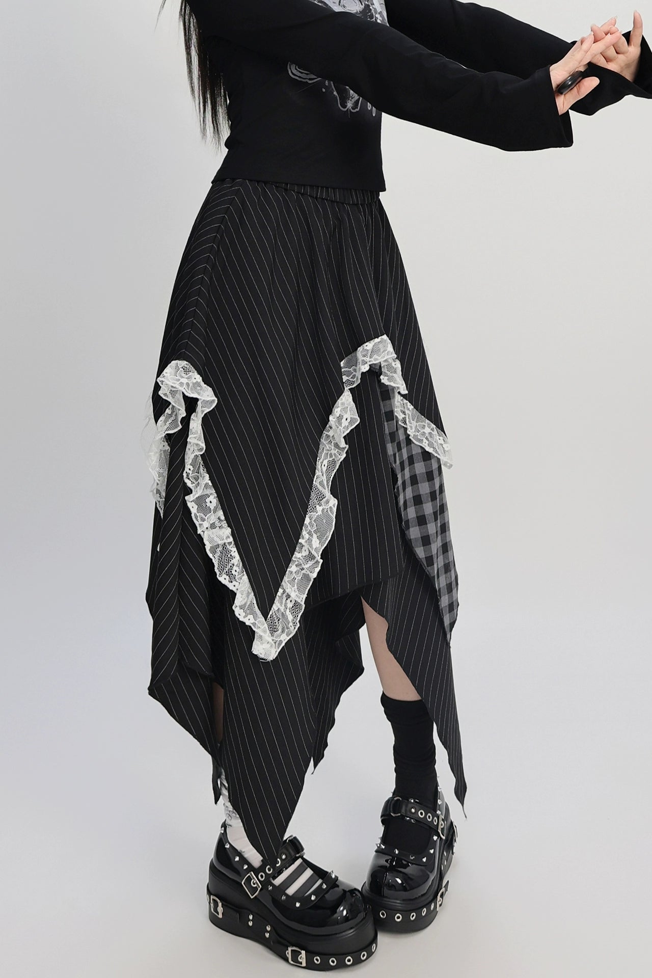 パッチワークアシメストライプチェックレーススカート