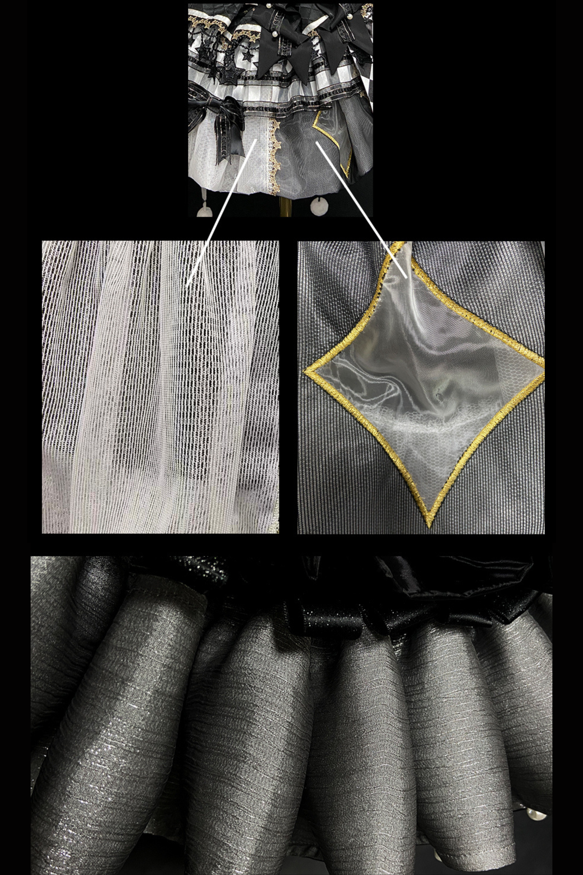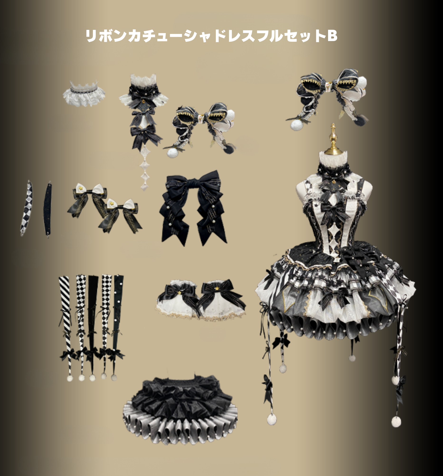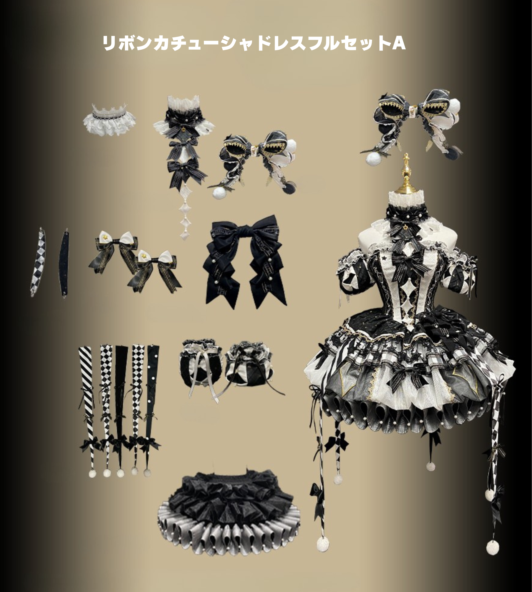 ドレスセット内容【JKSドレス本体+取り外し可能なアシンメトリーショルダーストラップ+取り外し可能なトレーンアクセサリー5本+ブラックリボン+フリルカラー(リボンチャームと交換用フリルカラー付き)+リボンヘアクリップ2個】