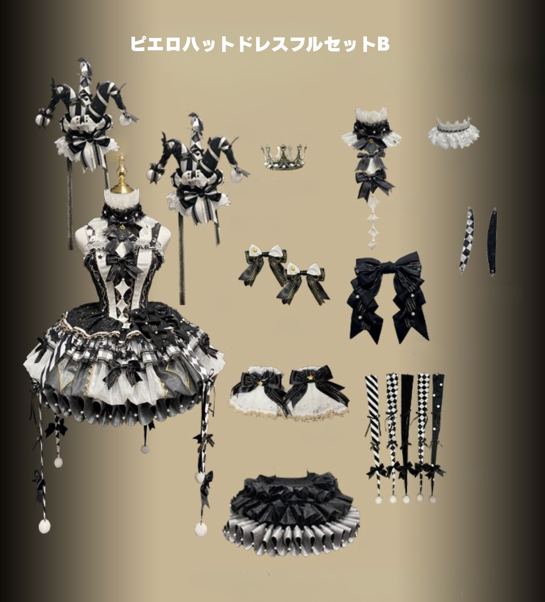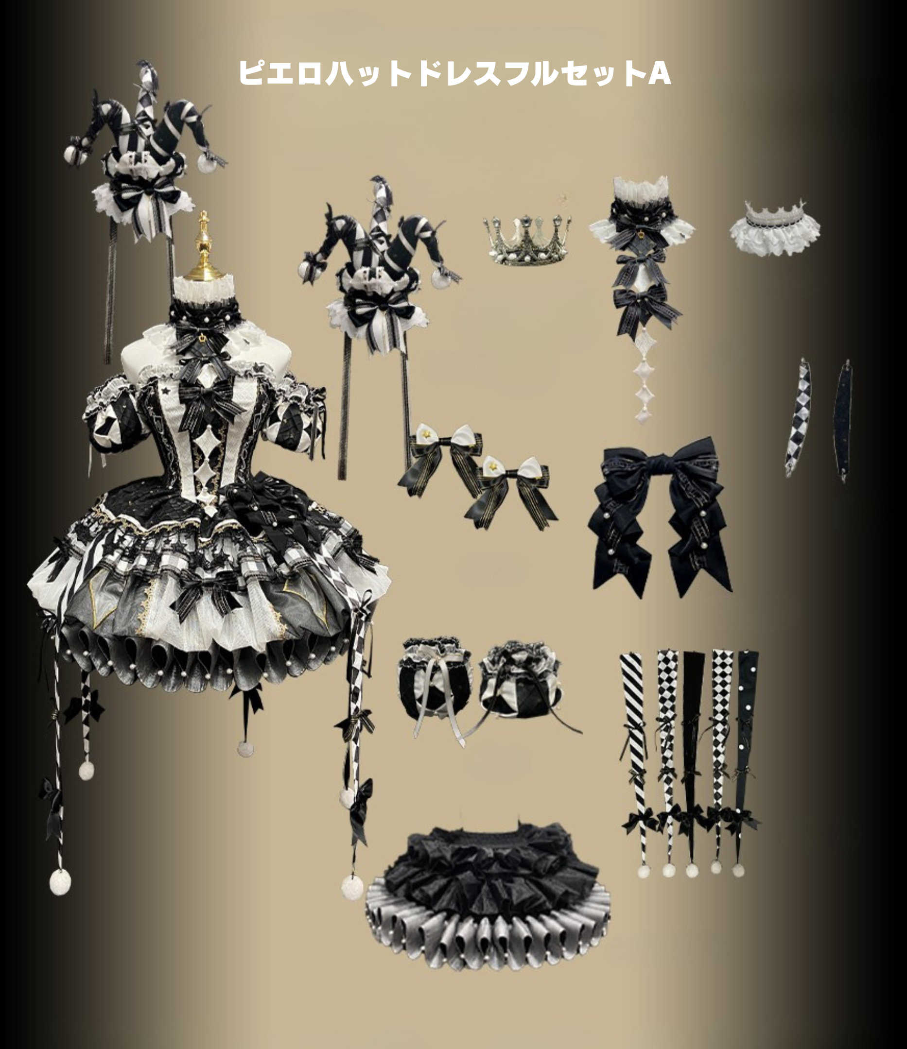 ピエロハットドレスフルセットB内容【ドレスセット(上記)+ピエロハット(王冠付き)+インナーラッフルスカート+ハンドスリーブ】