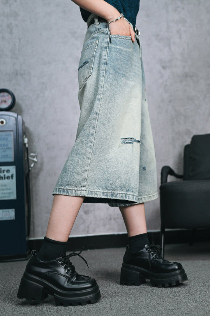 ❤ダメージハーフデニムワイドレッグパンツ❤