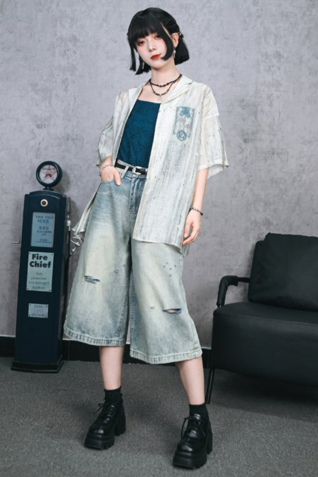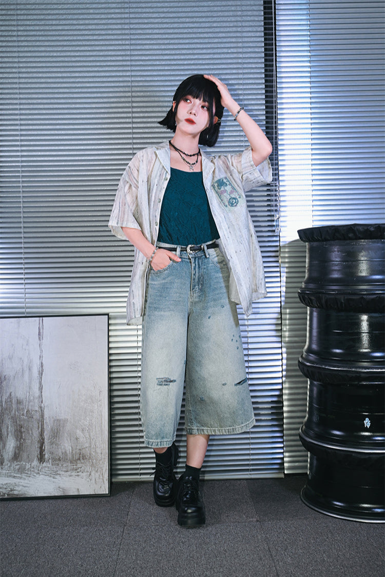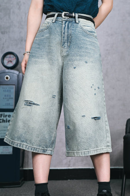 ダメージハーフデニムワイドレッグパンツ
