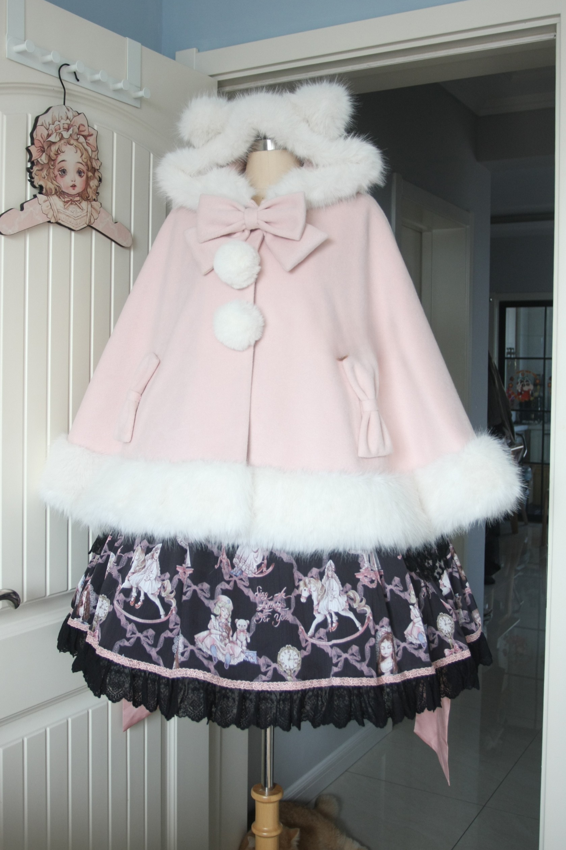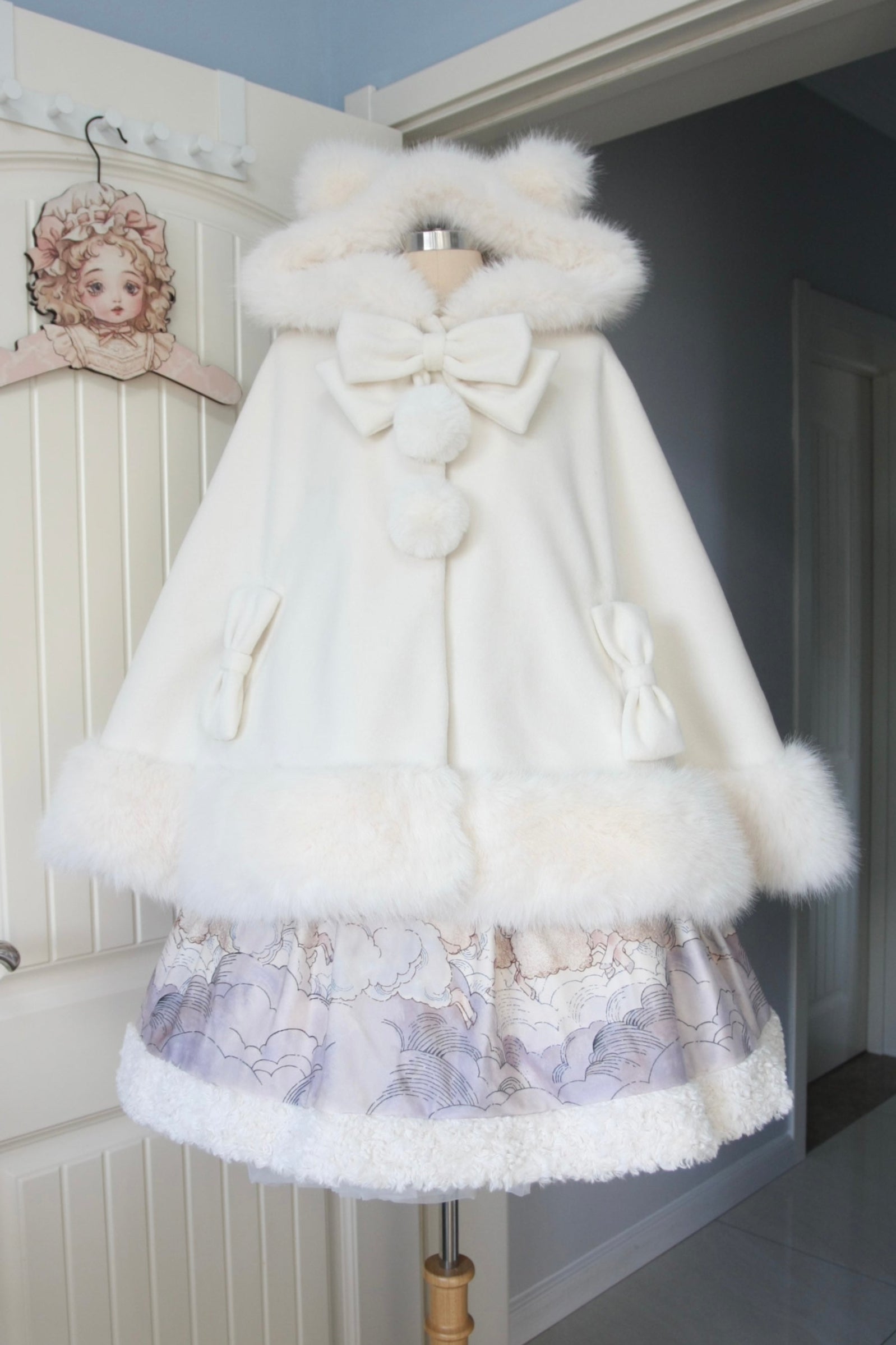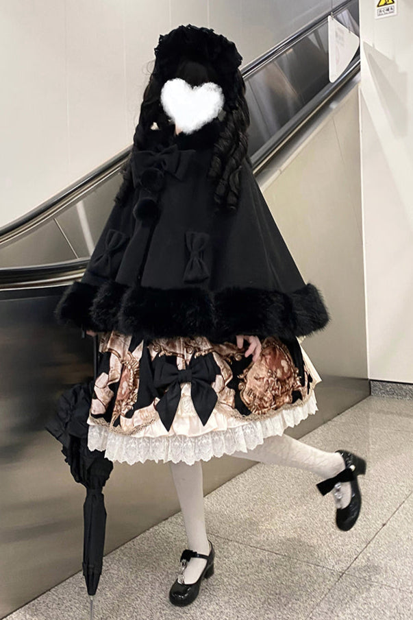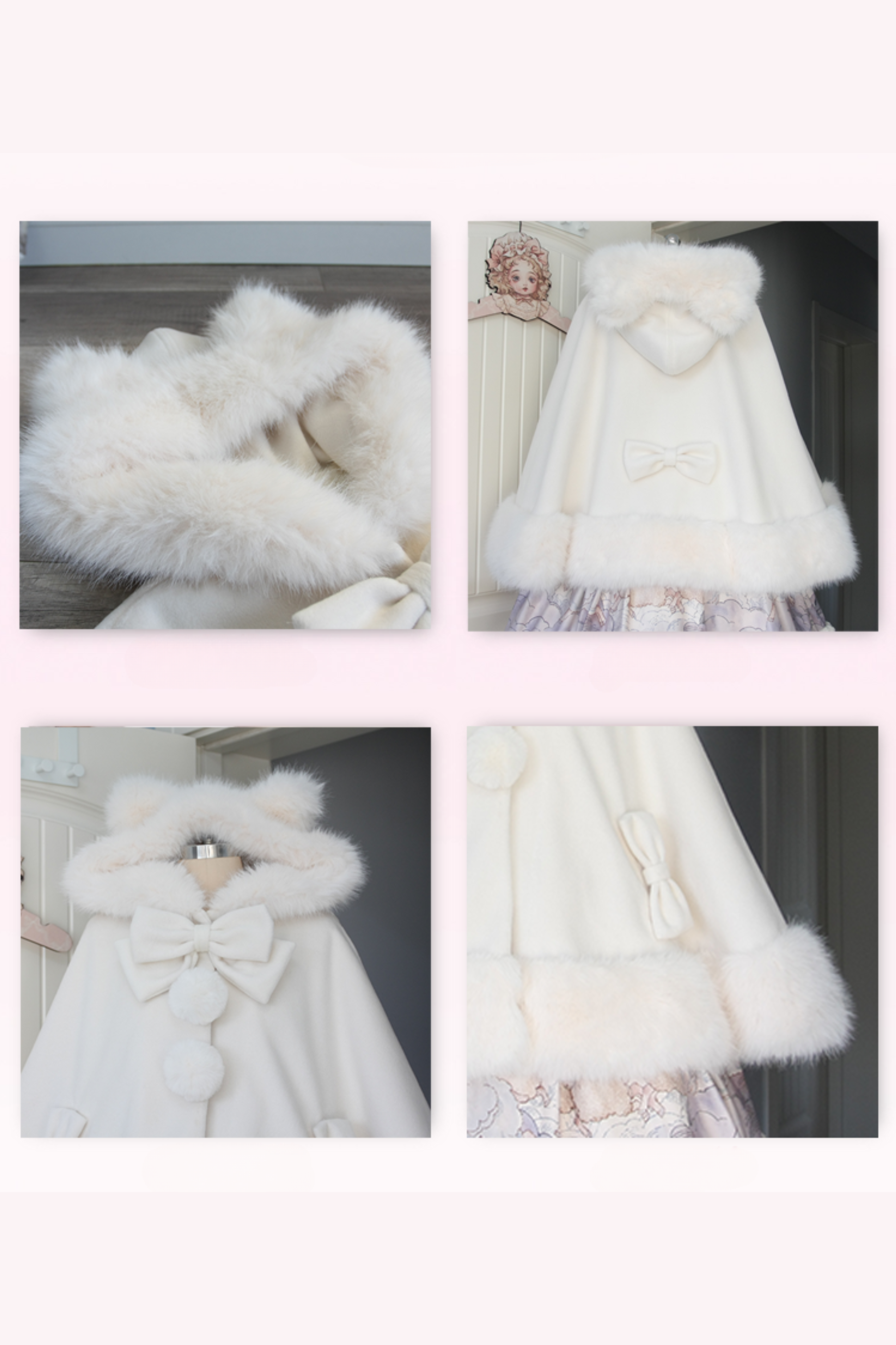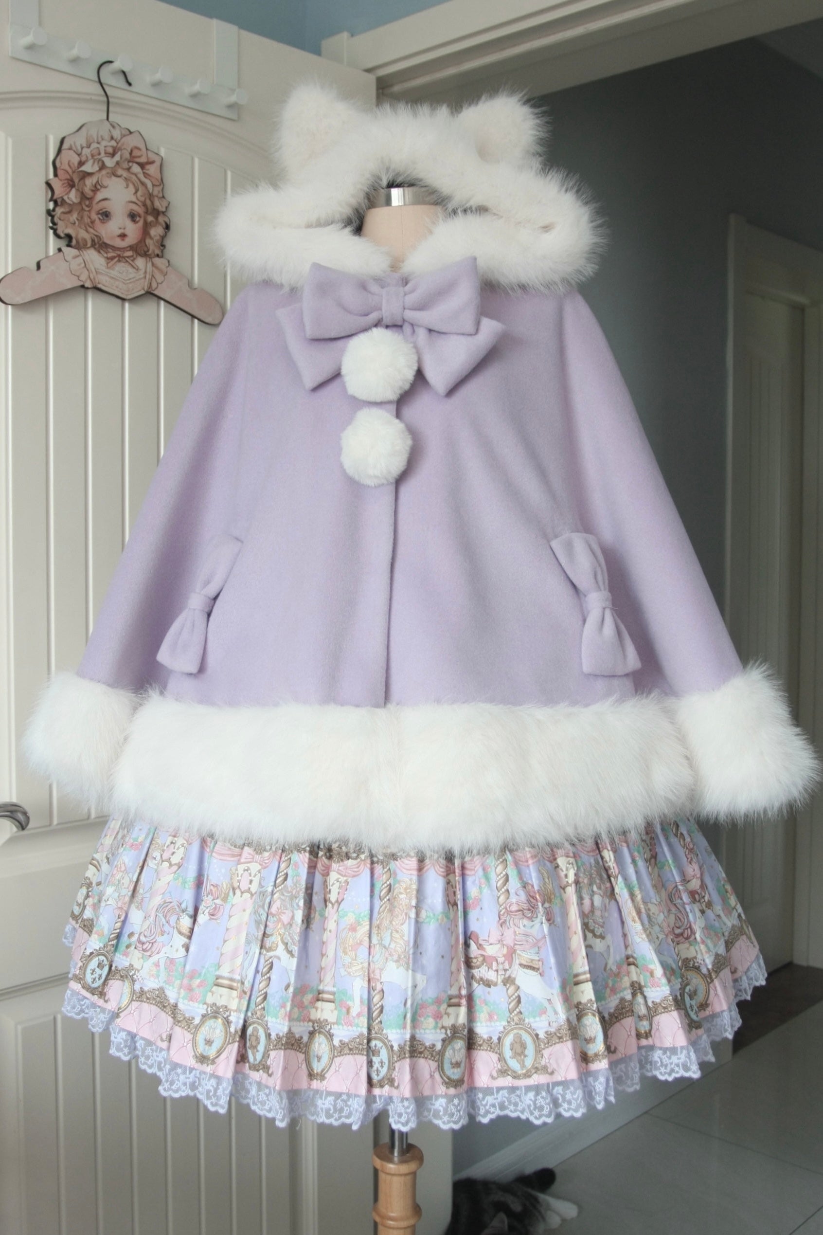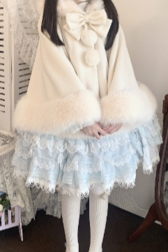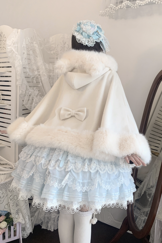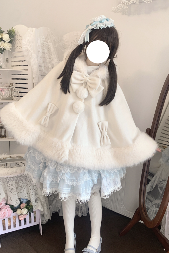 ケープコートには胸元に取り外し可能な大きなリボンとファーボール2個が付いています