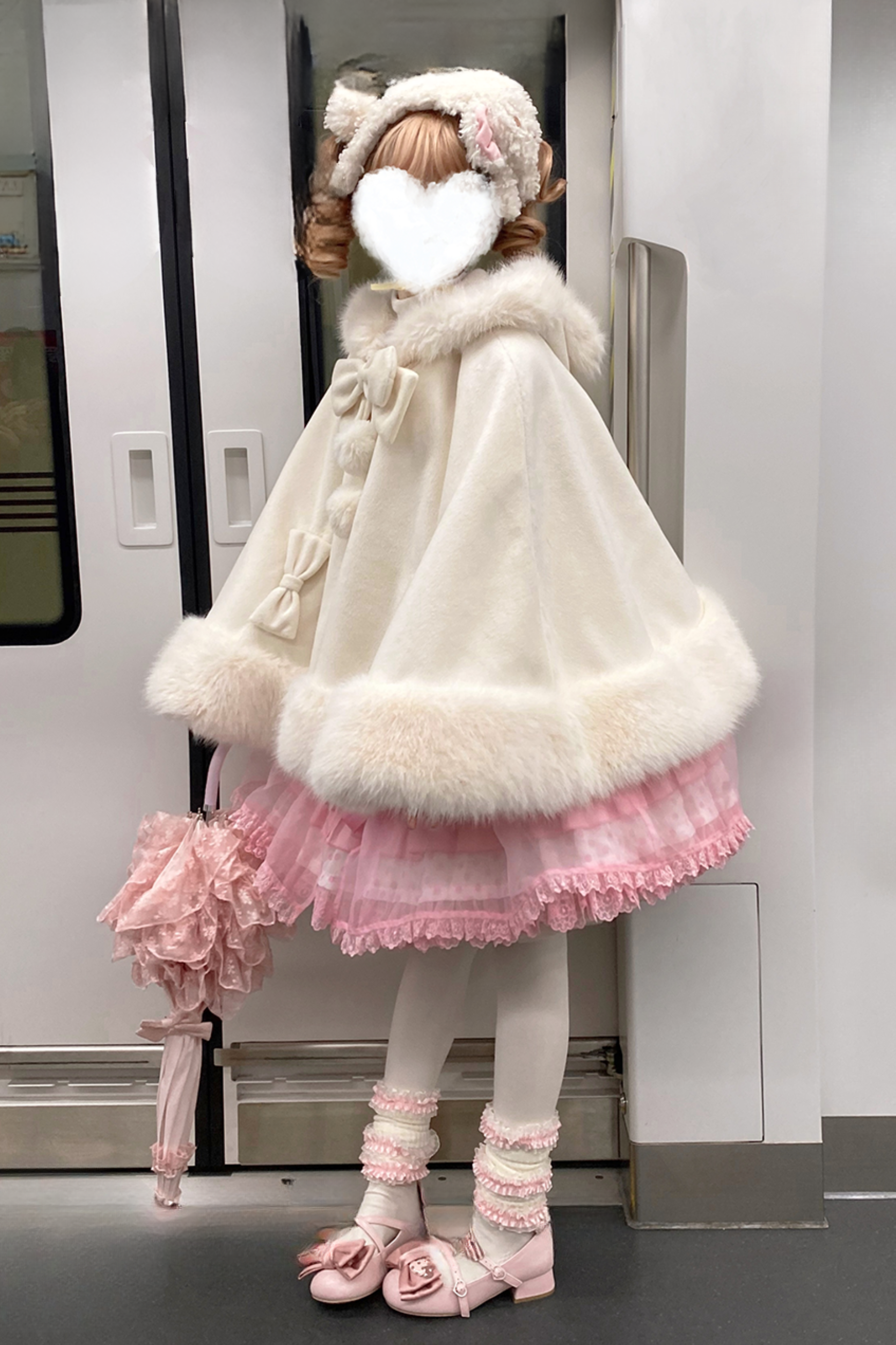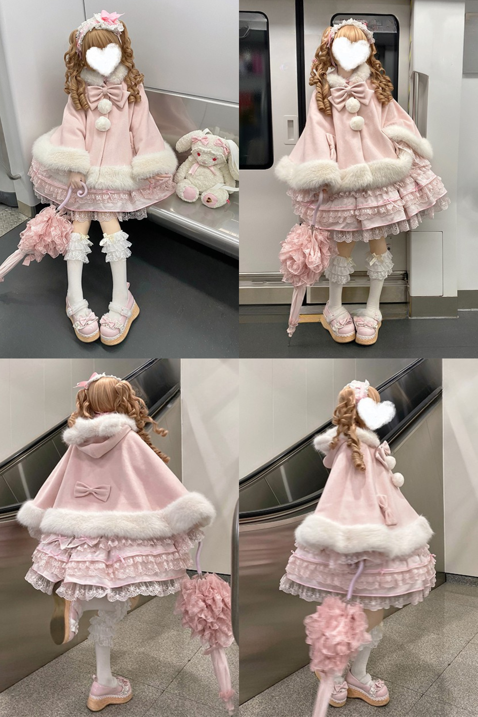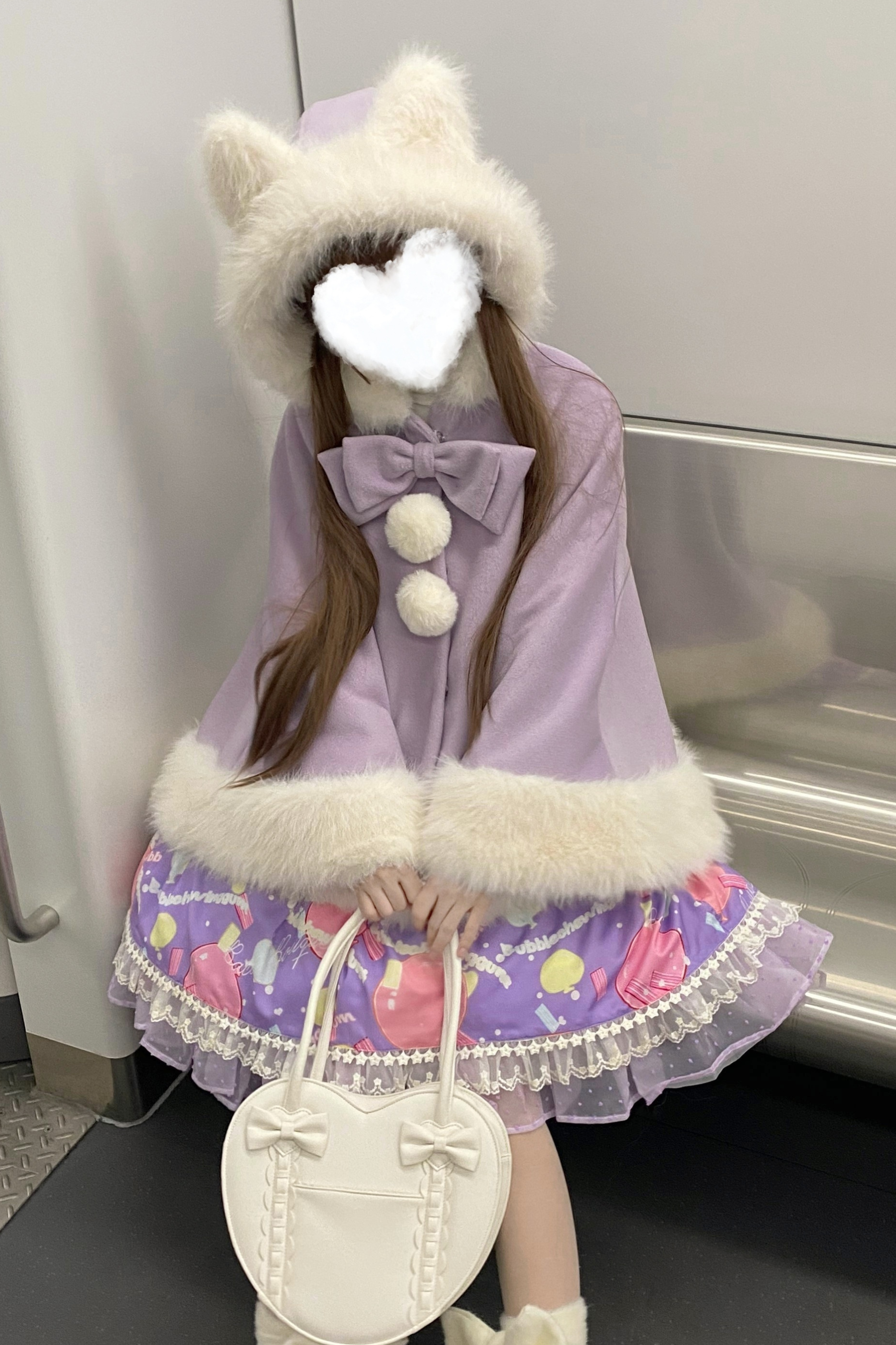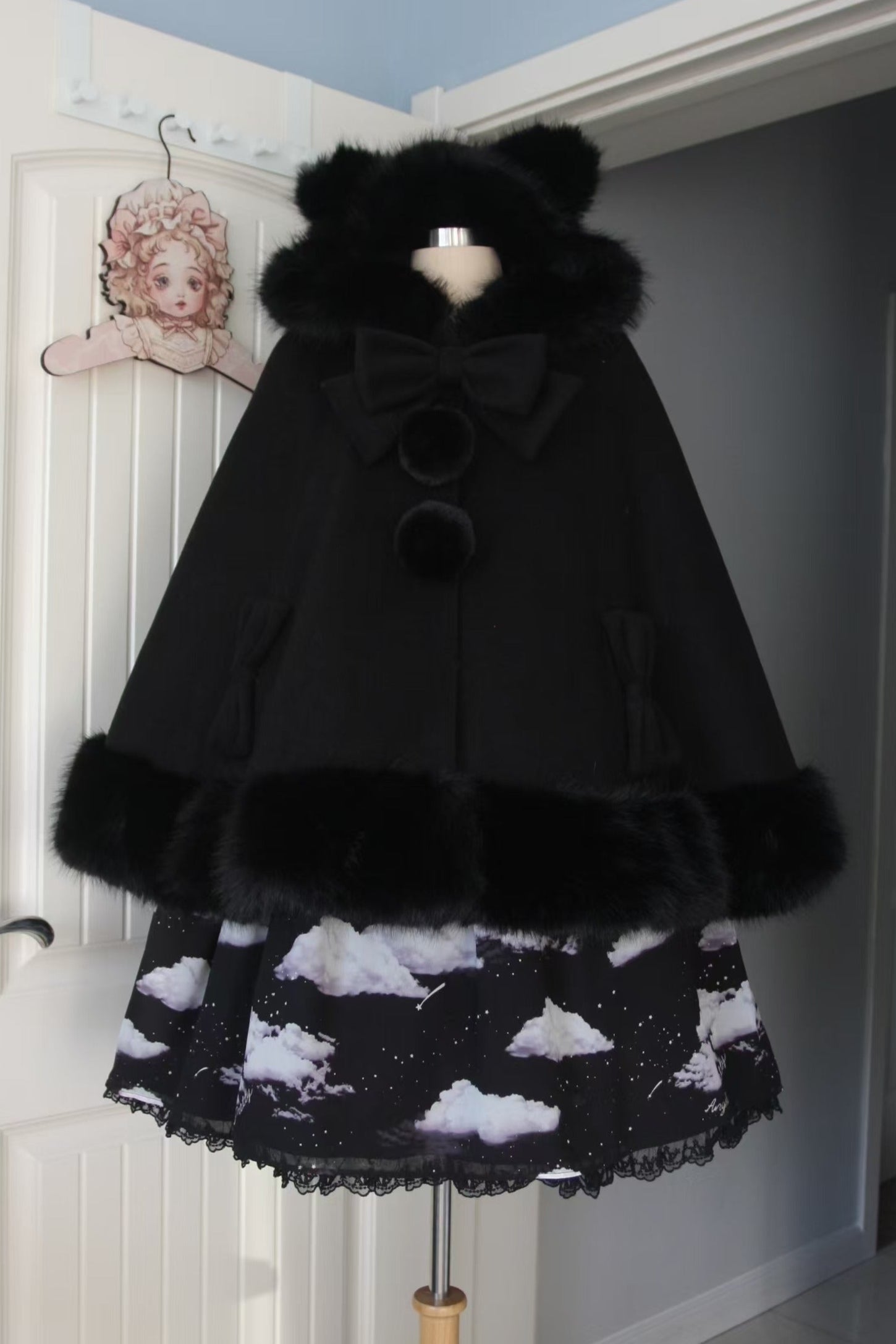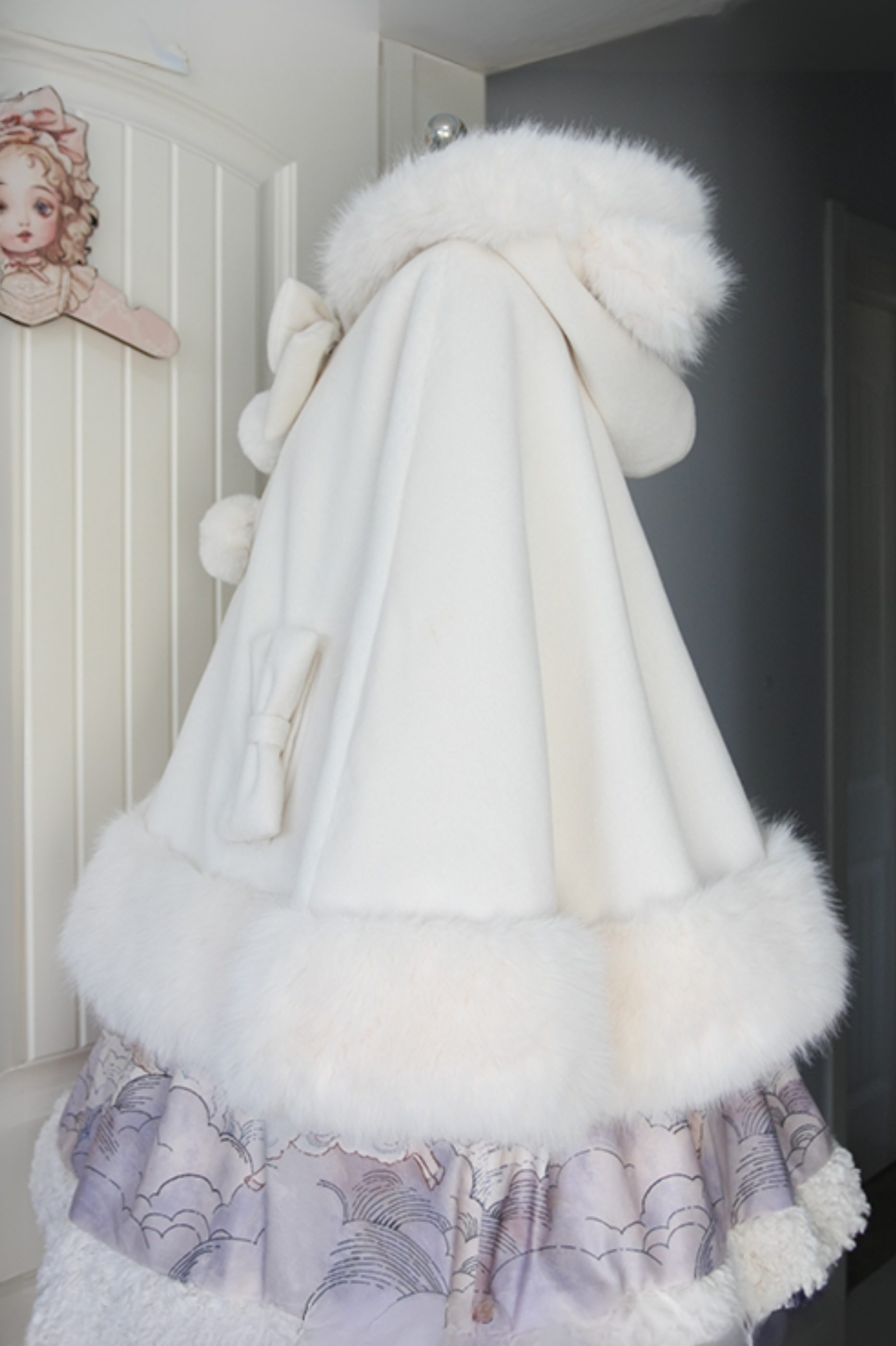 ケープコートには胸元に取り外し可能な大きなリボンとファーボール2個が付いています