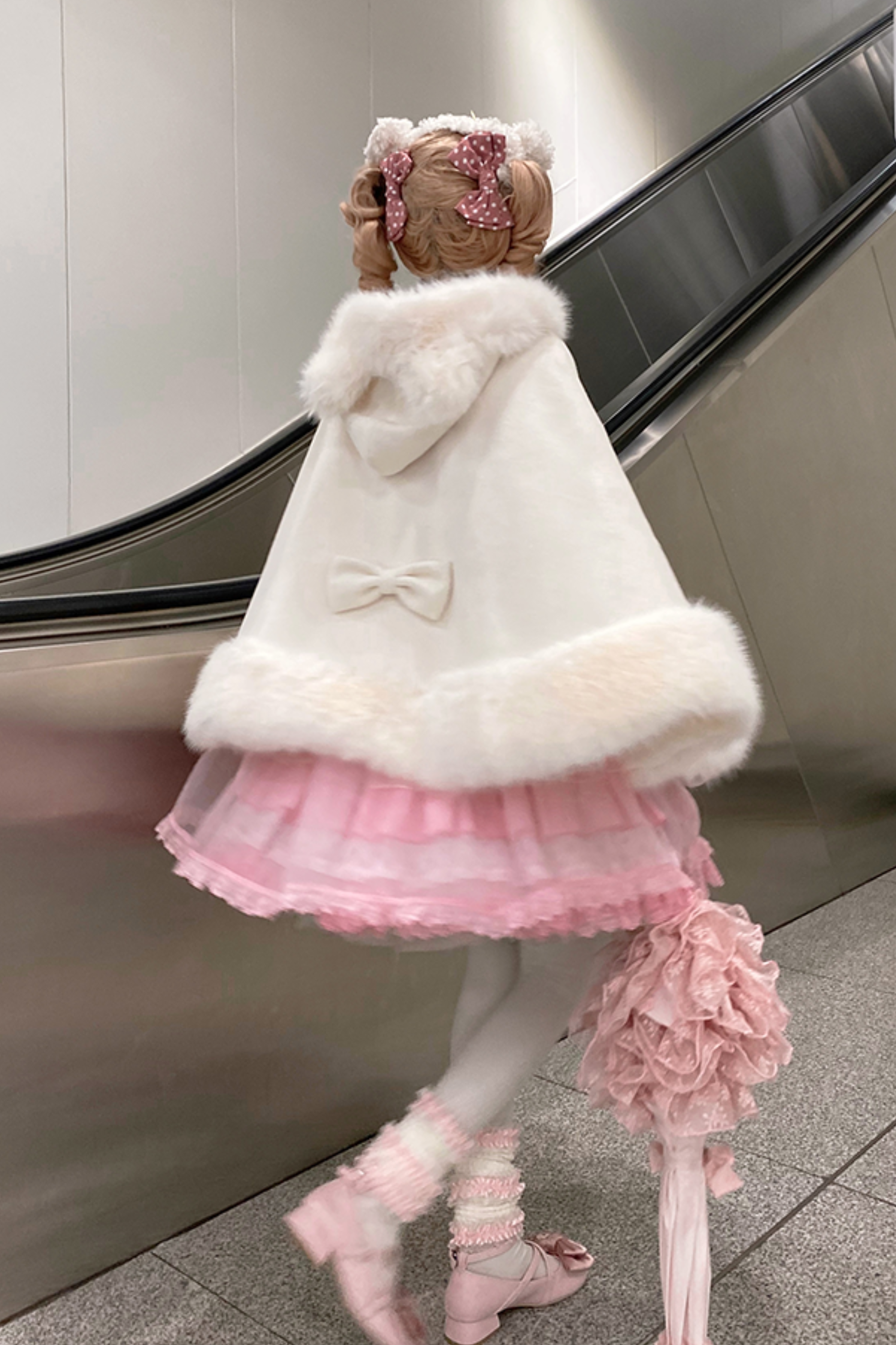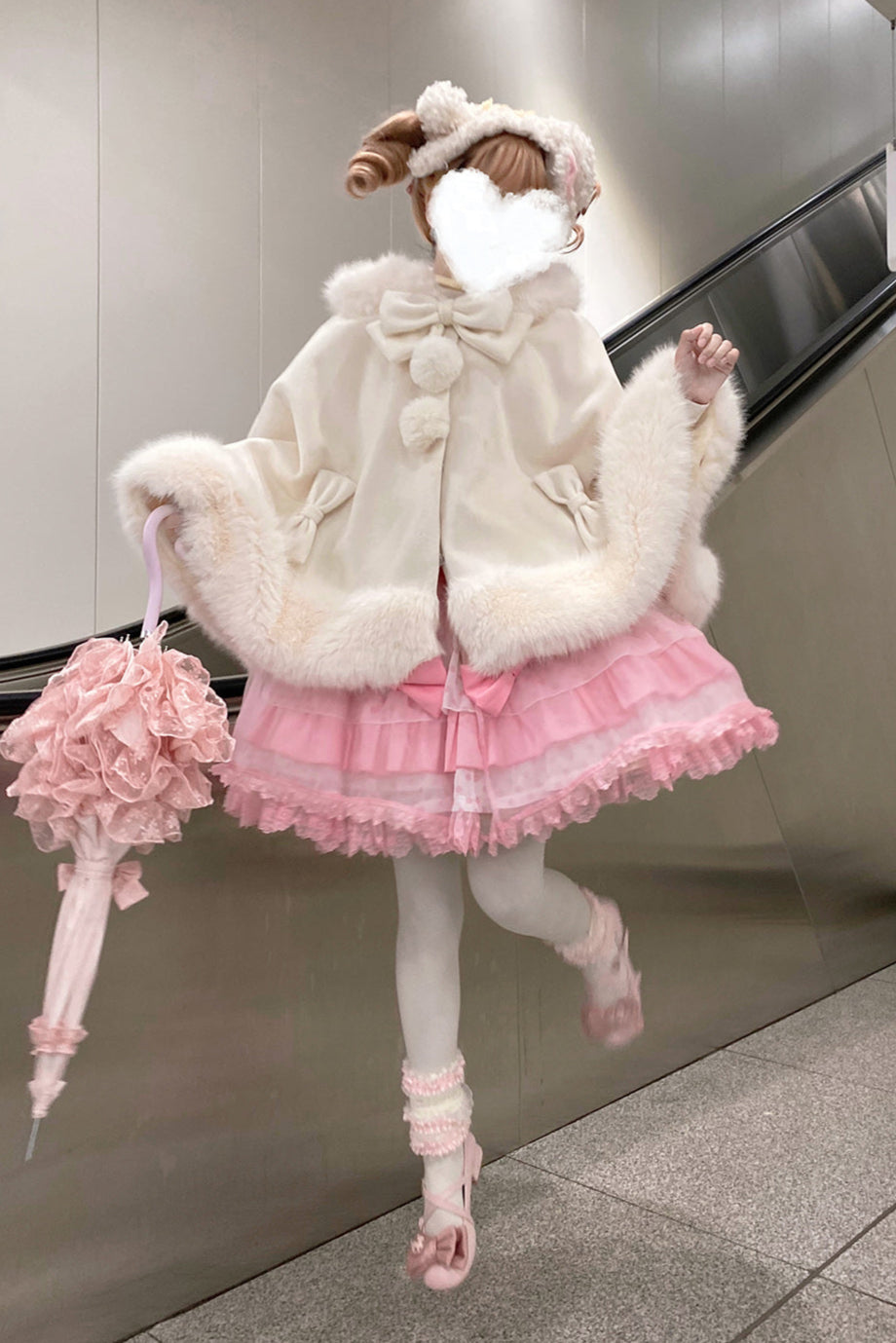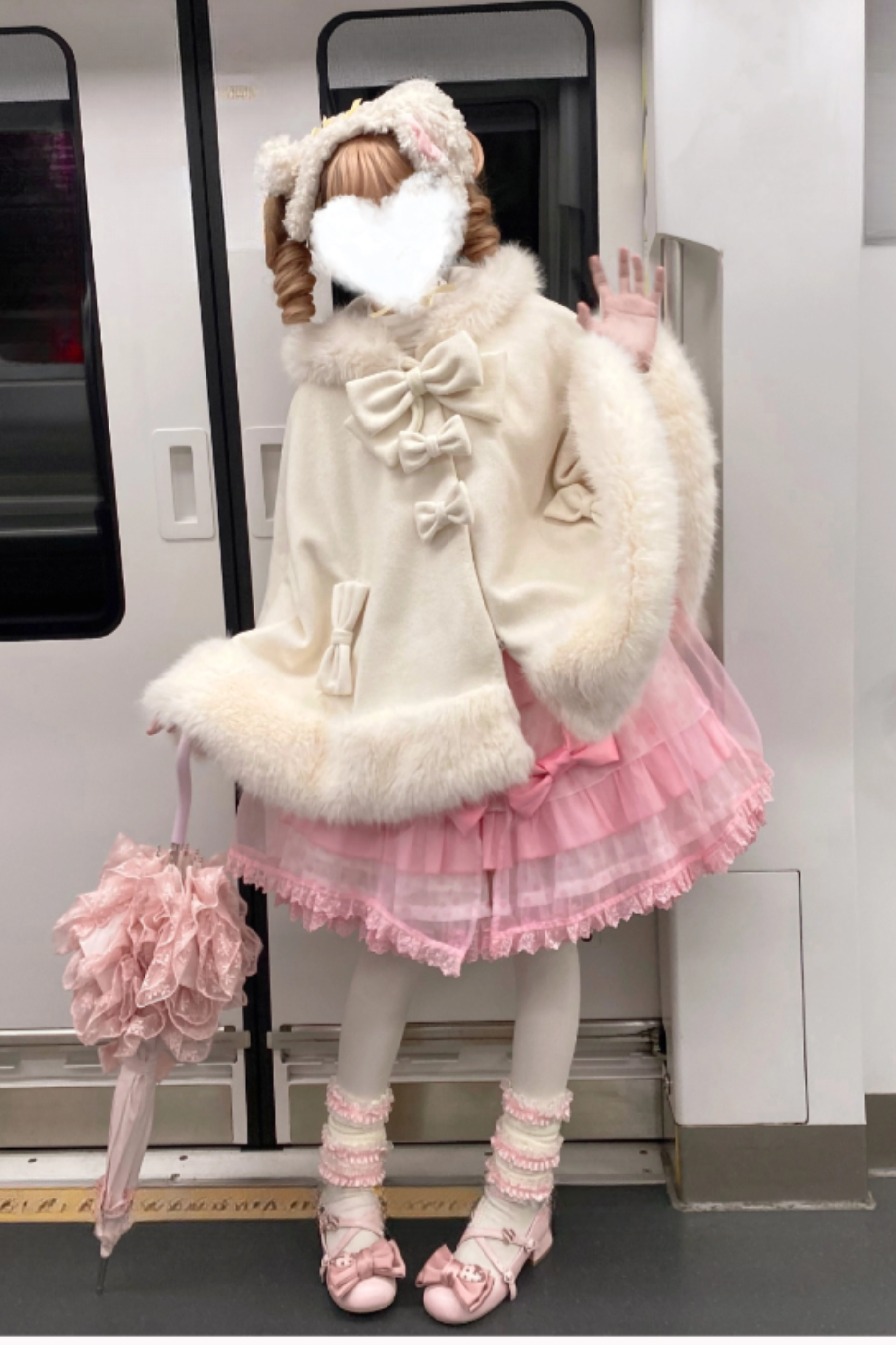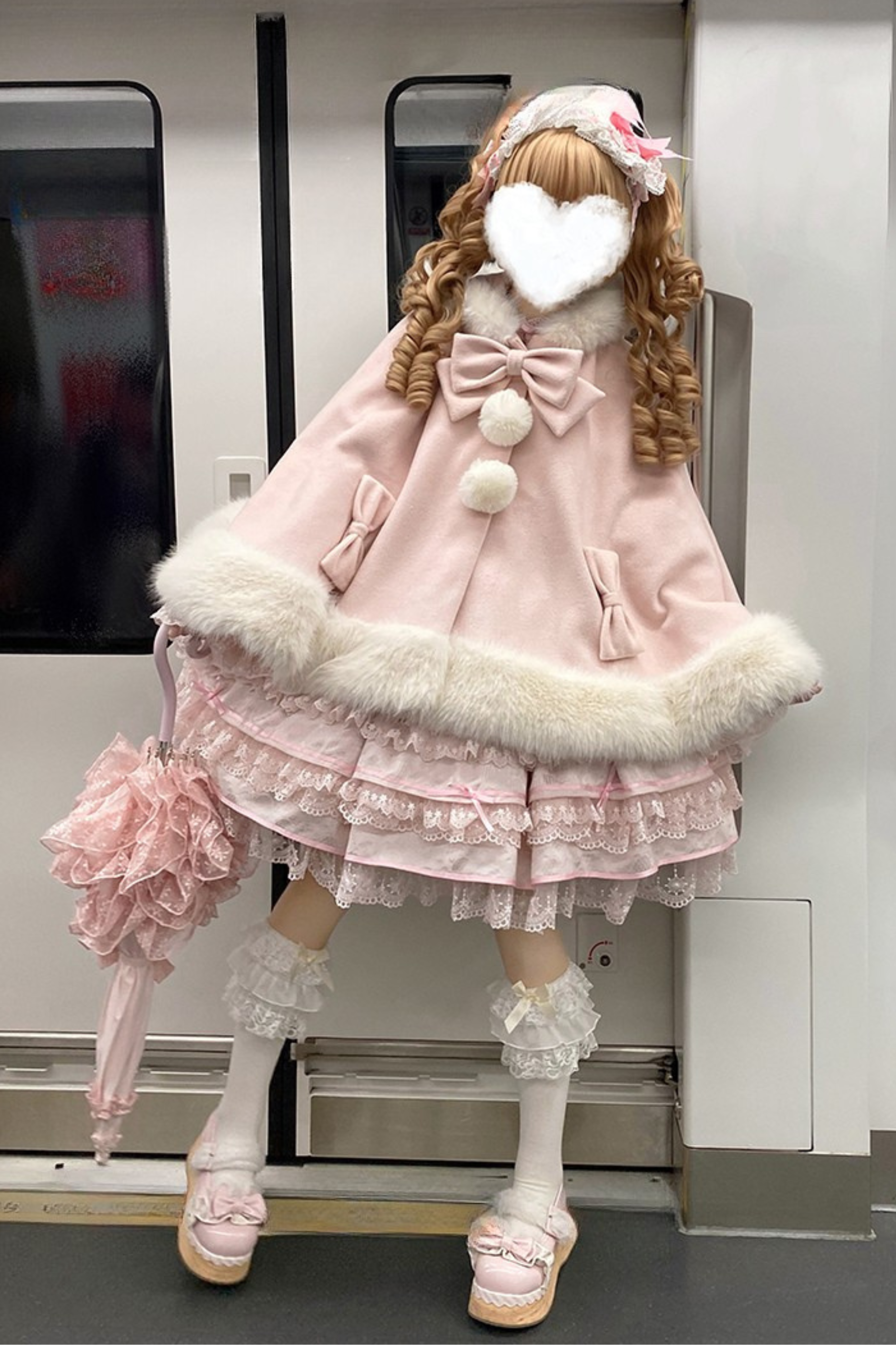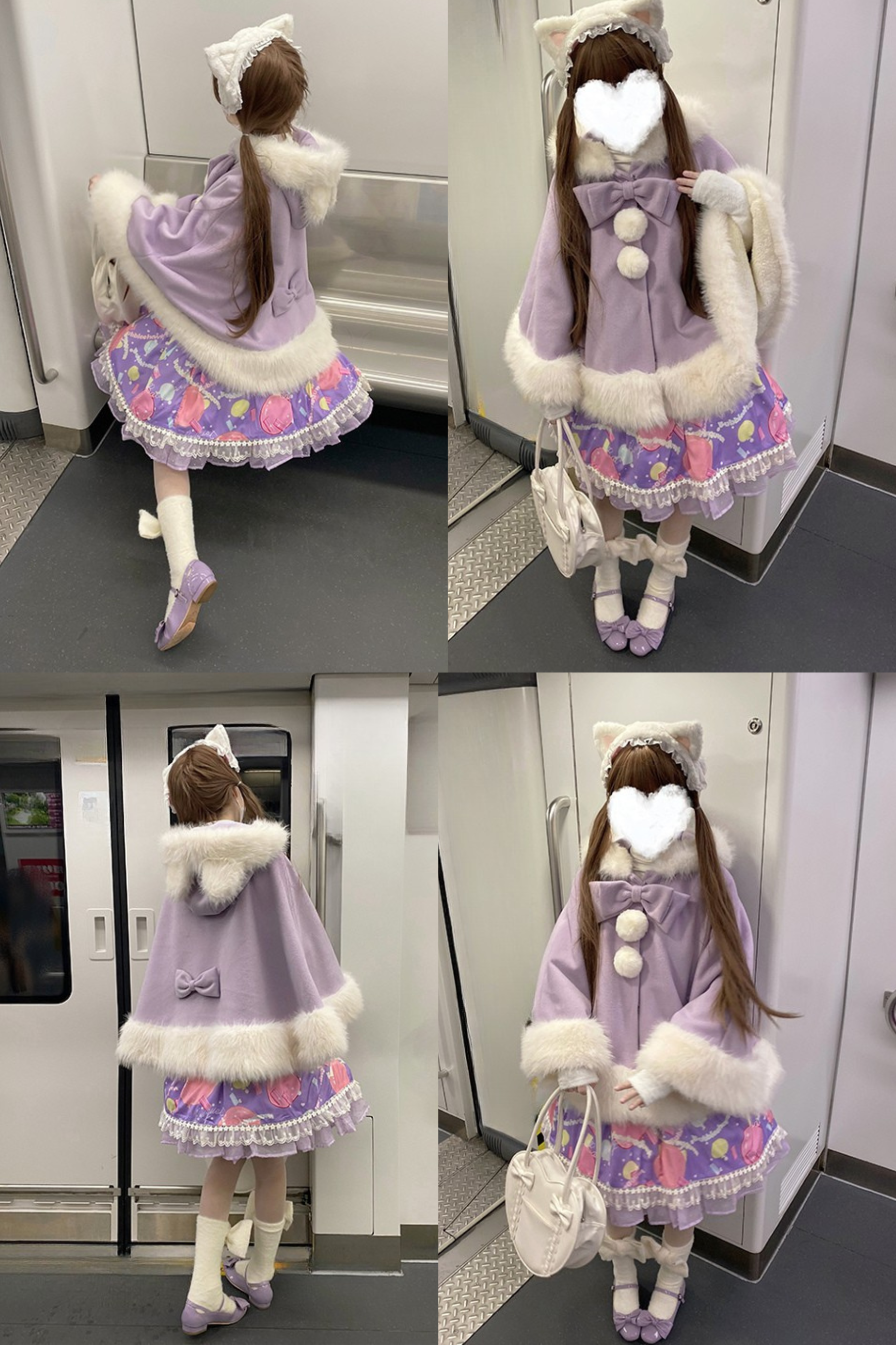 ケープコートには胸元に取り外し可能な大きなリボンとファーボール2個が付いています