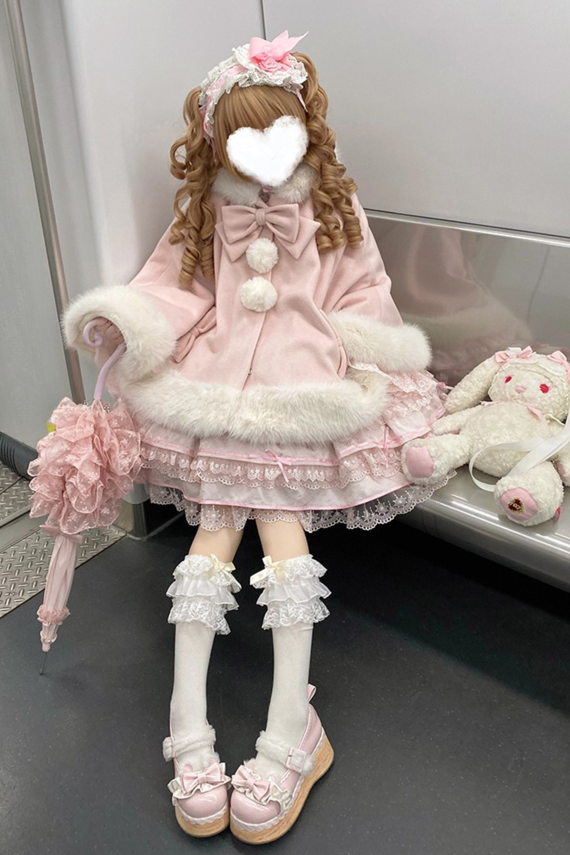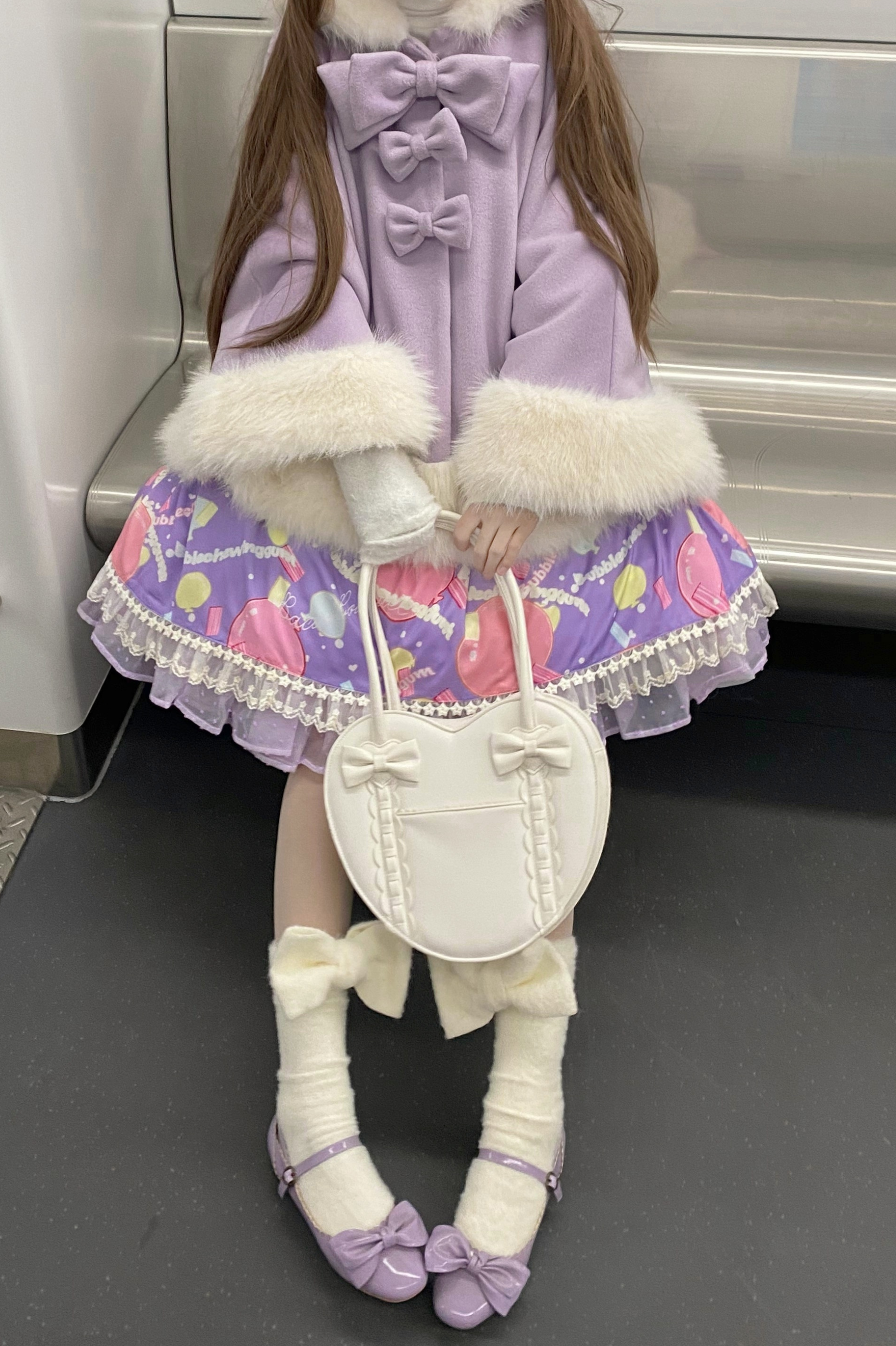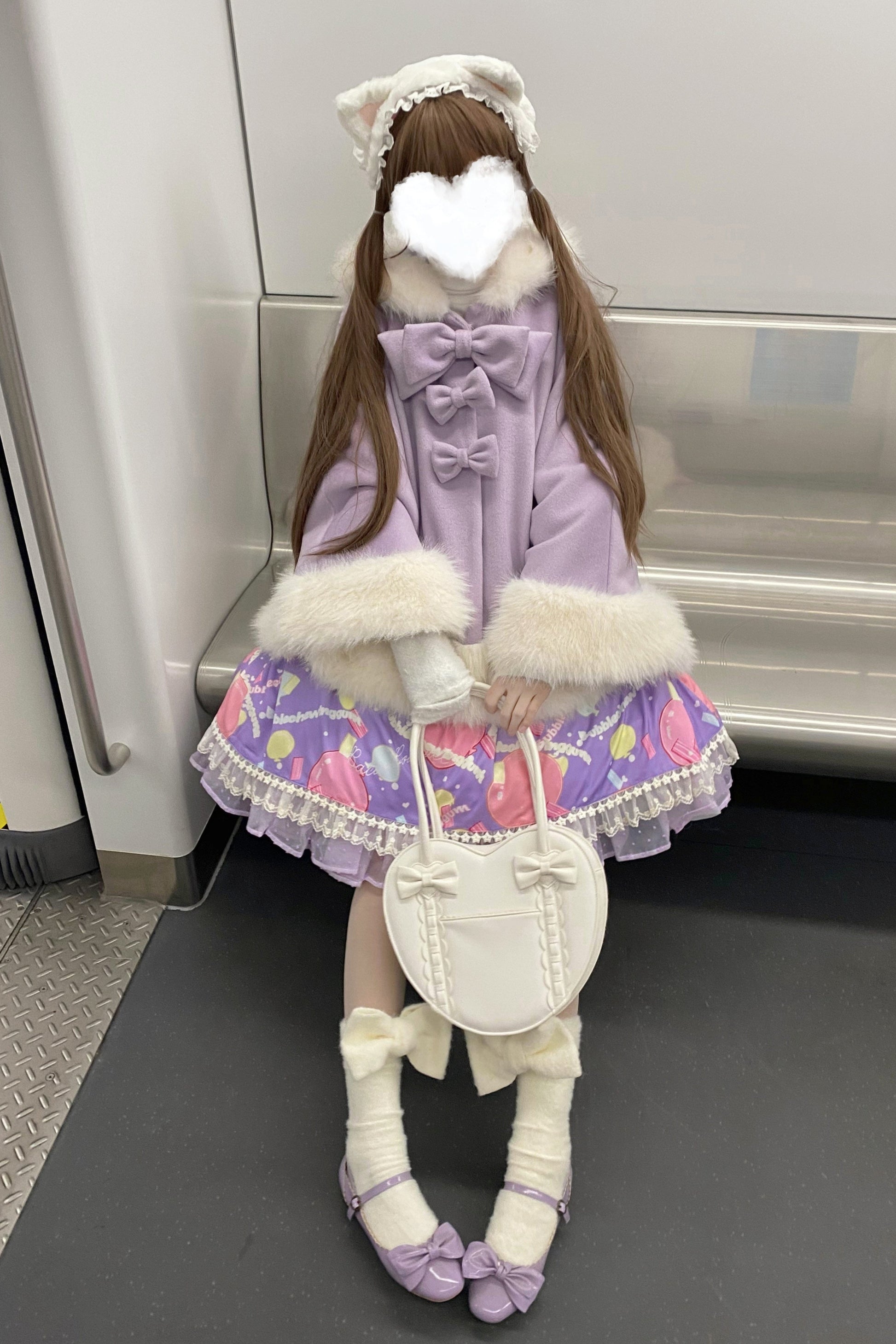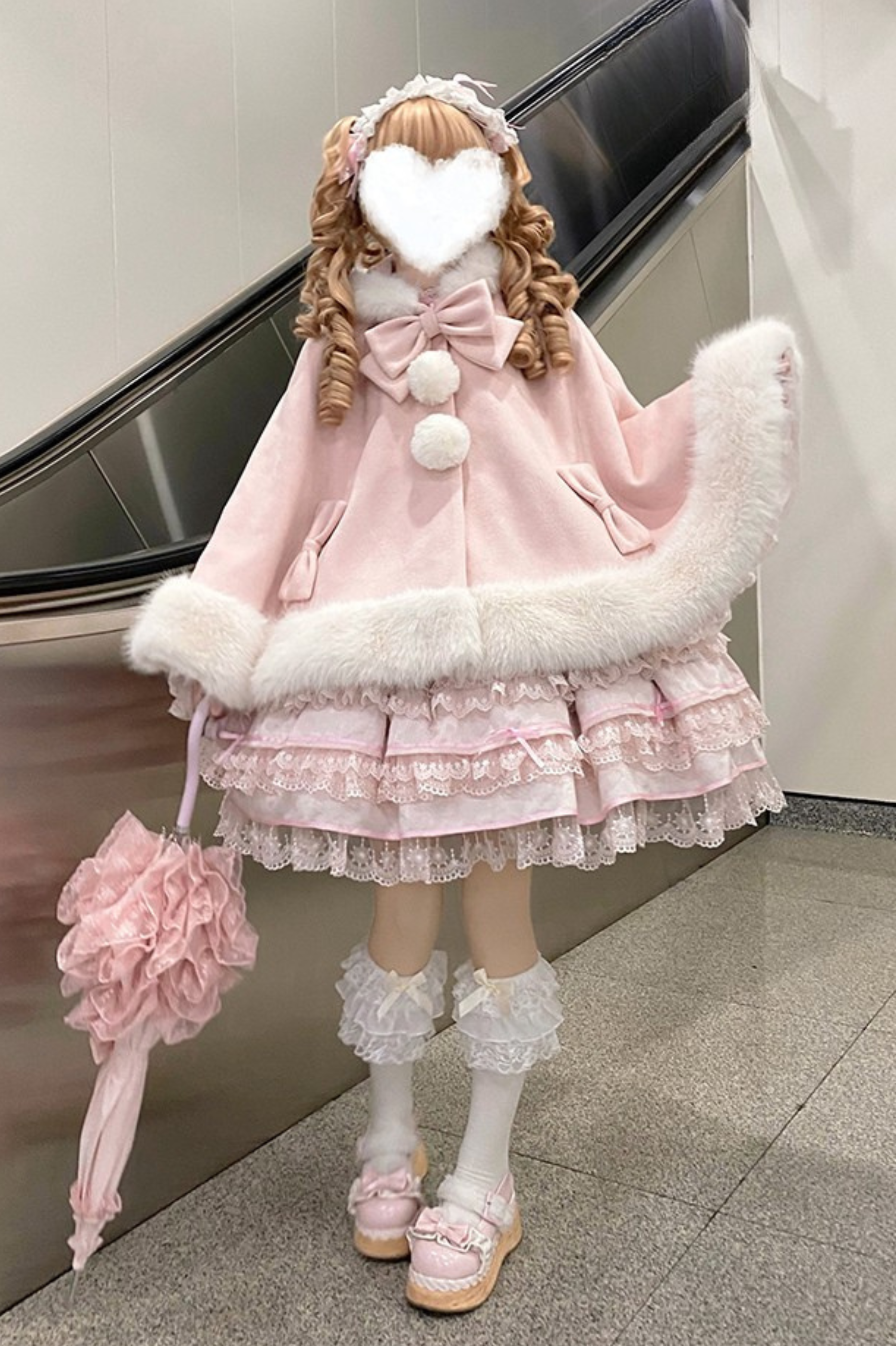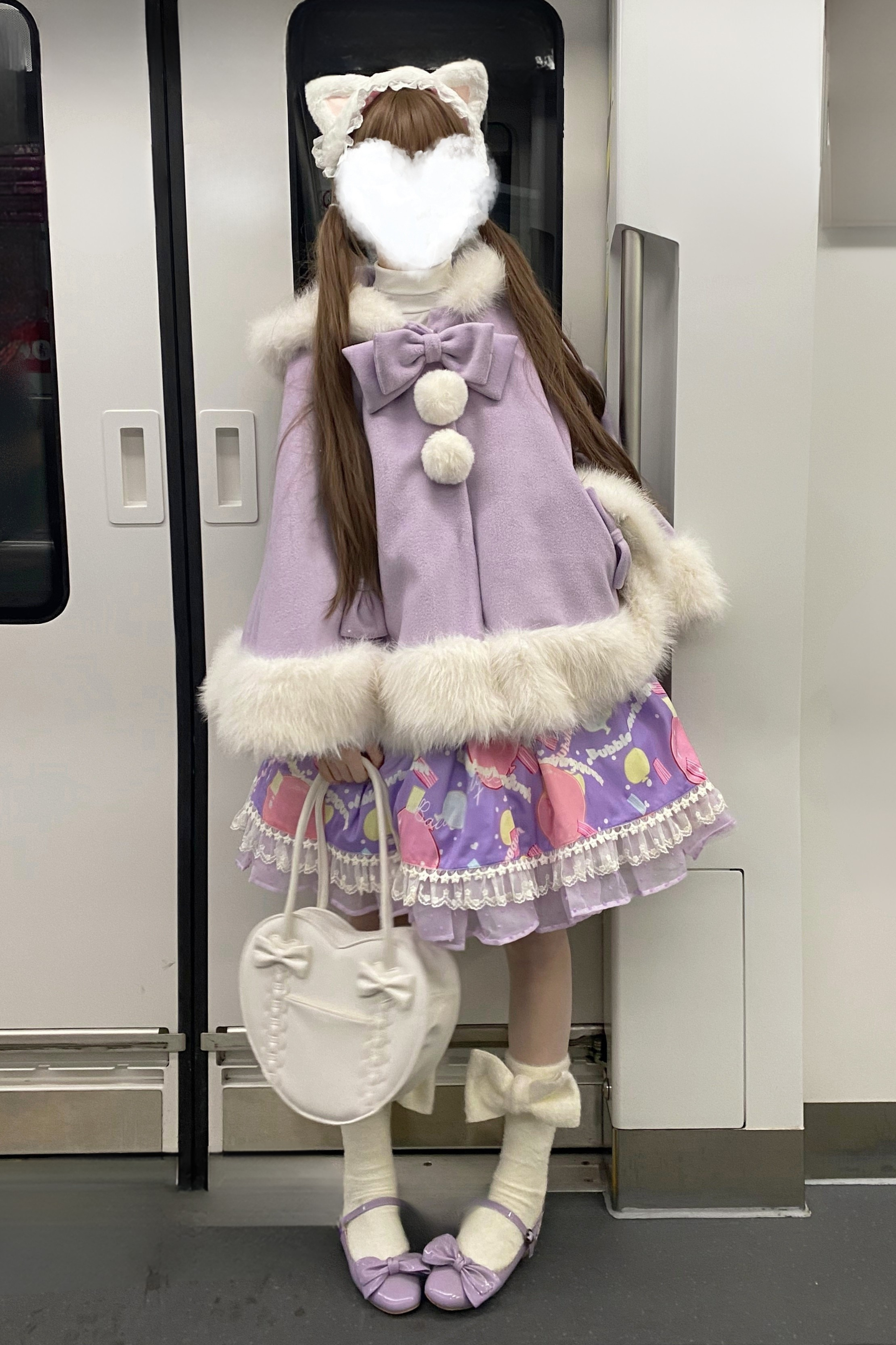ケープコートには胸元に取り外し可能な大きなリボンとファーボール2個が付いています