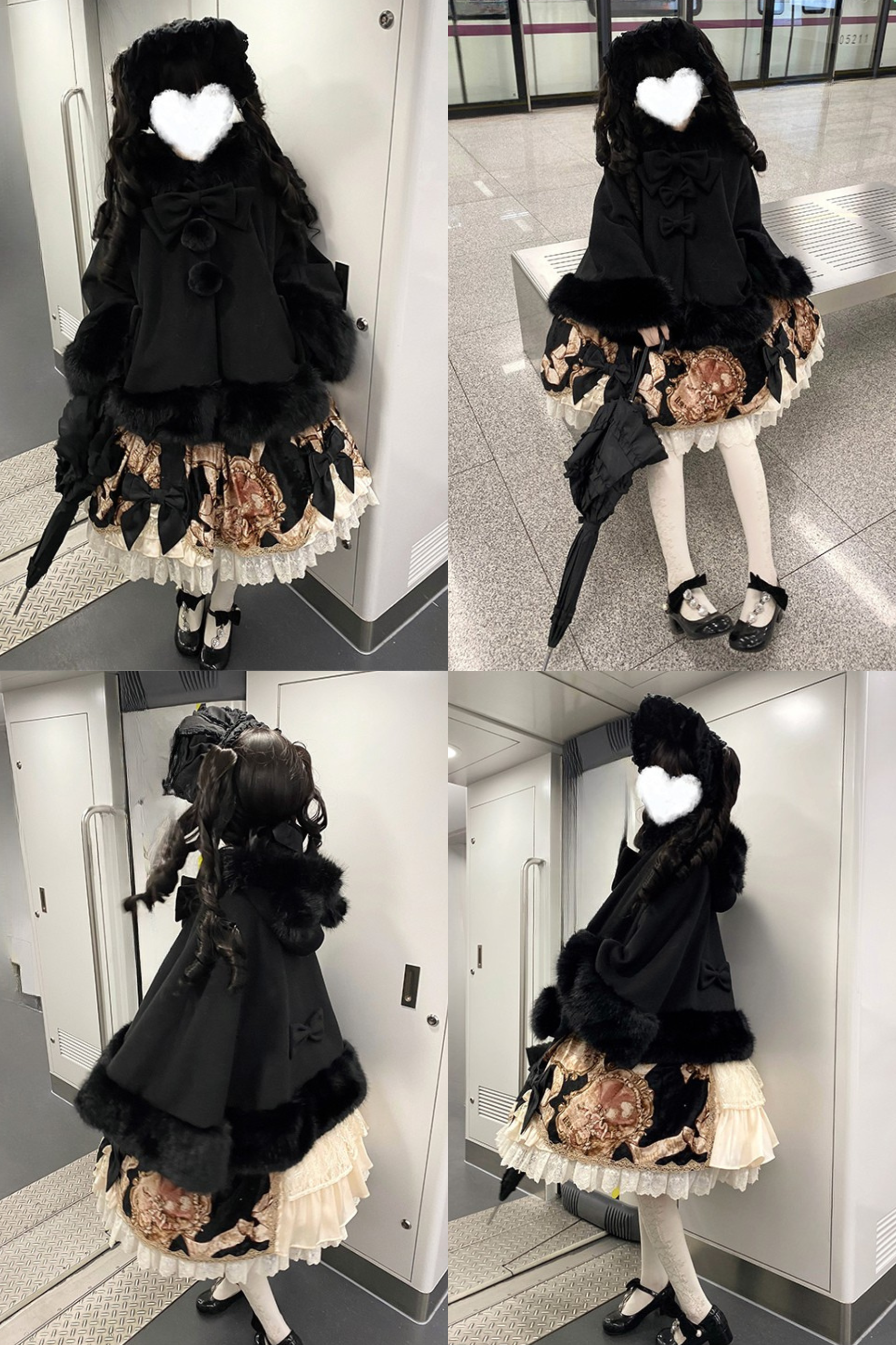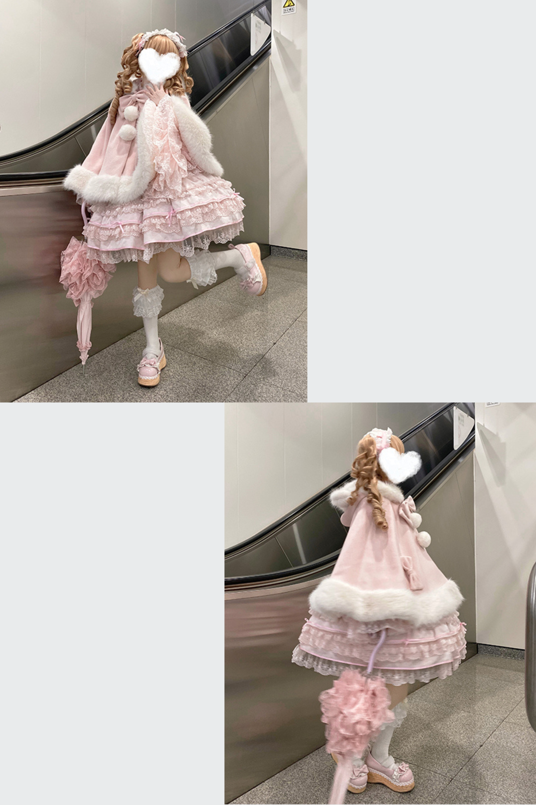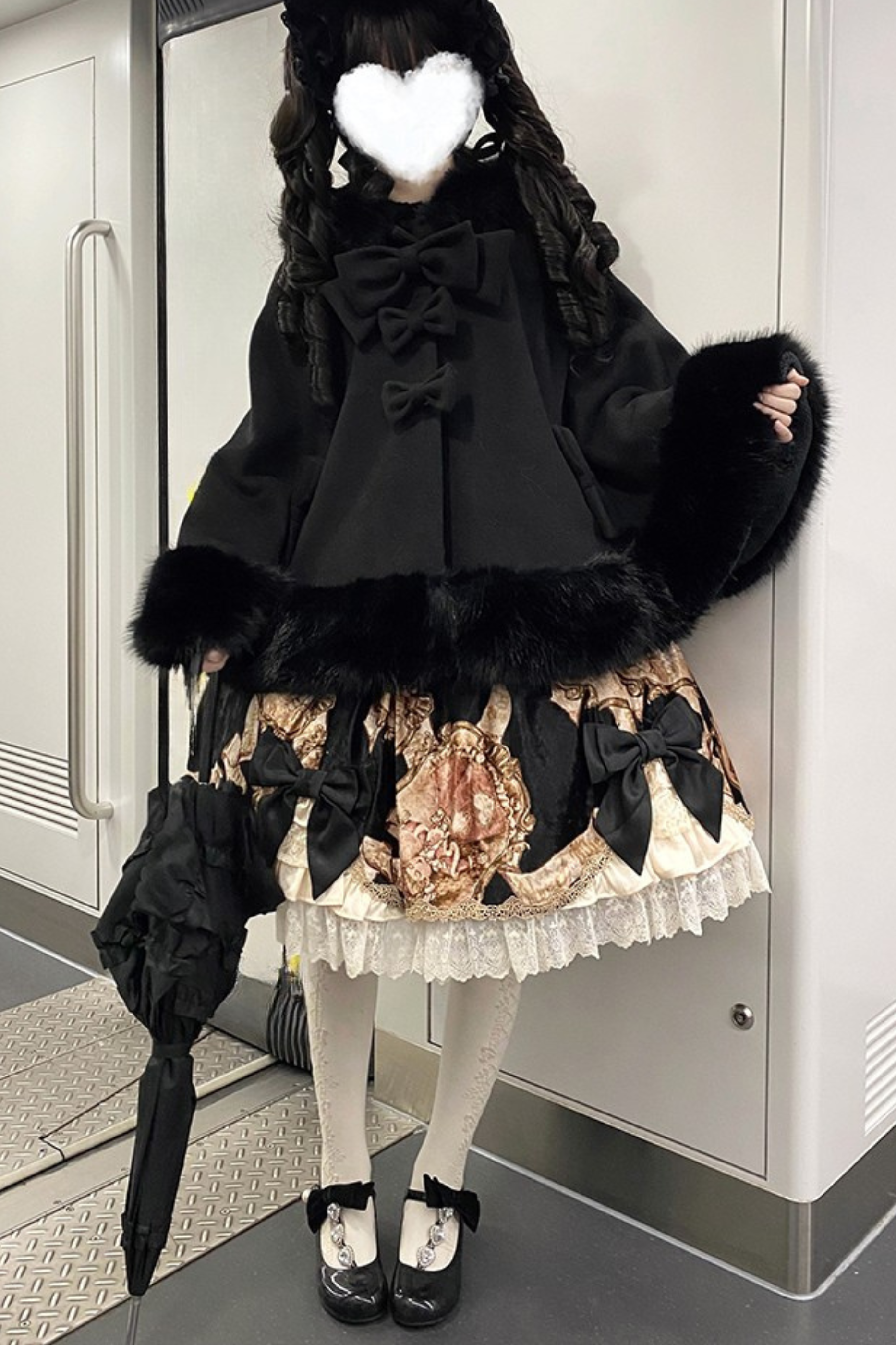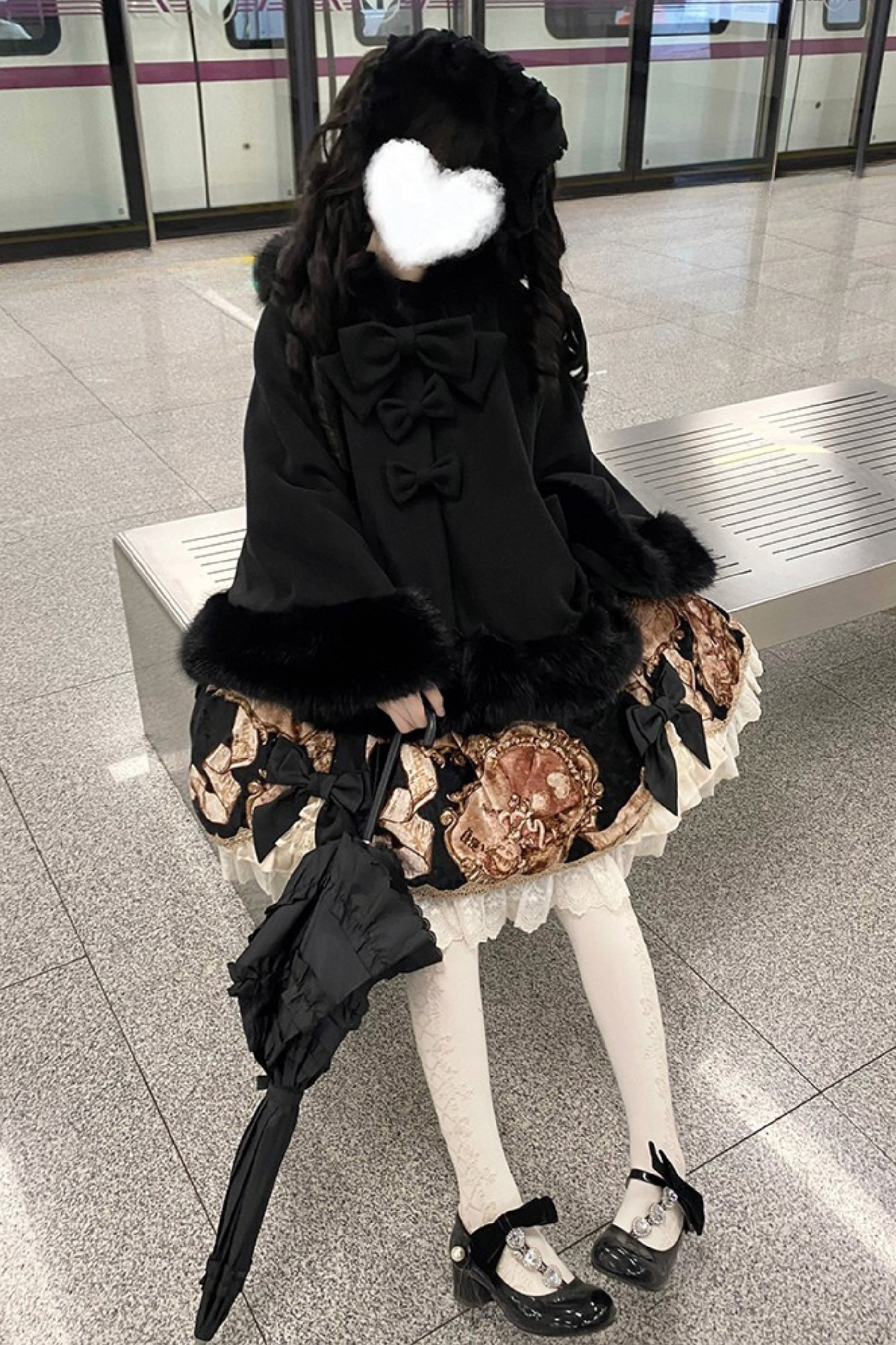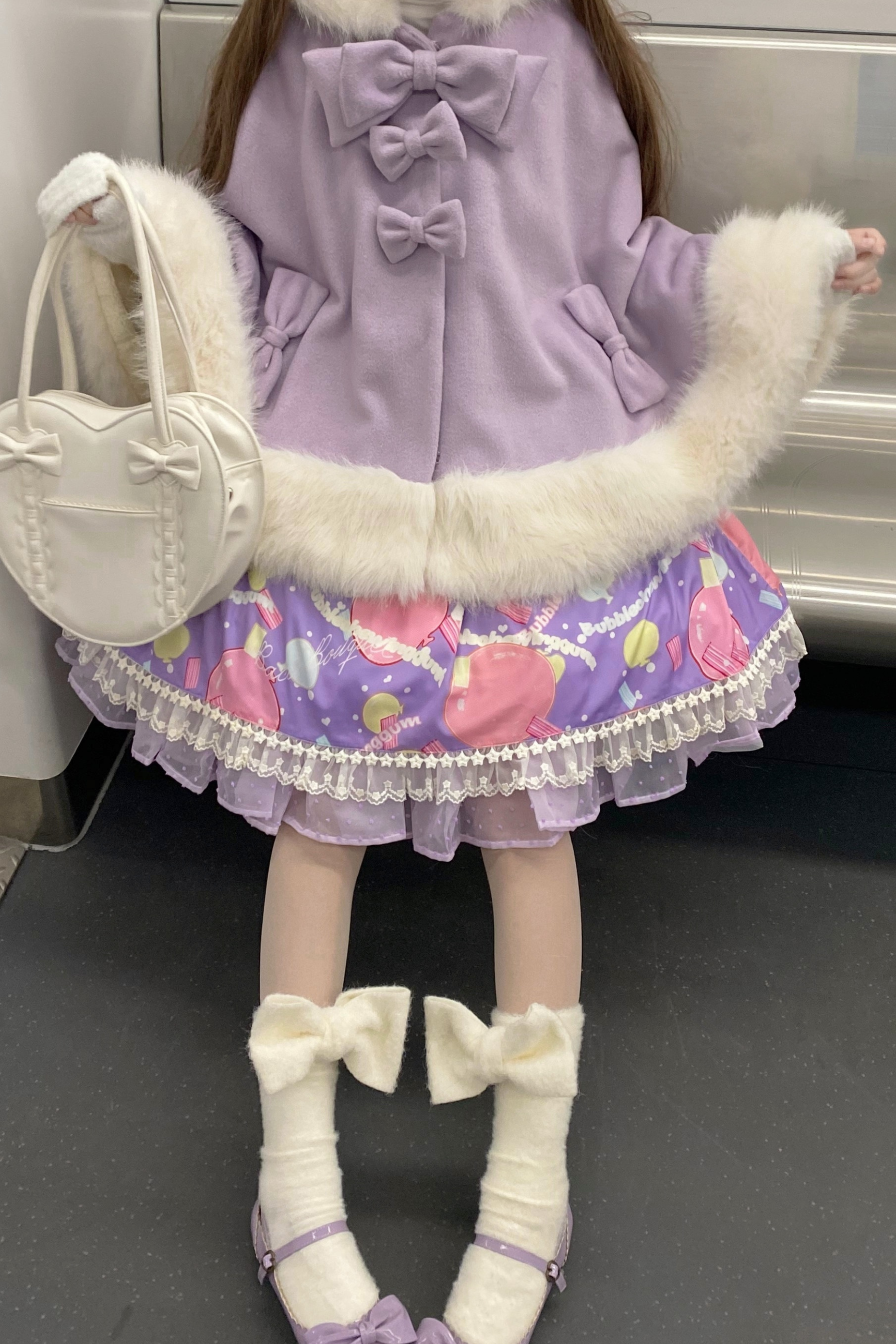 ケープコートには胸元に取り外し可能な大きなリボンとファーボール2個が付いています