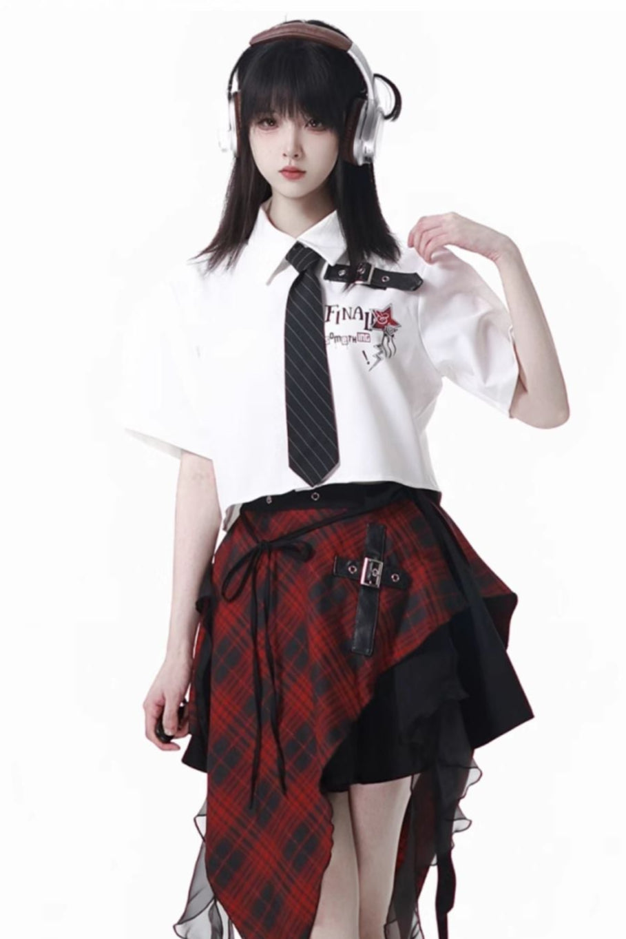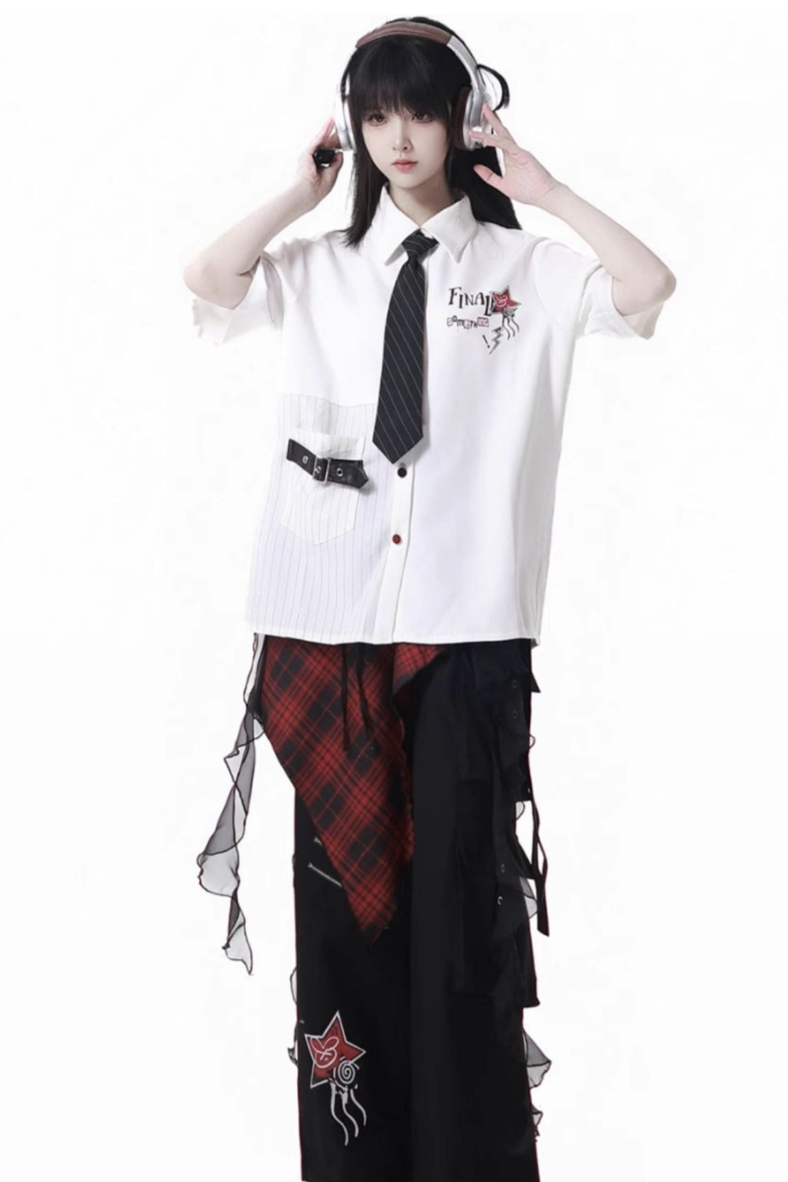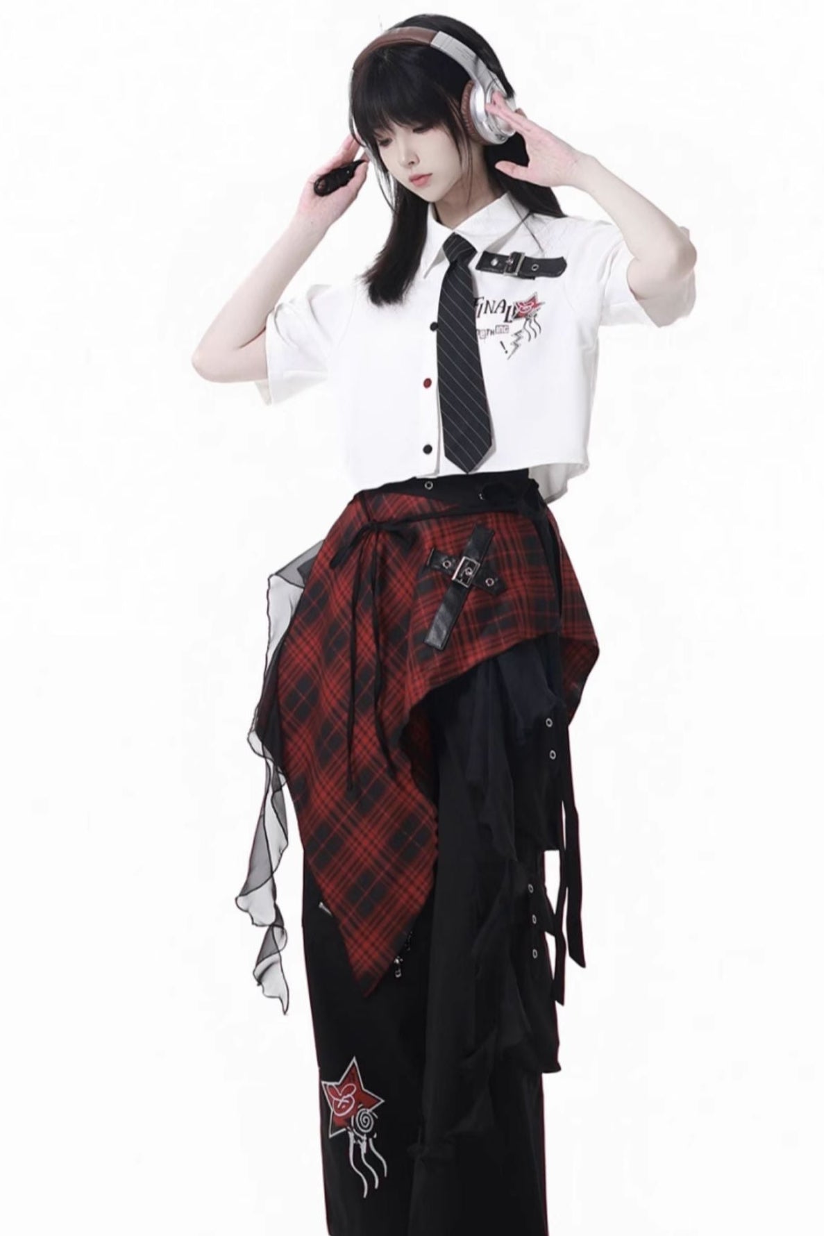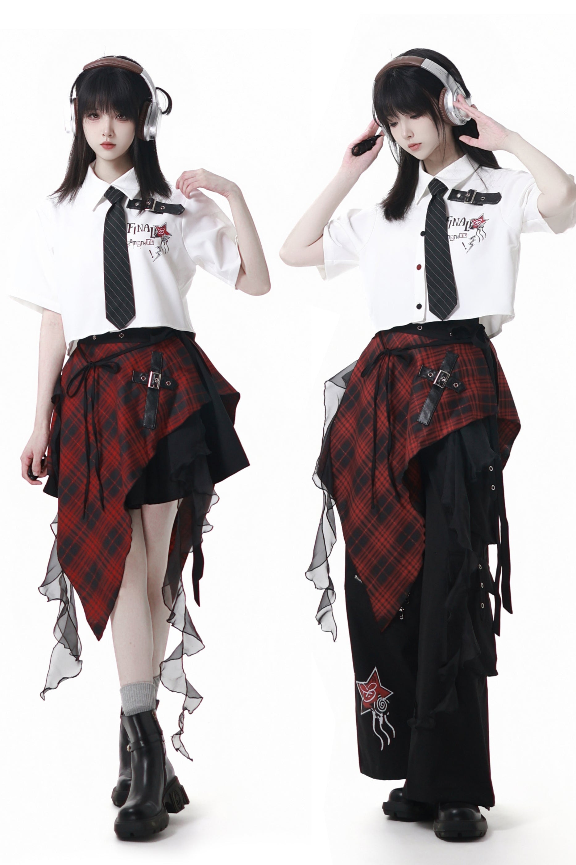 コントラストシャツ+チェックスカート+ブラックスカート+ワイドパンツ+ネクタイ