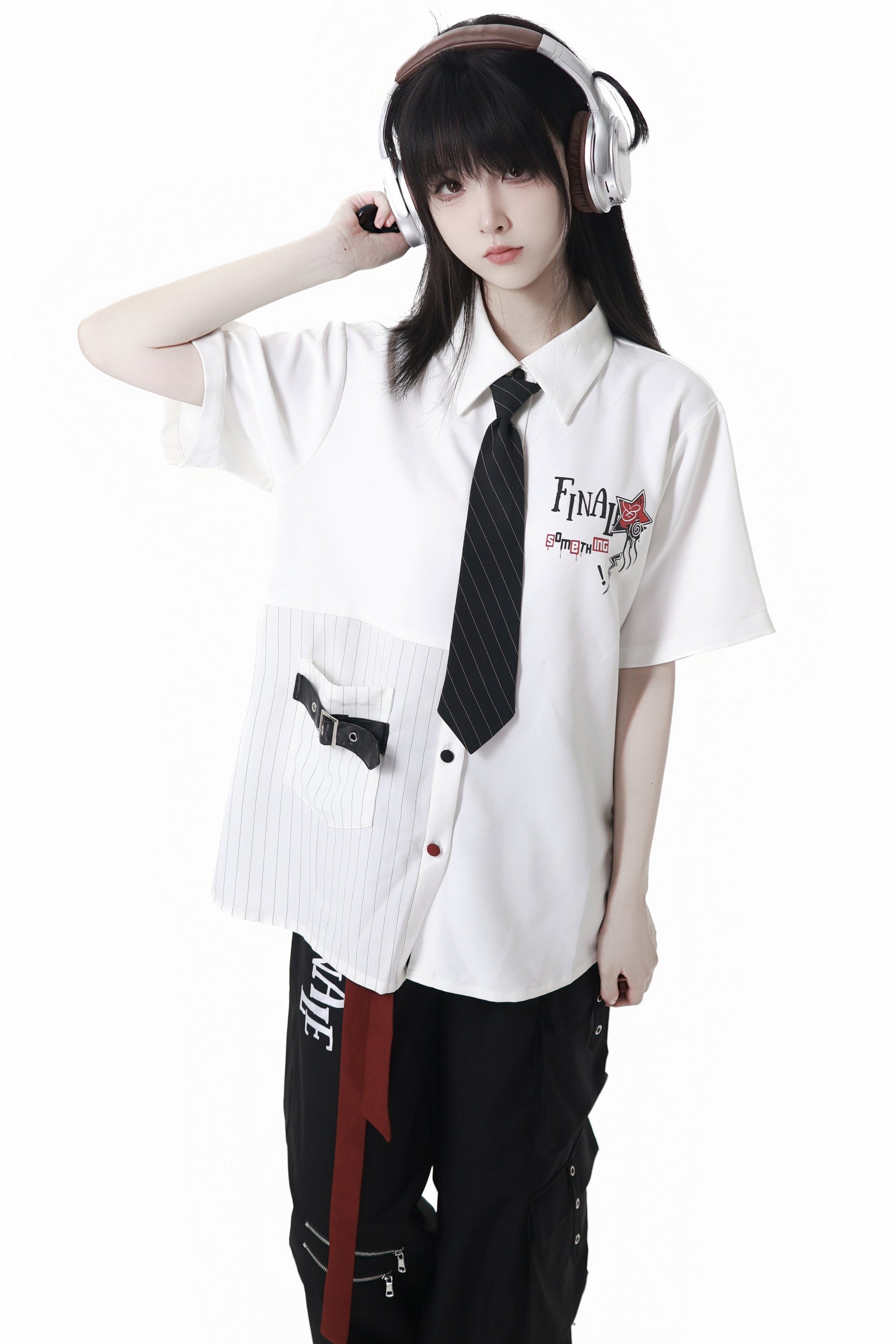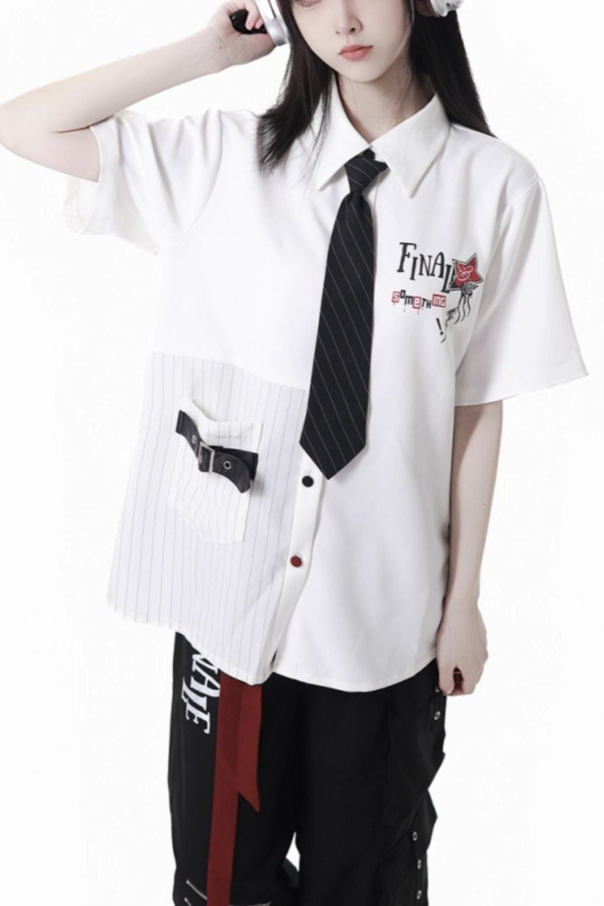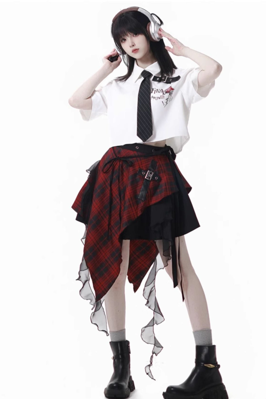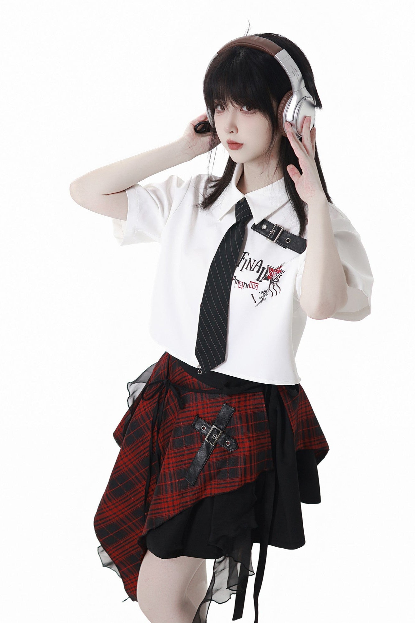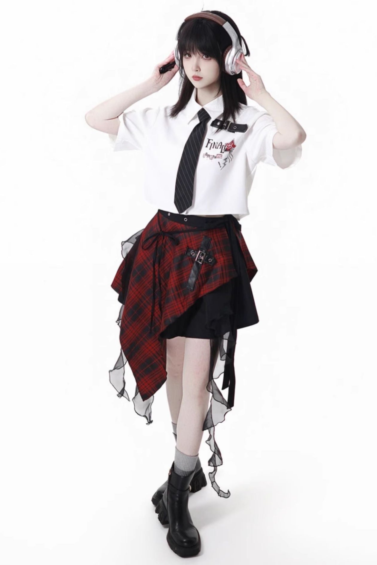 コントラストシャツ+チェックスカート+ブラックスカート+ワイドパンツ+ネクタイ