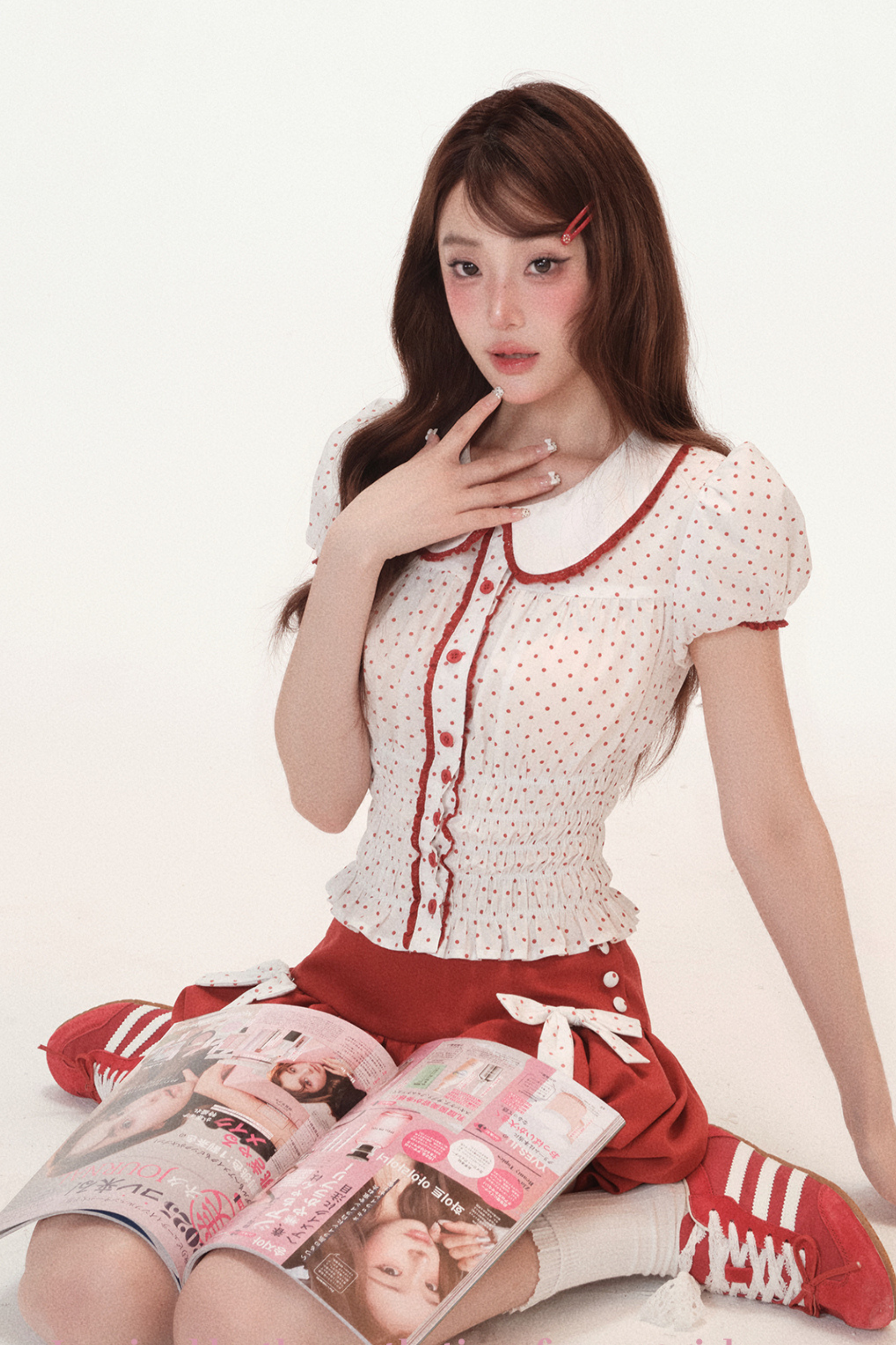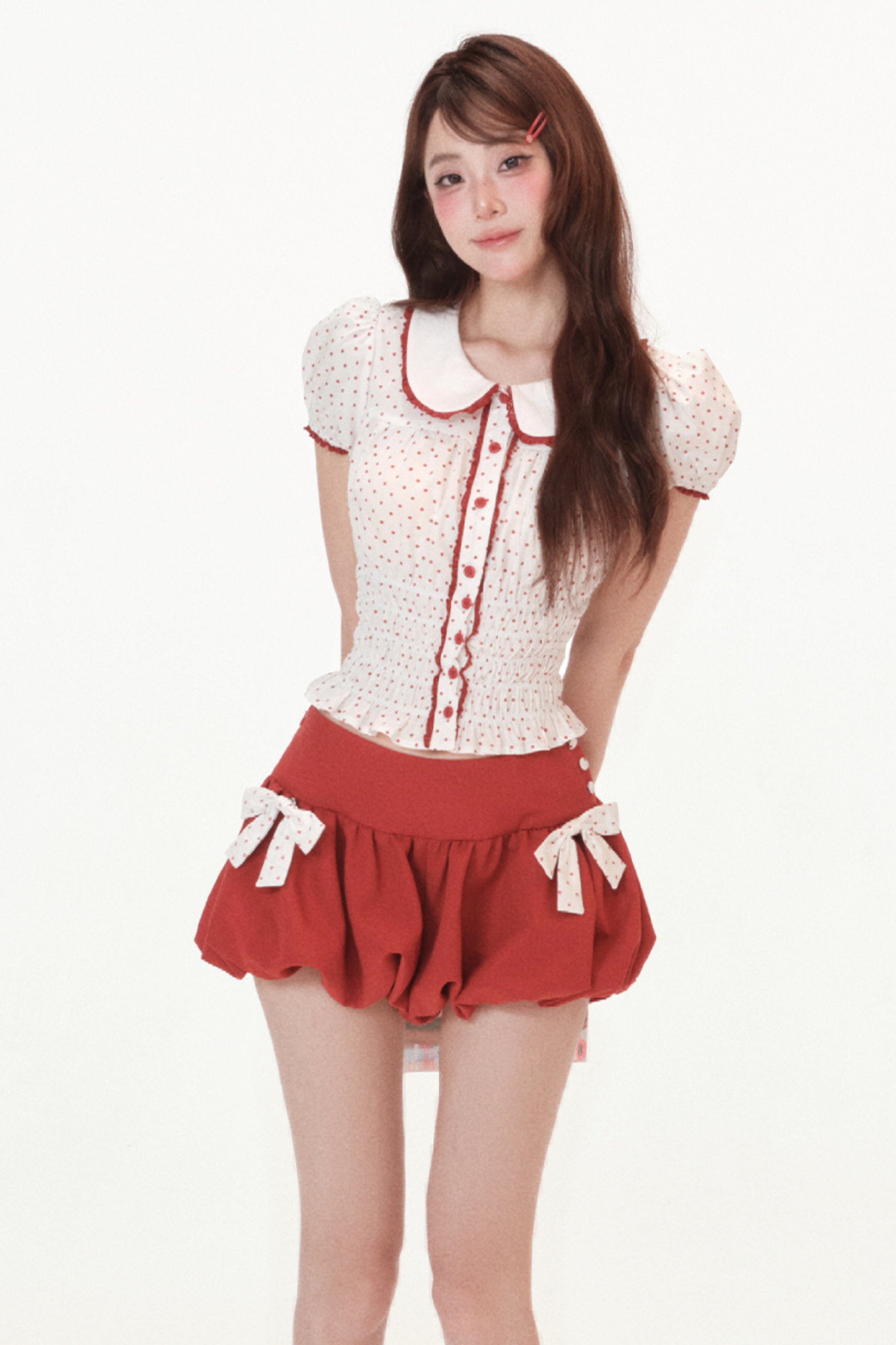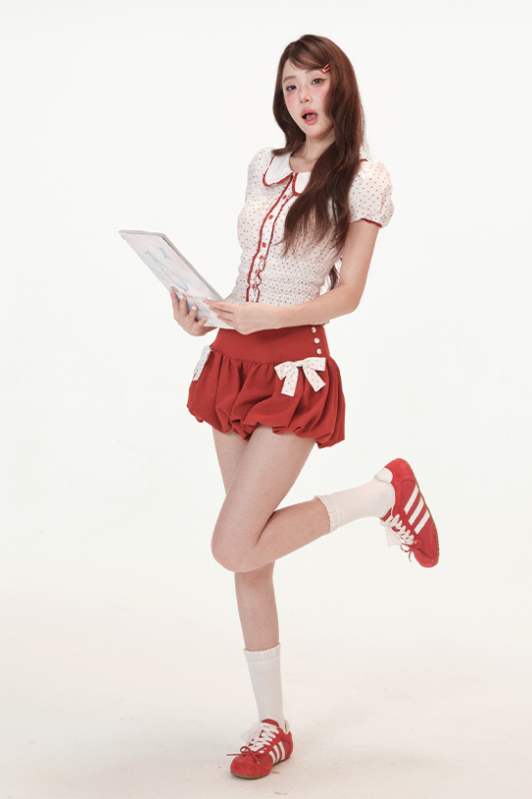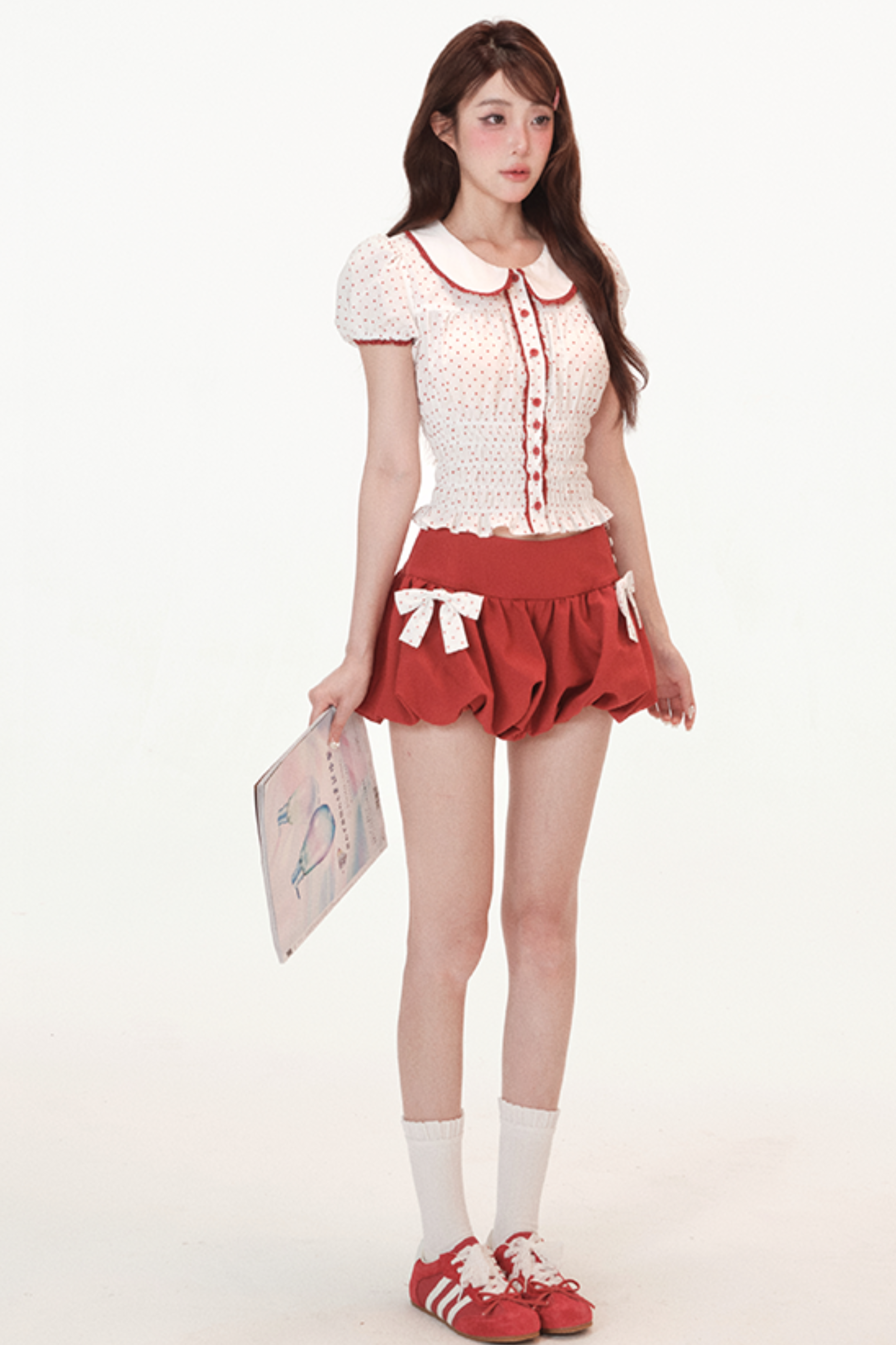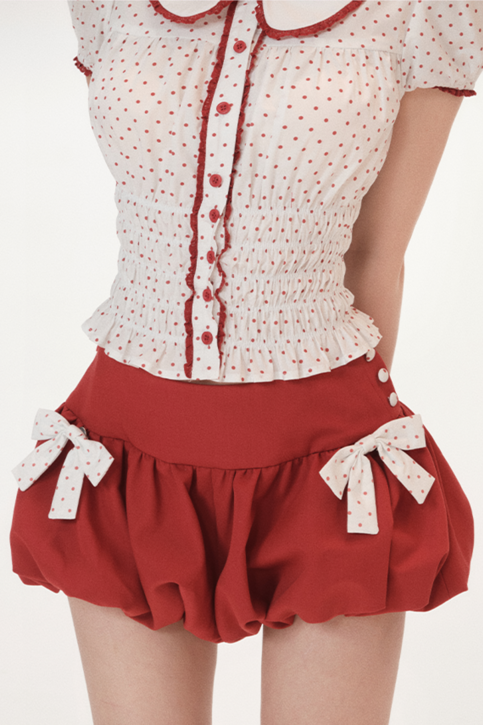 ドットパフスリーブドールシャツ+リボンバルーンスカートパンツ