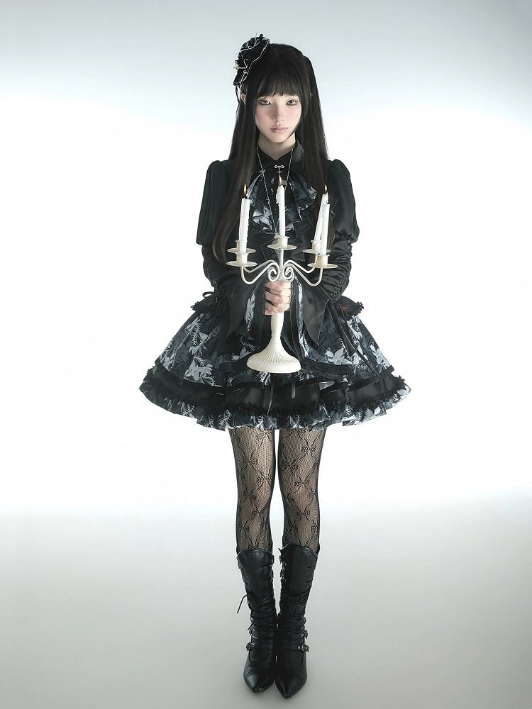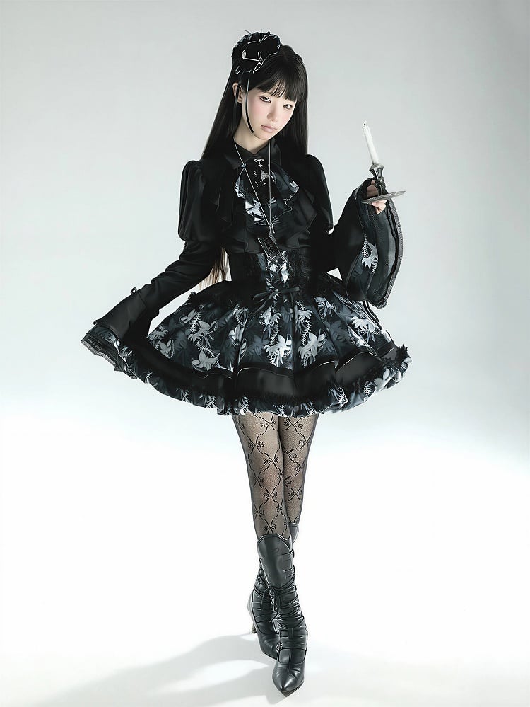 [Précommande jusqu'au 13 mai] Chemise à volants noire à fleurs gothique Bone Iris + jupe corset + accessoires