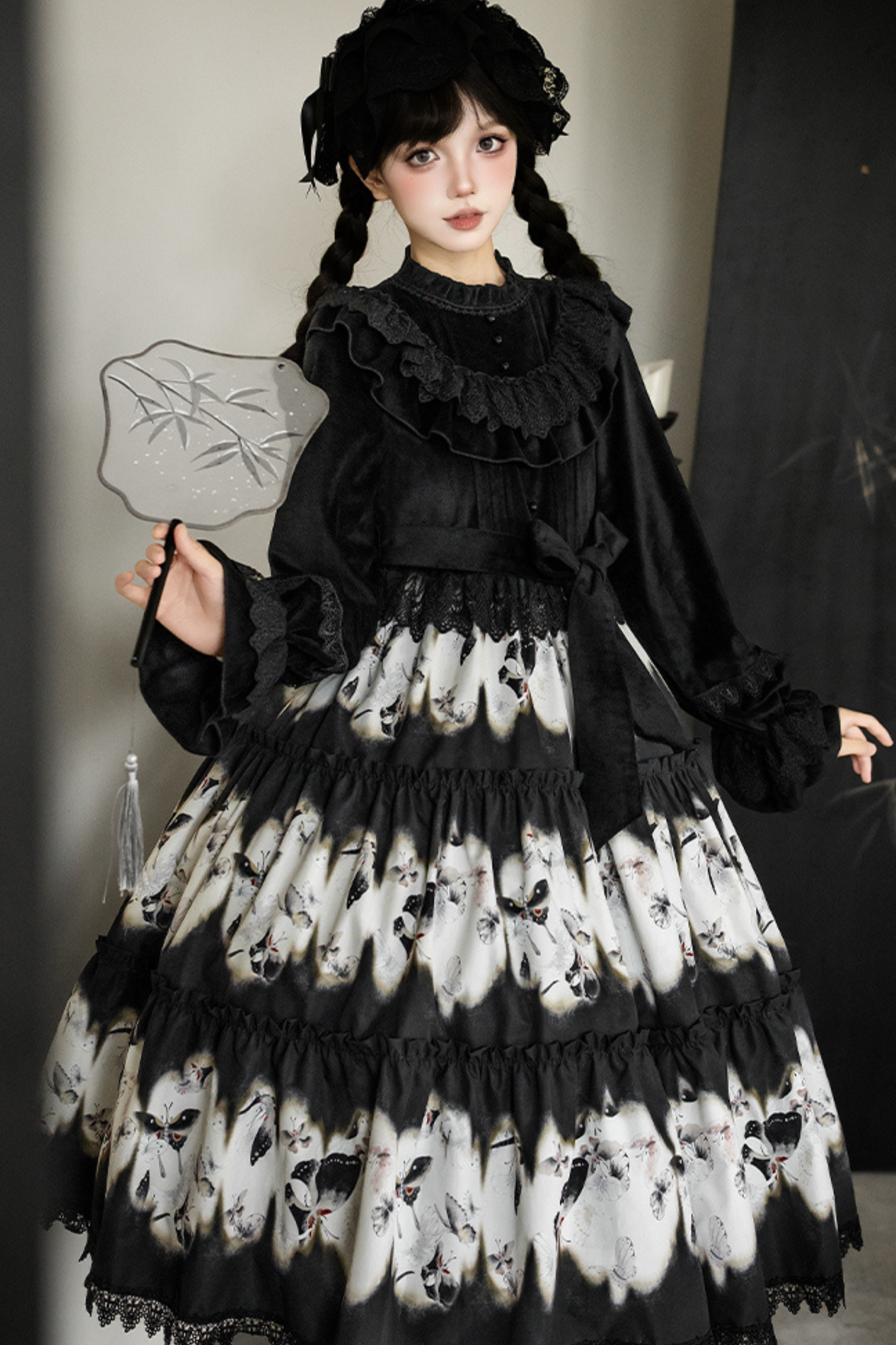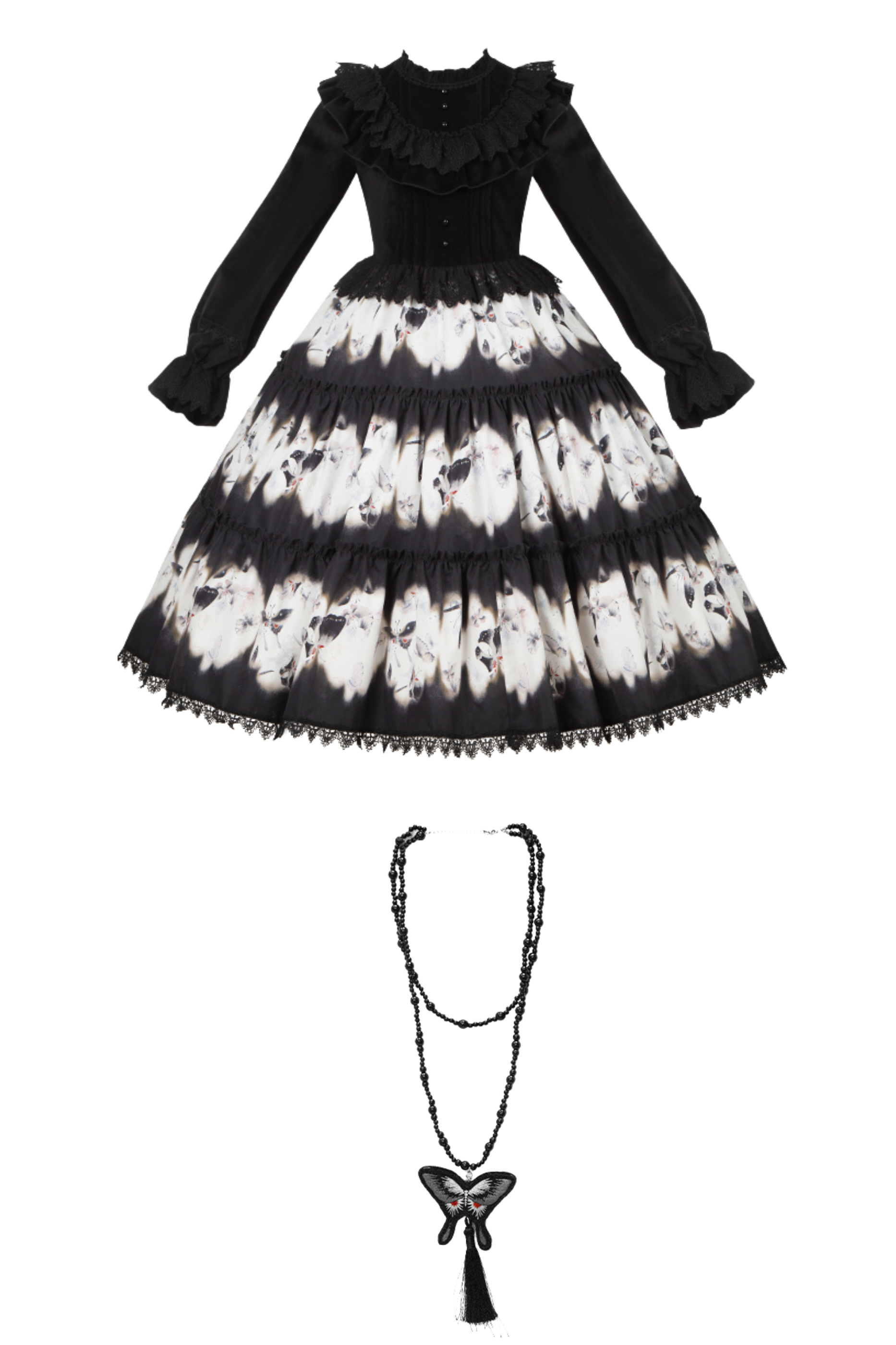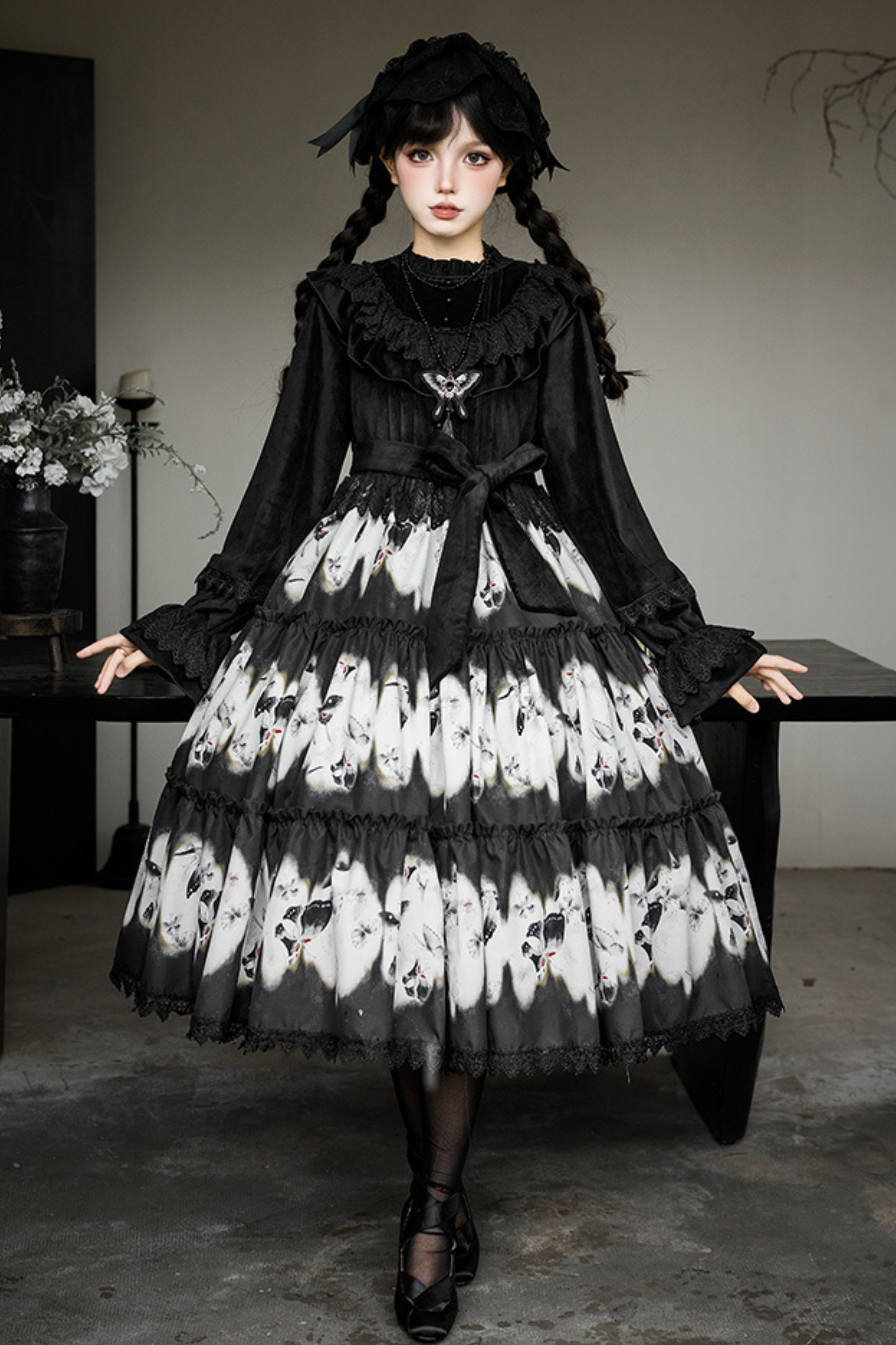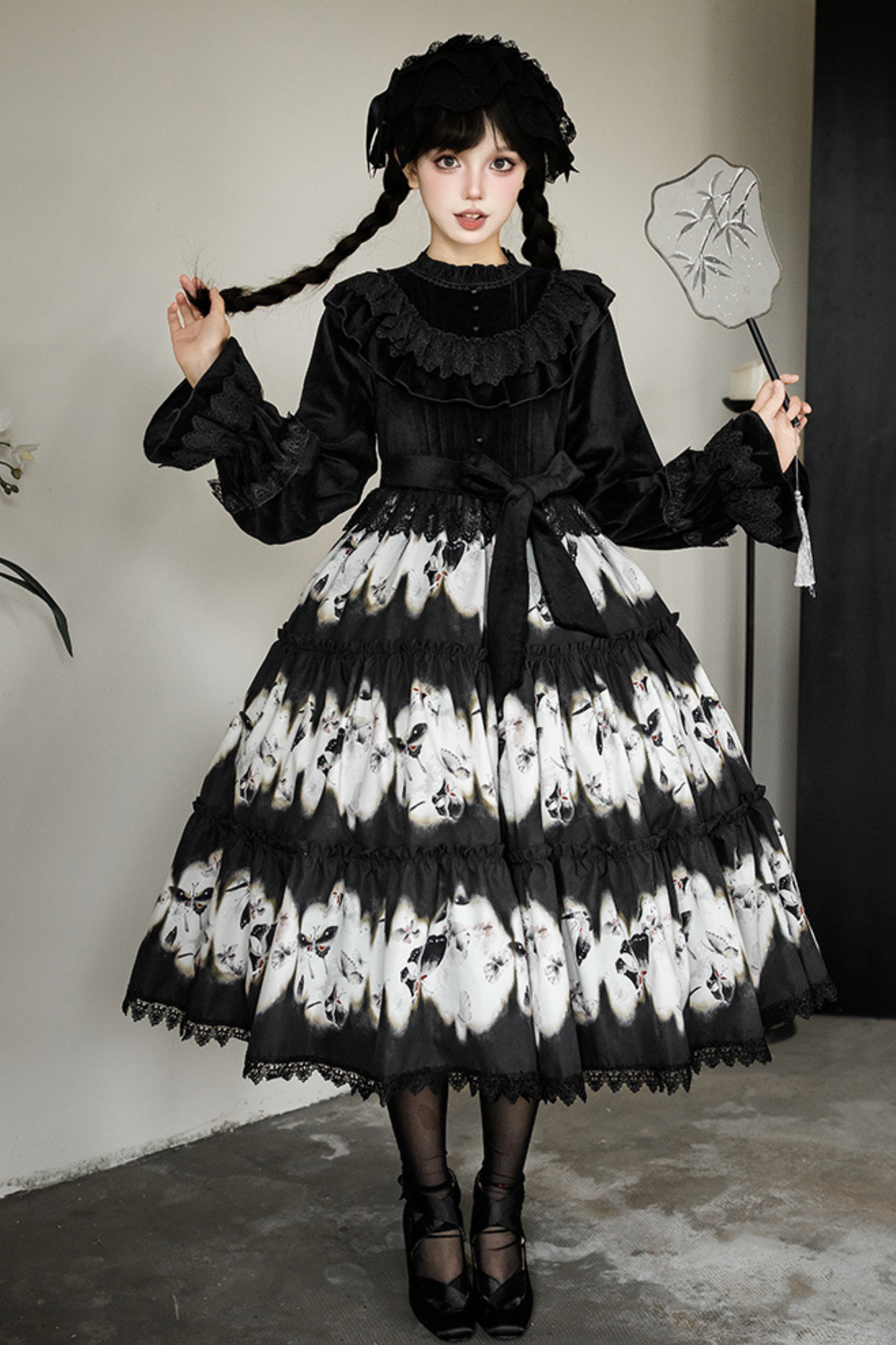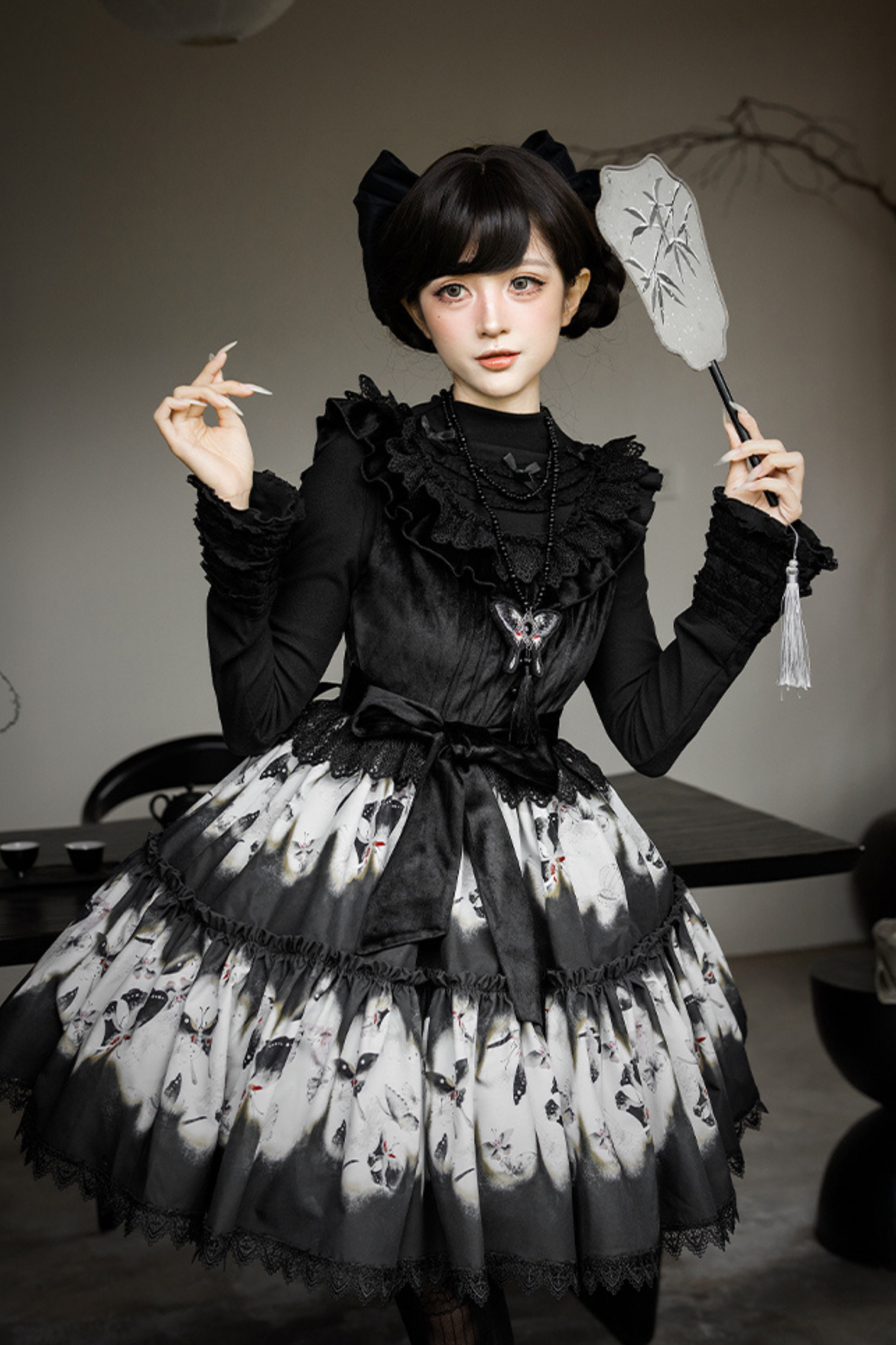 シックバタフライプリントスイングロリータドレス+ジャンパースカート+ヘアバンド+インナー+リボン