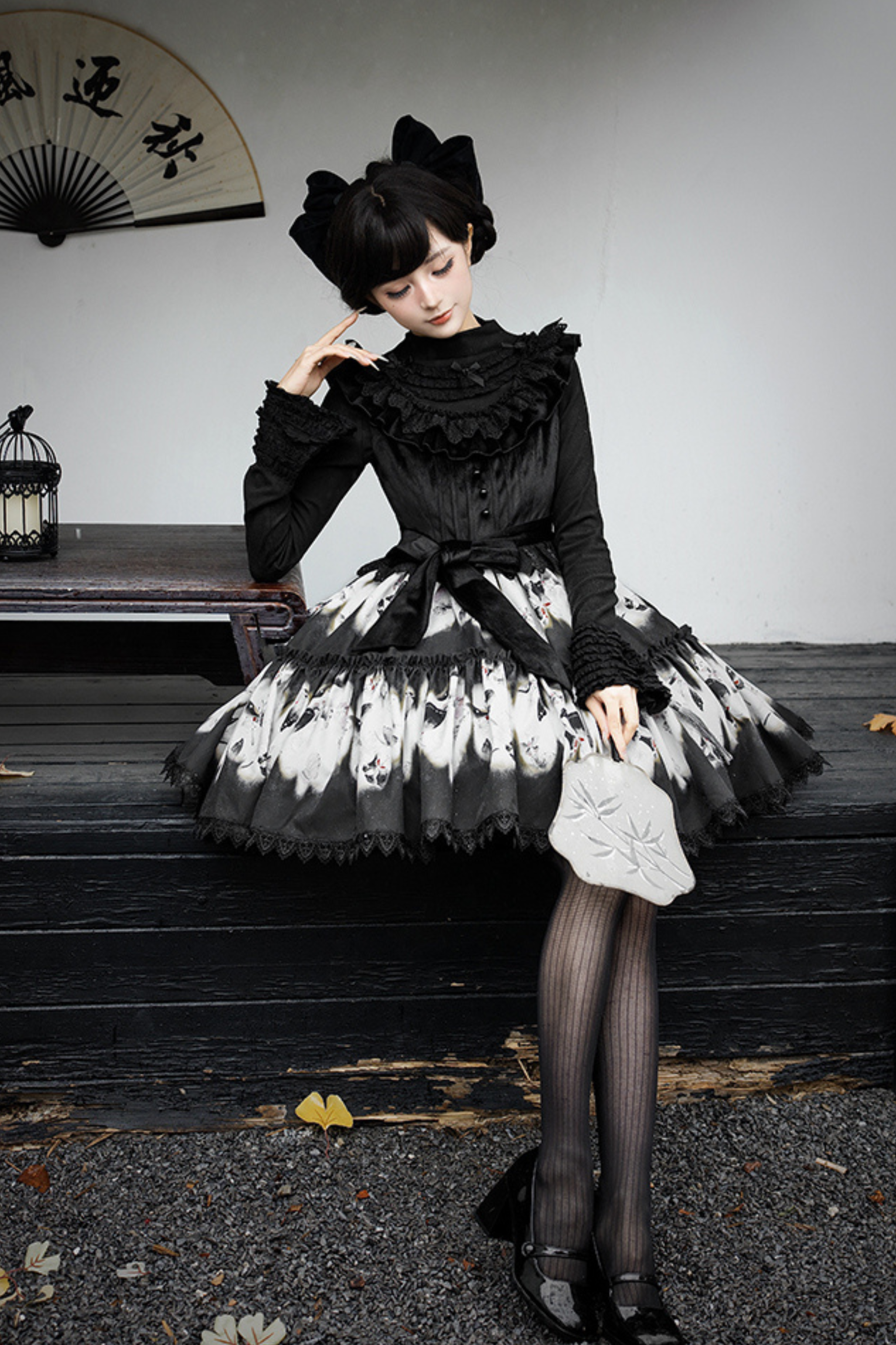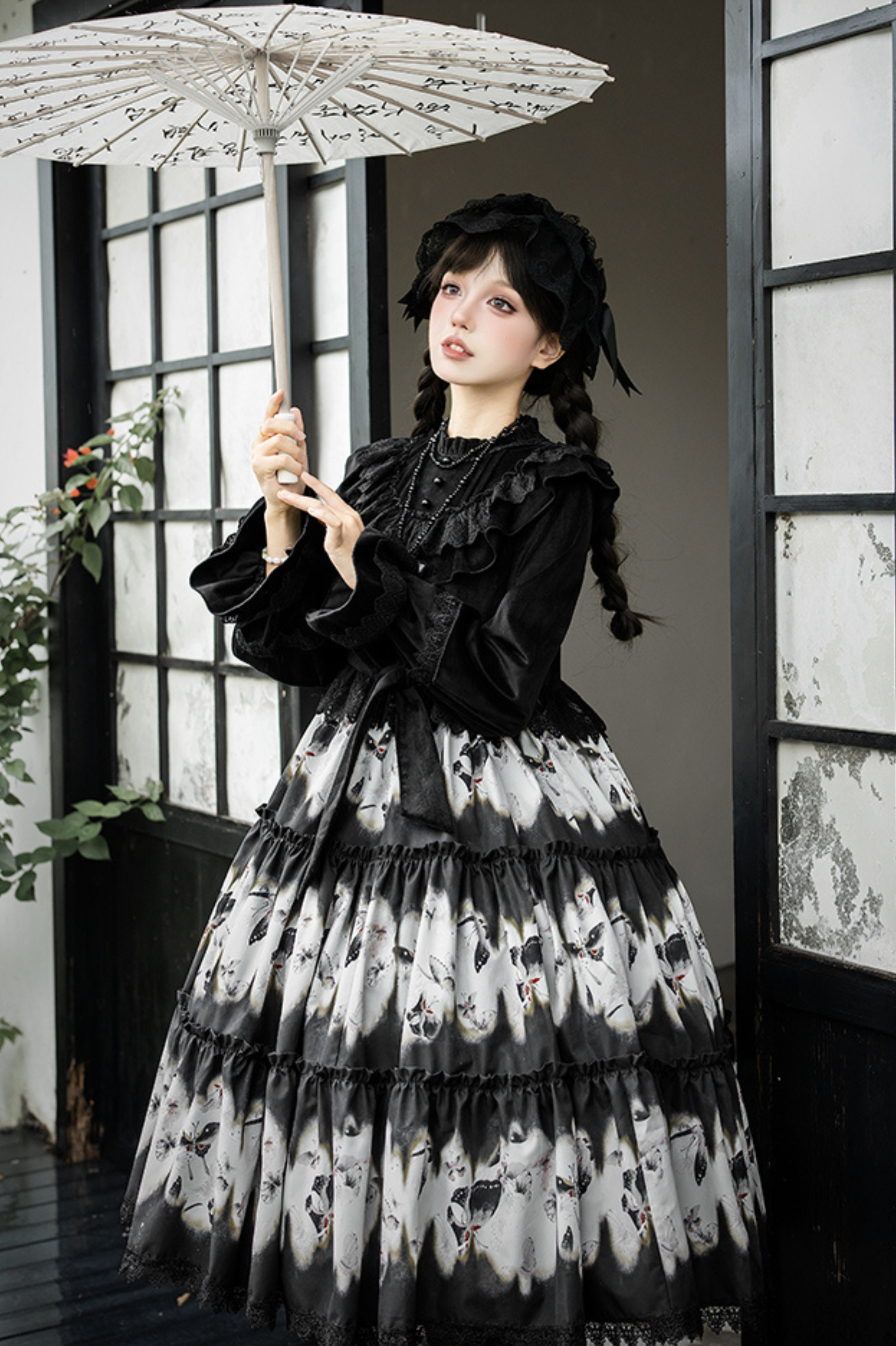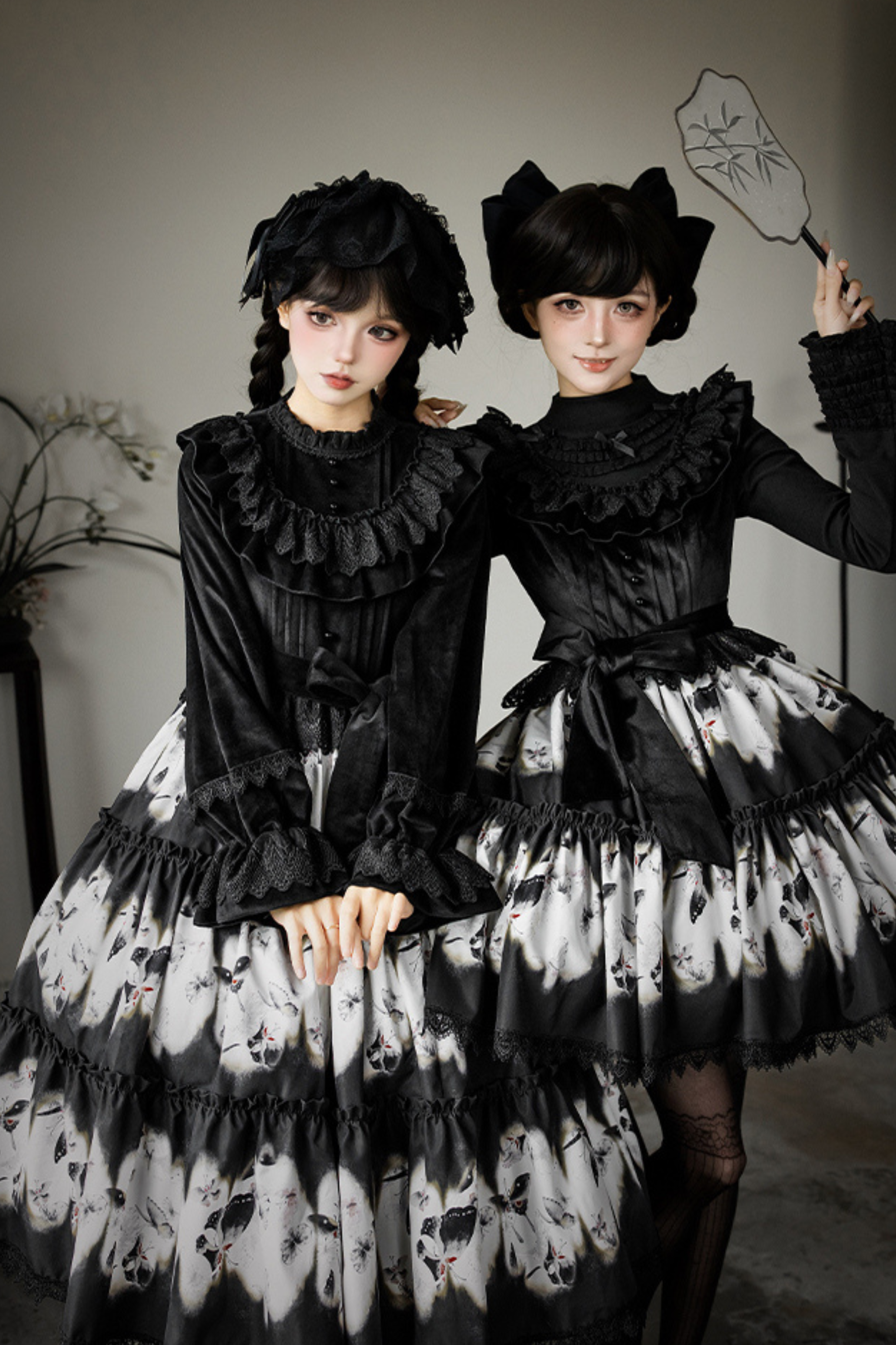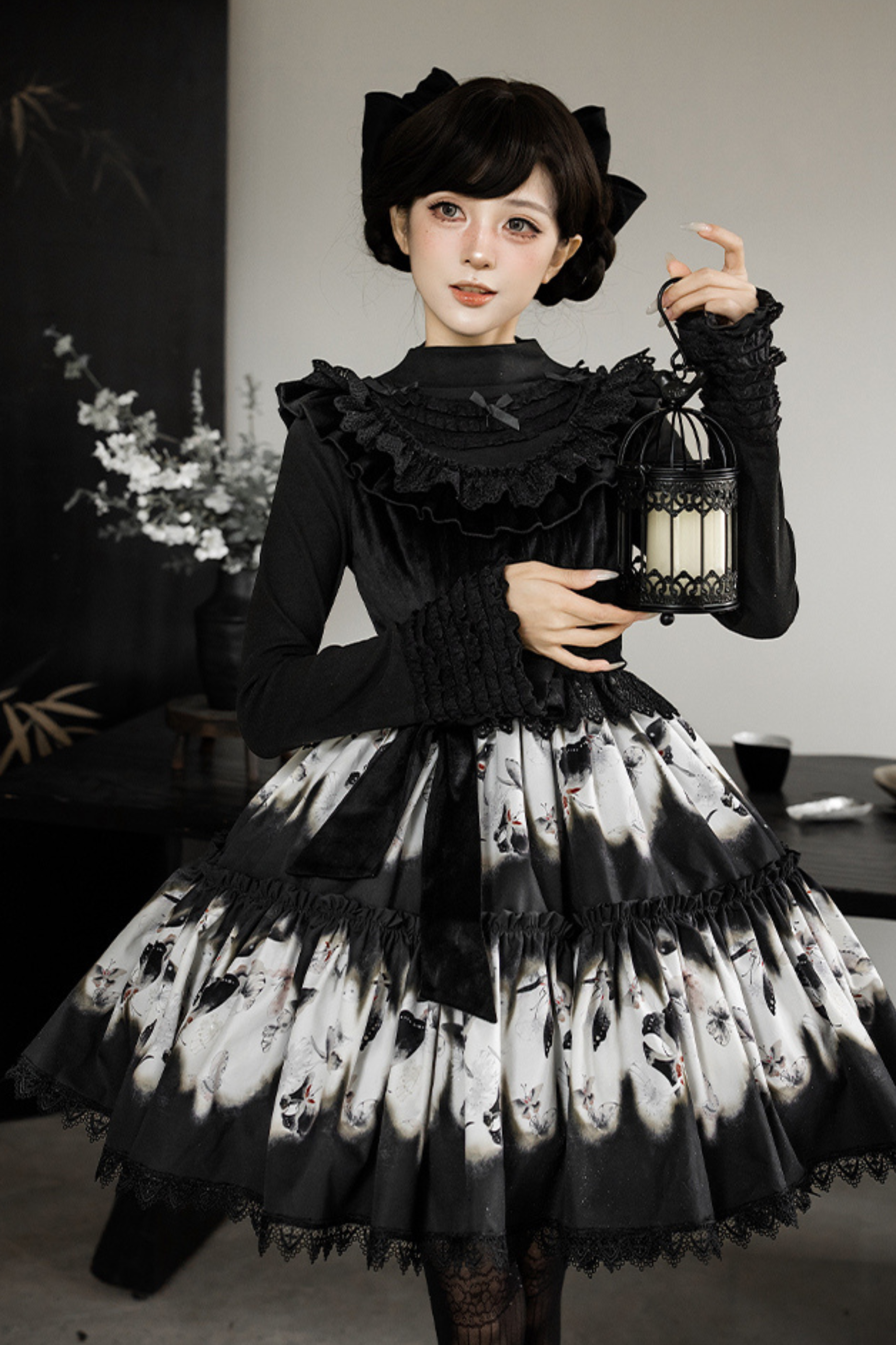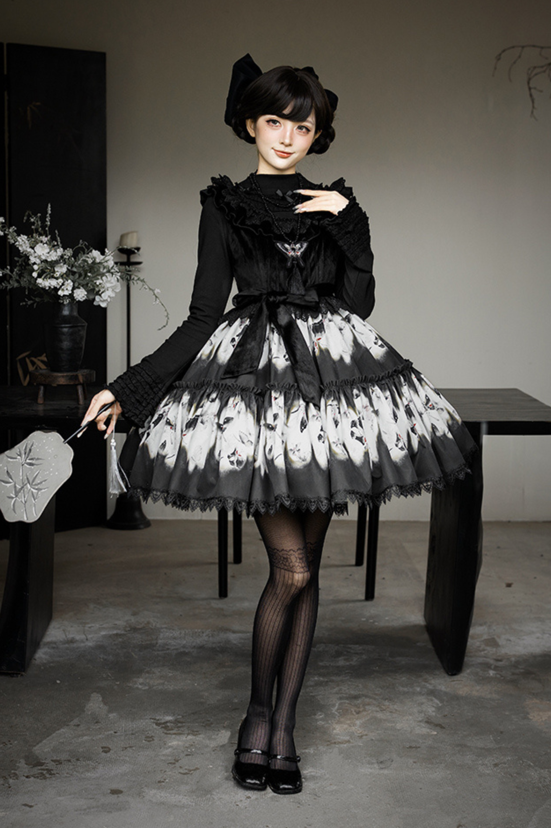 シックバタフライプリントスイングロリータドレス+ジャンパースカート+ヘアバンド+インナー+リボン