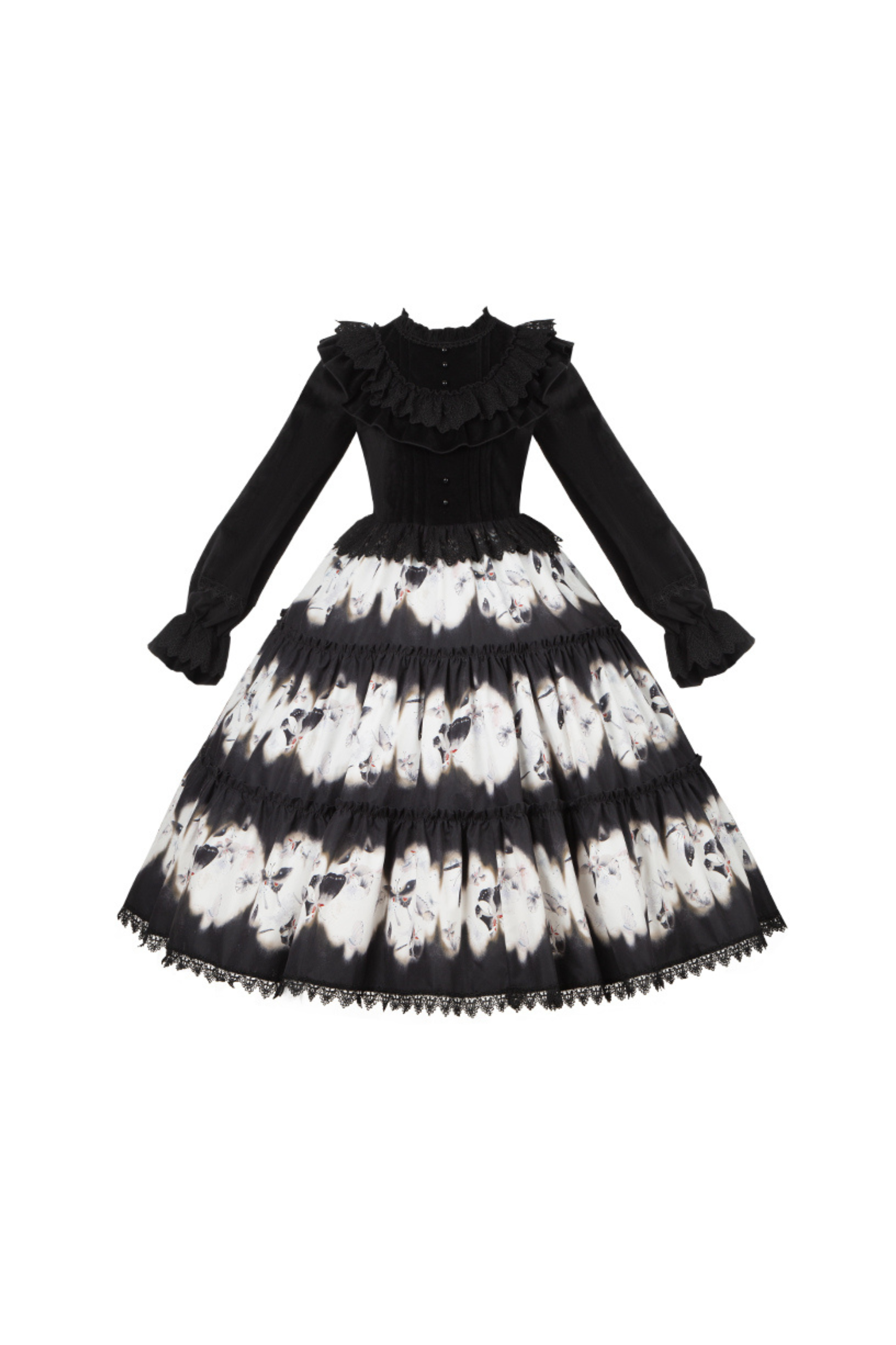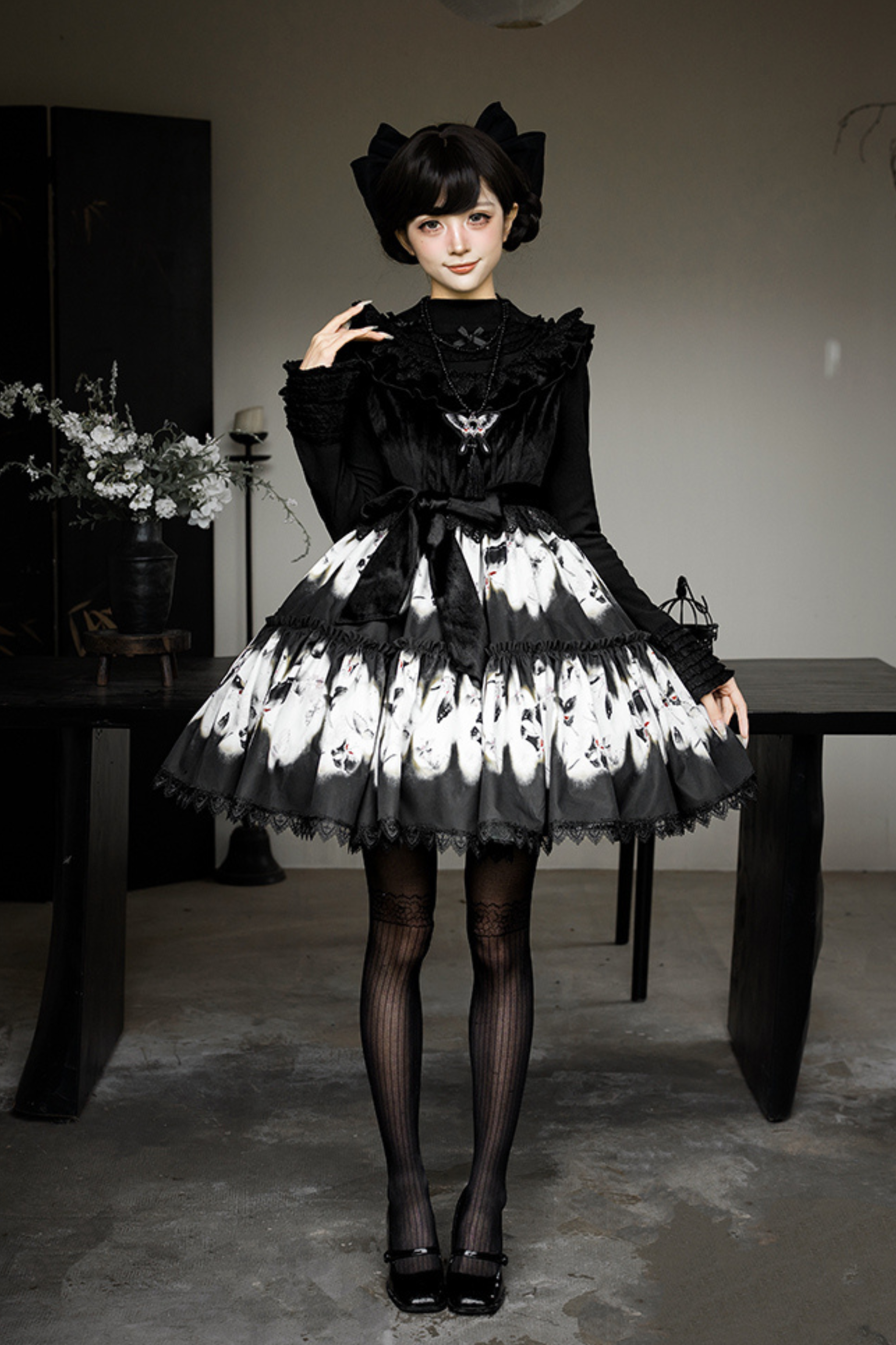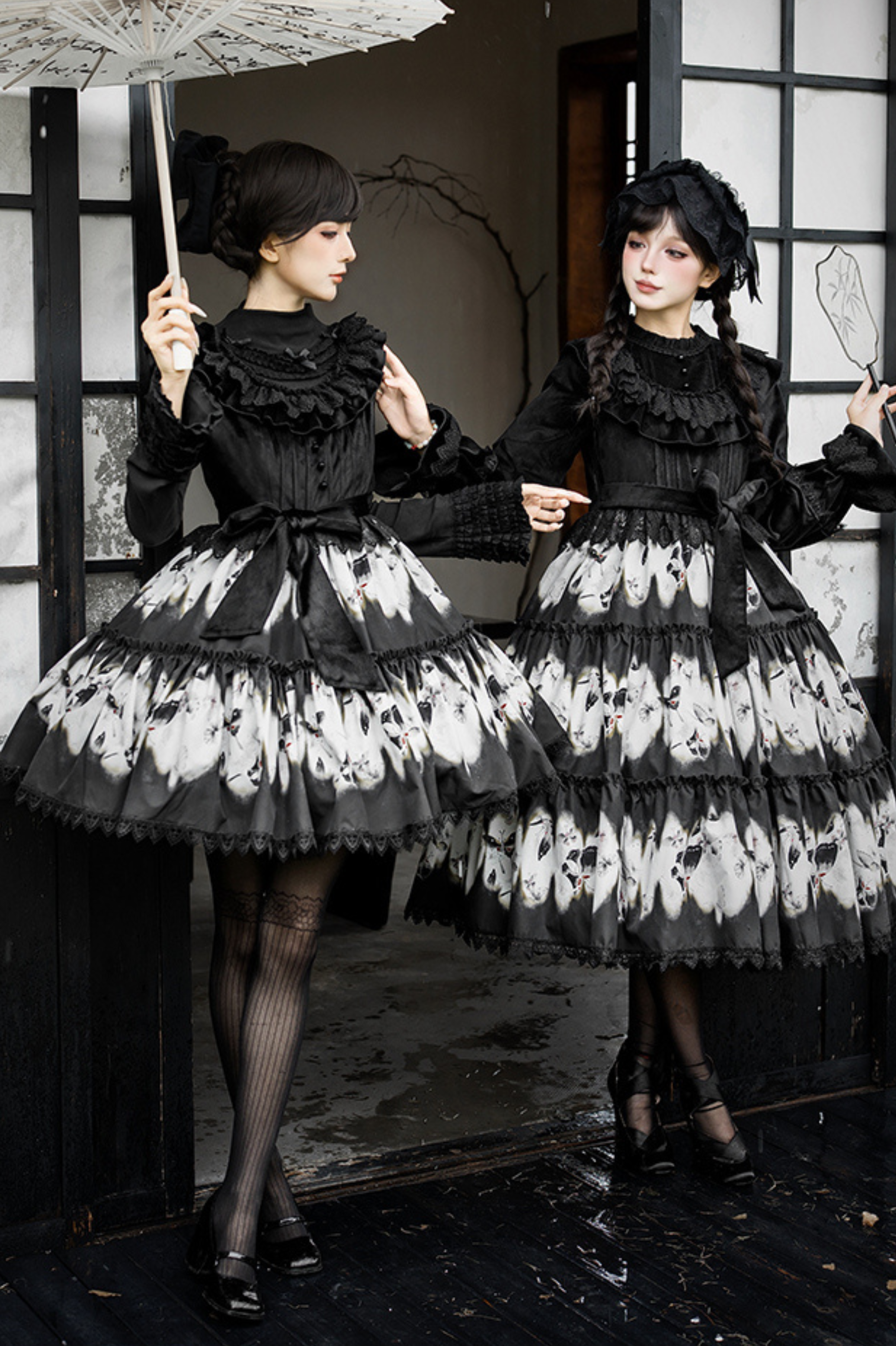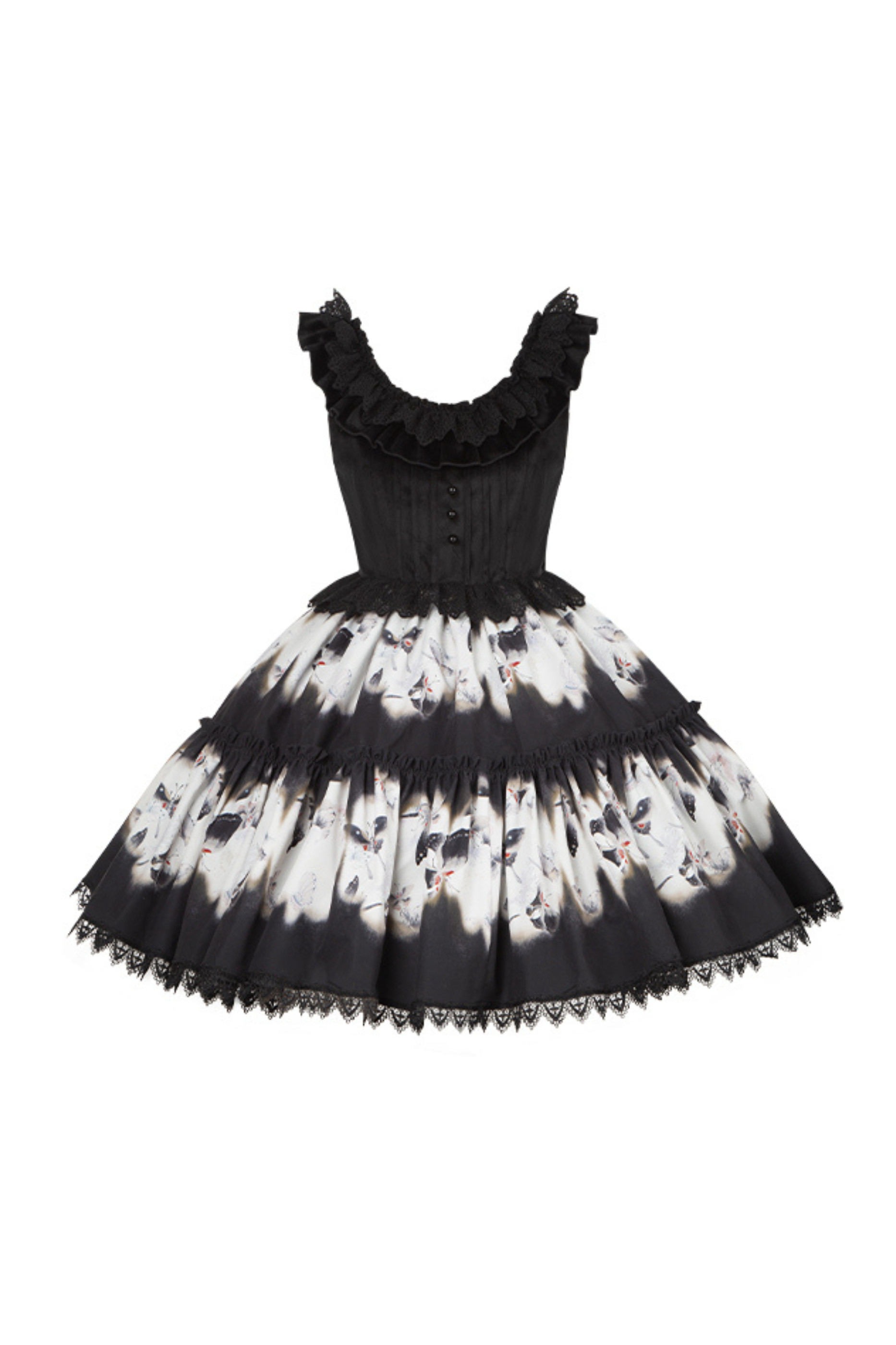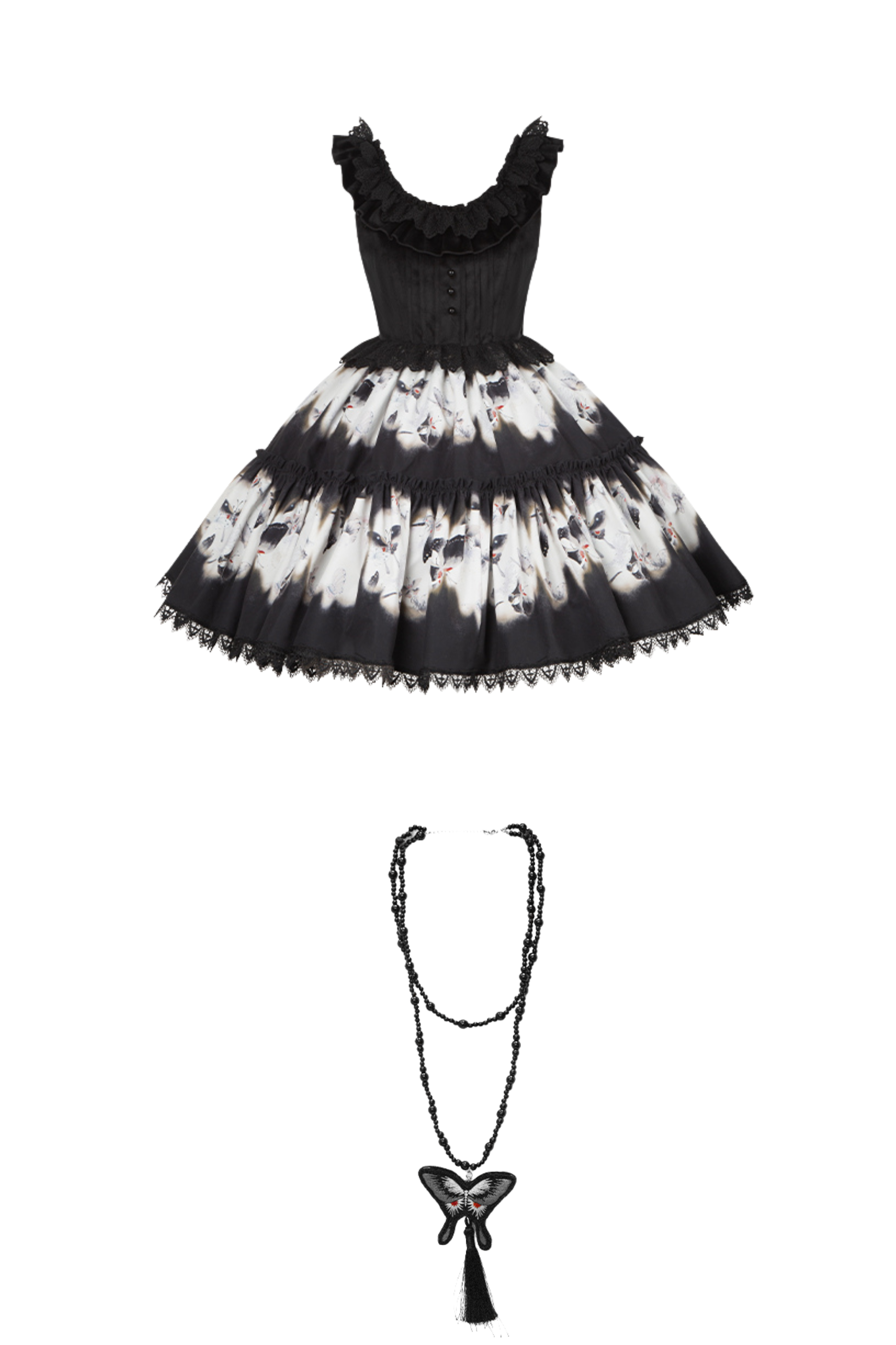 ❤シックバタフライプリントスイングロリータドレス+ジャンパースカート+ヘアバンド+インナー+リボン❤