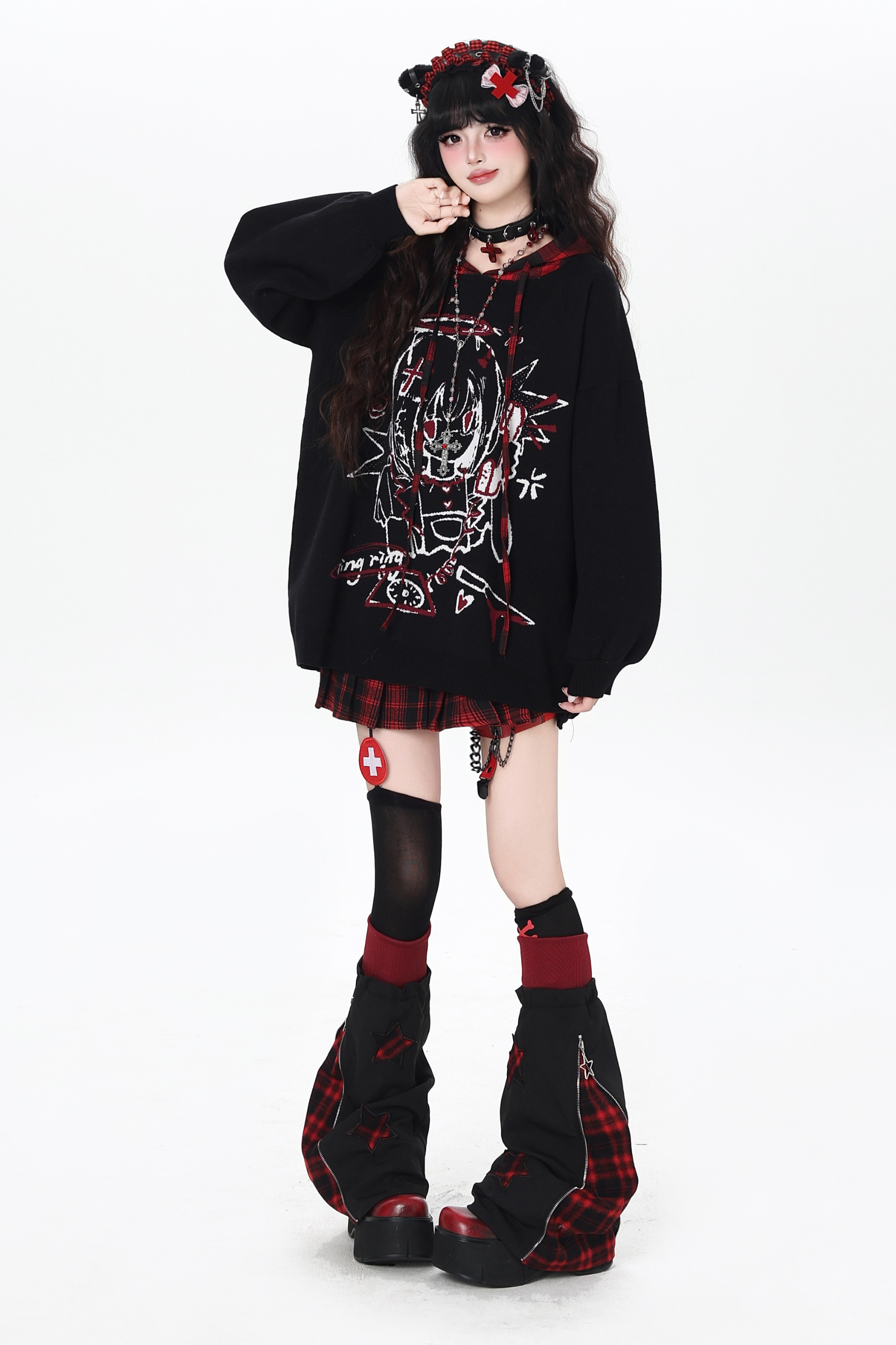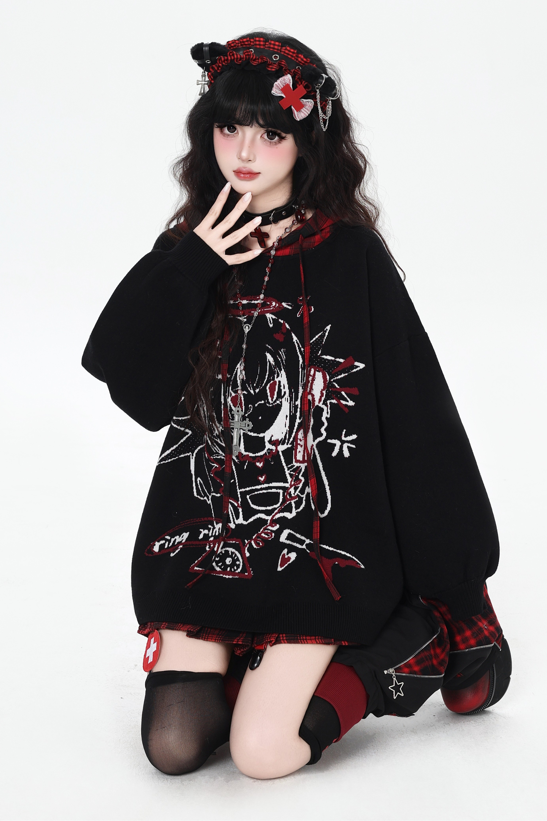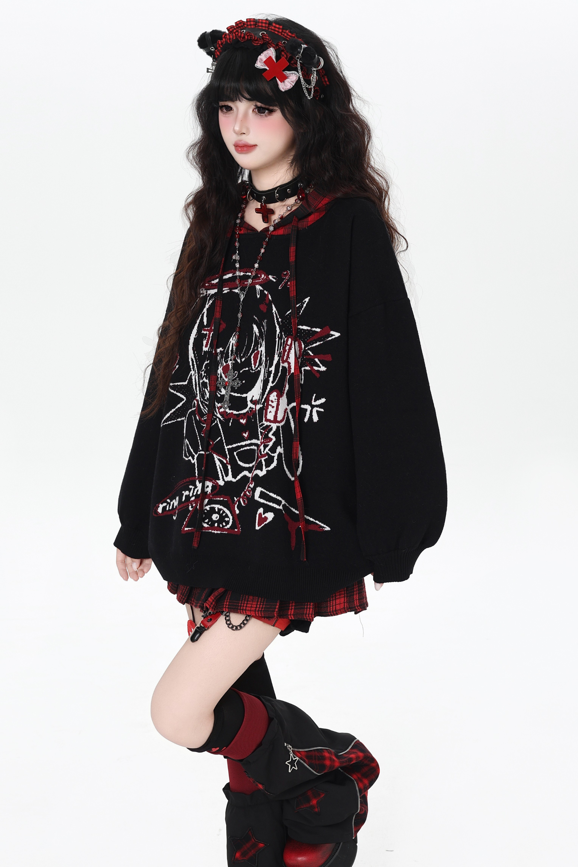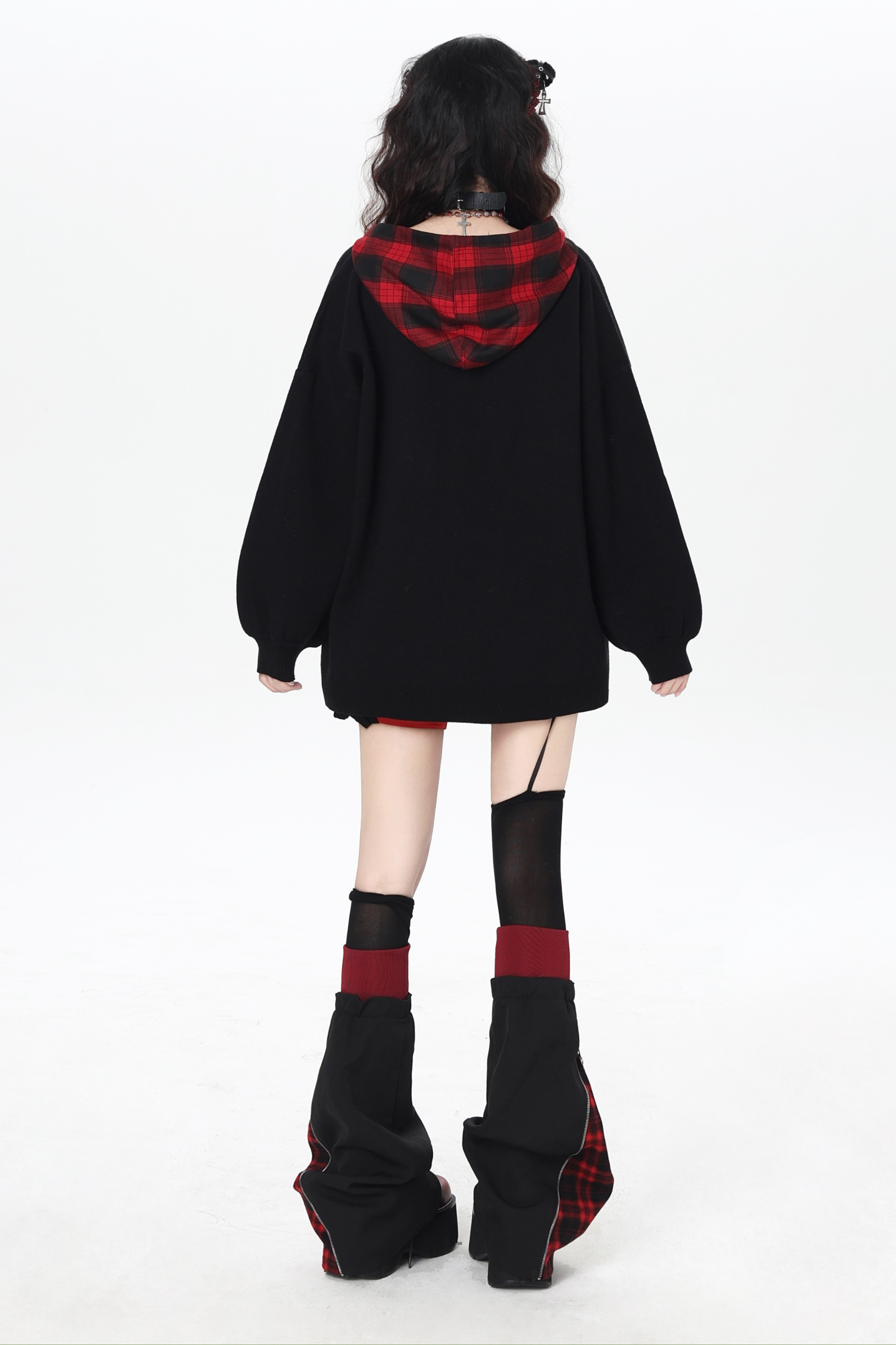 パンクガールチェックフードルーズセーター