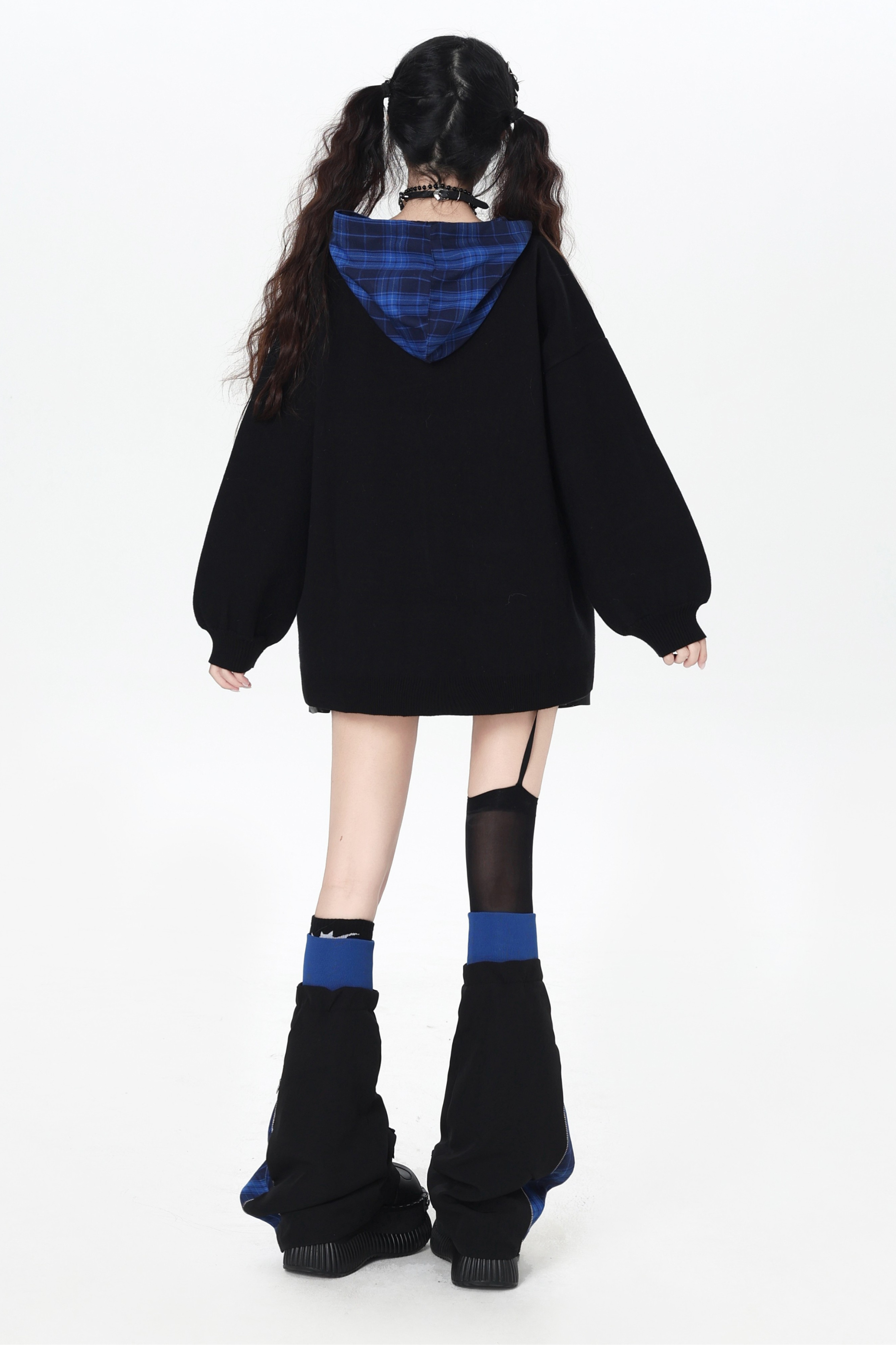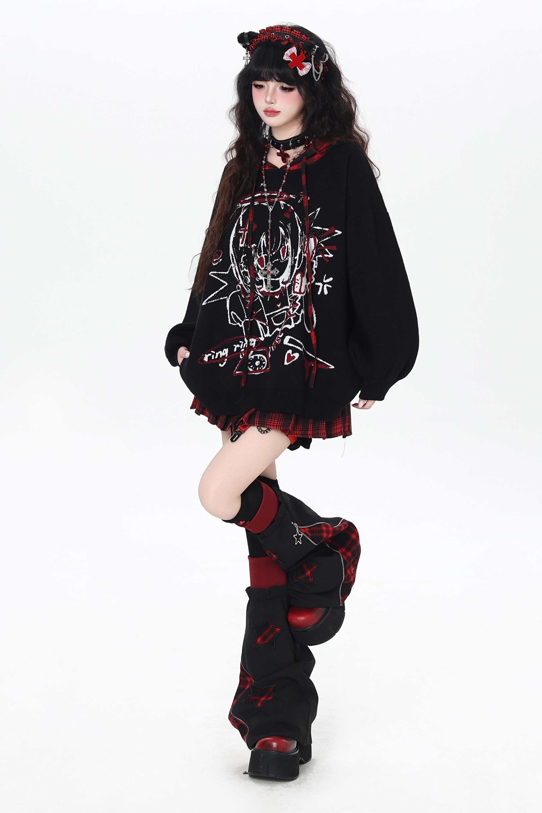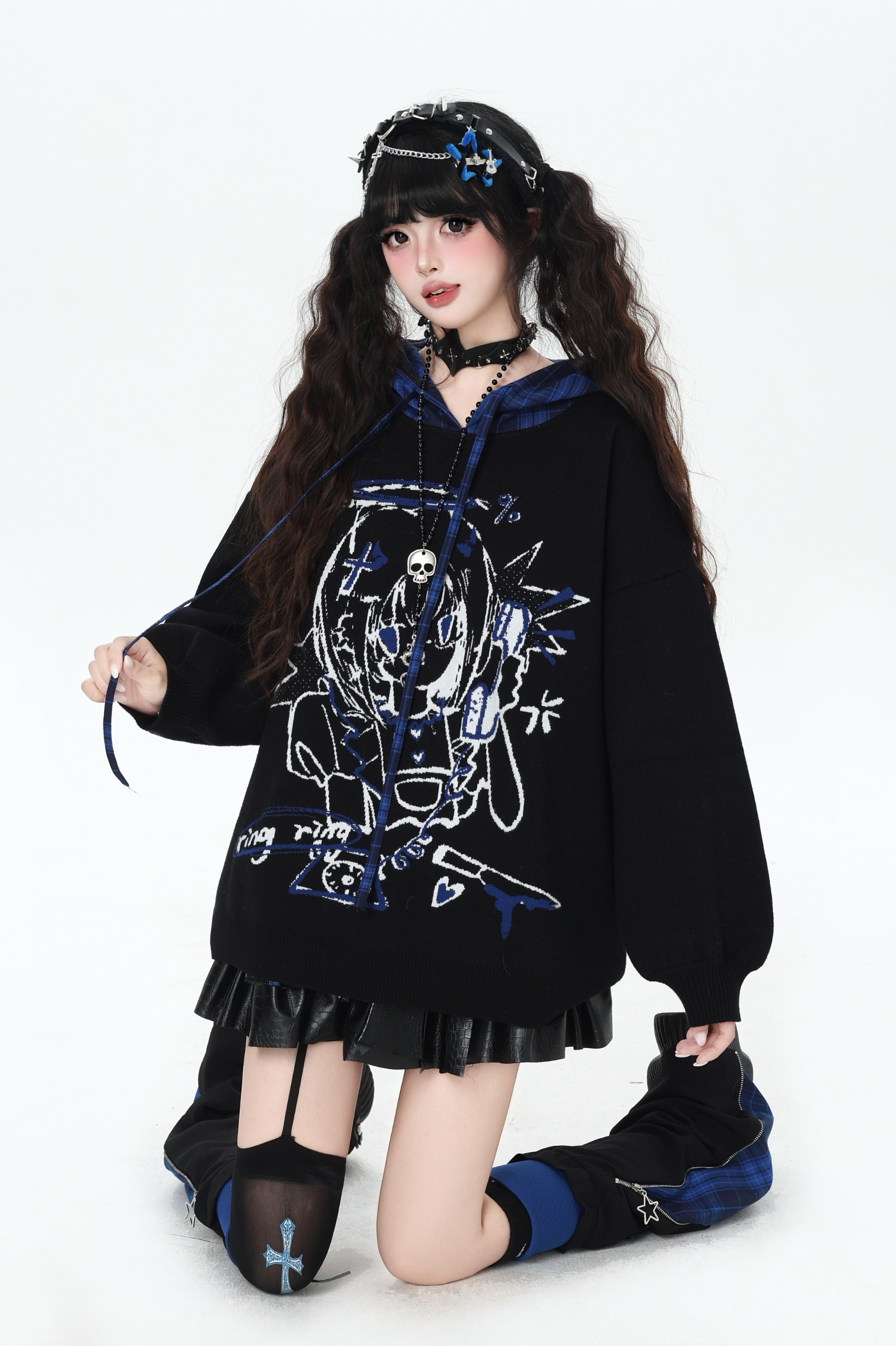 パンクガールチェックフードルーズセーター