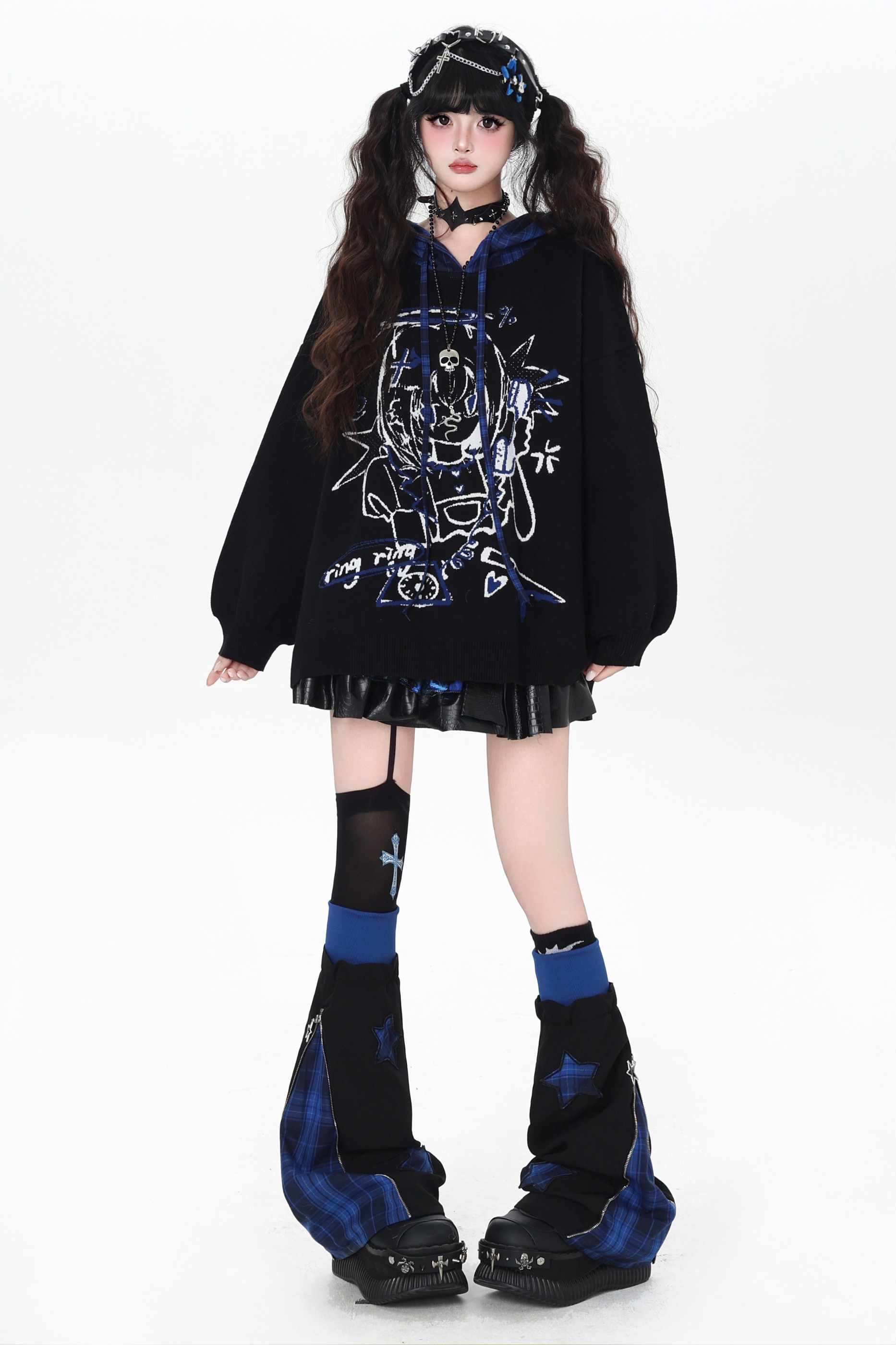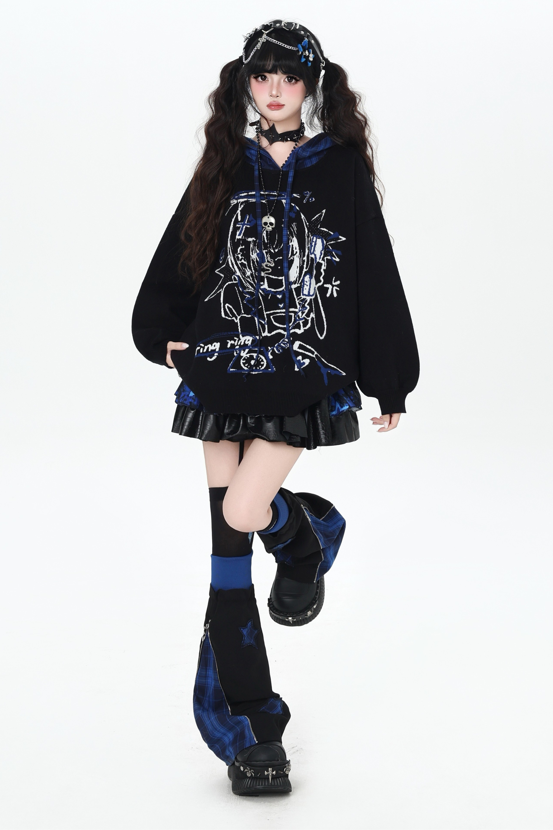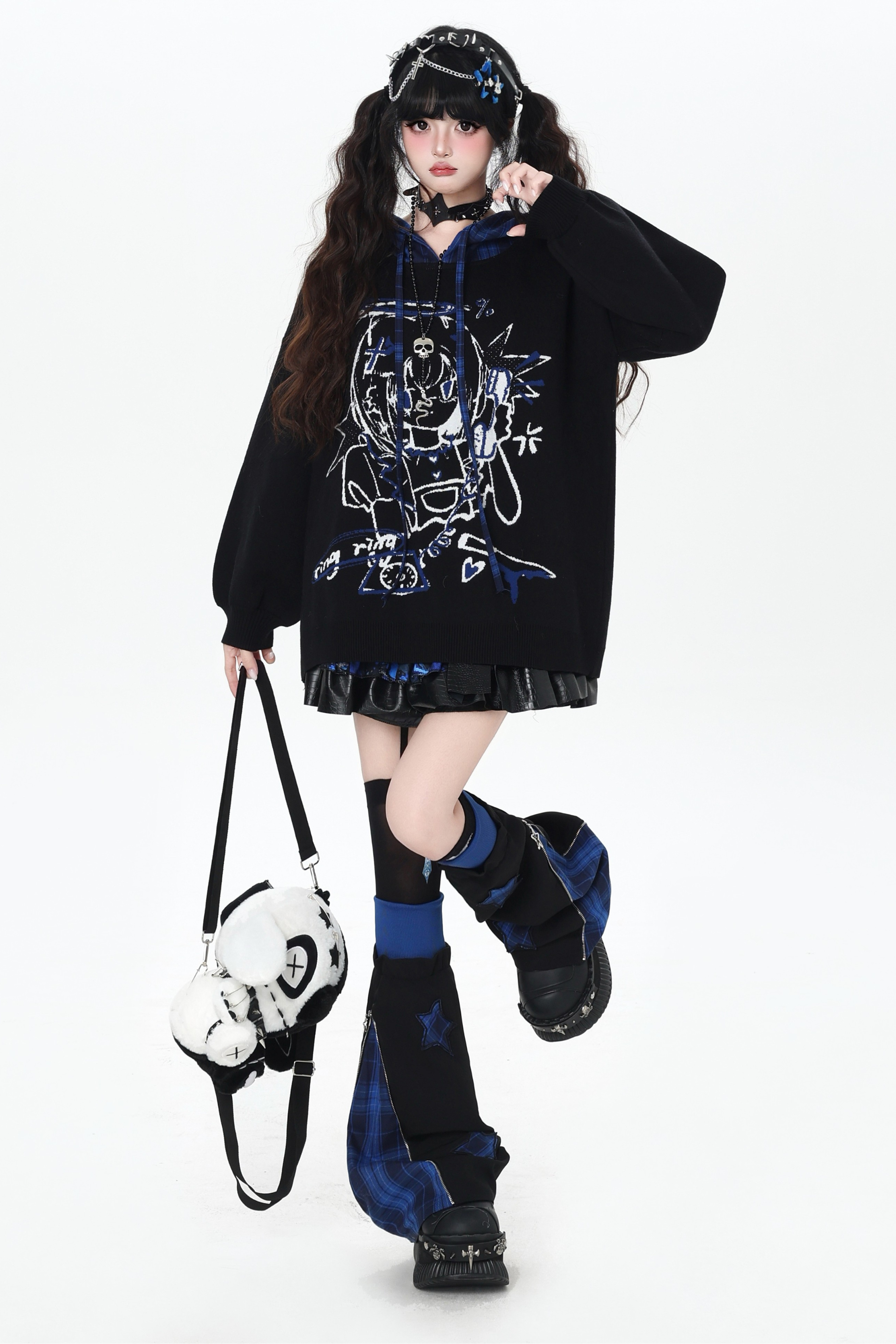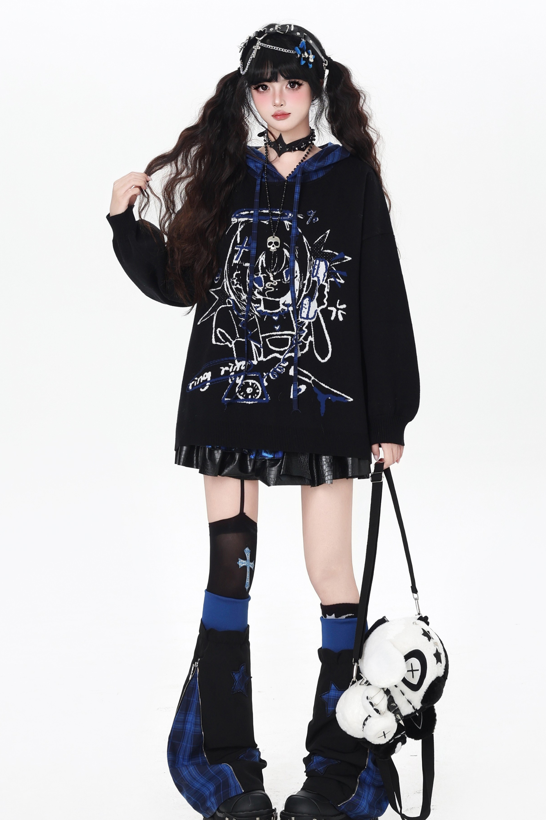 パンクガールチェックフードルーズセーター