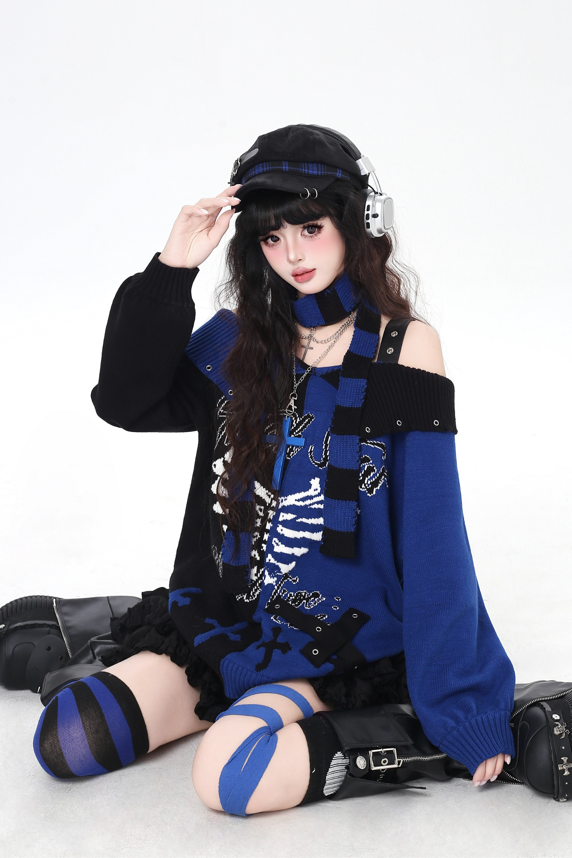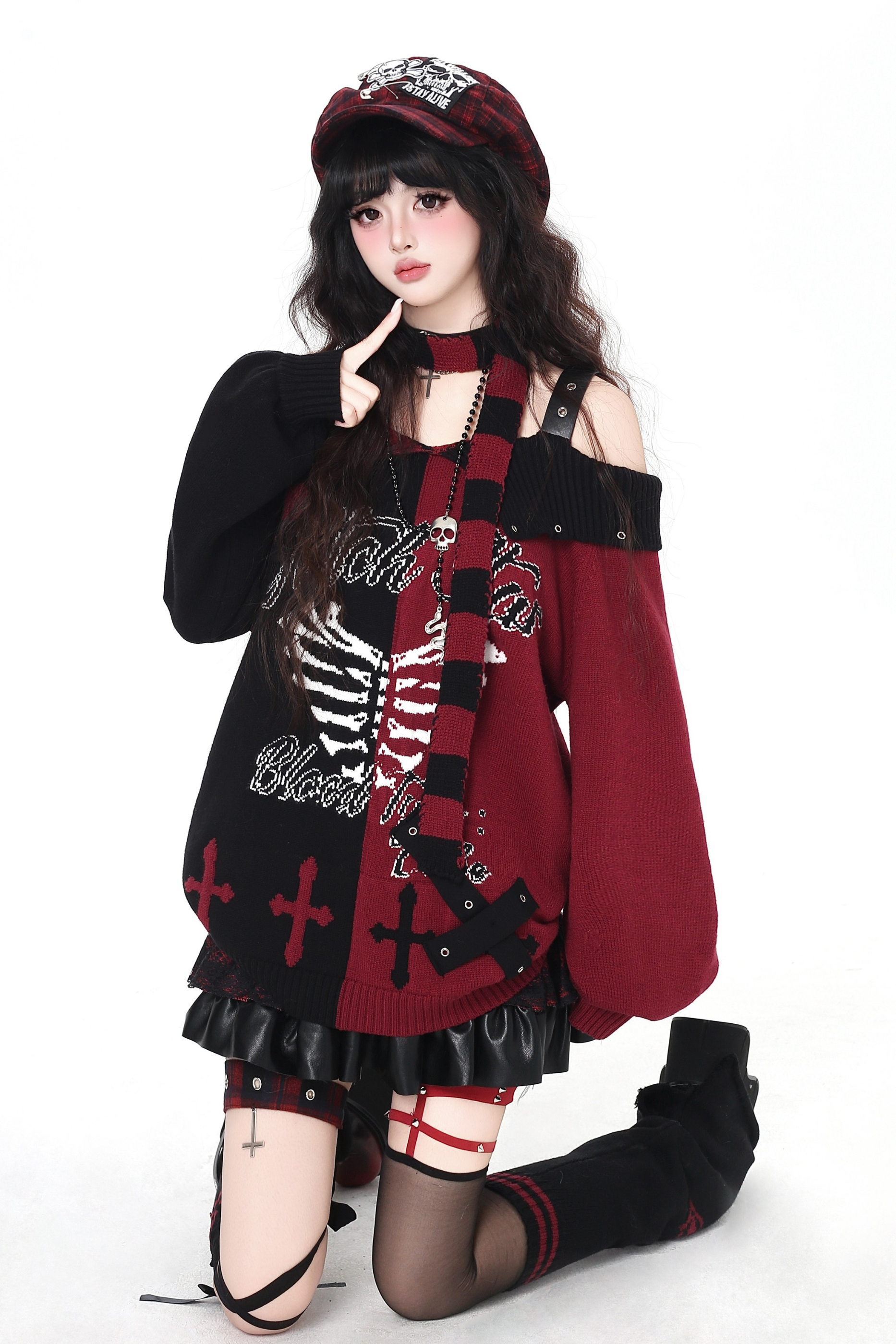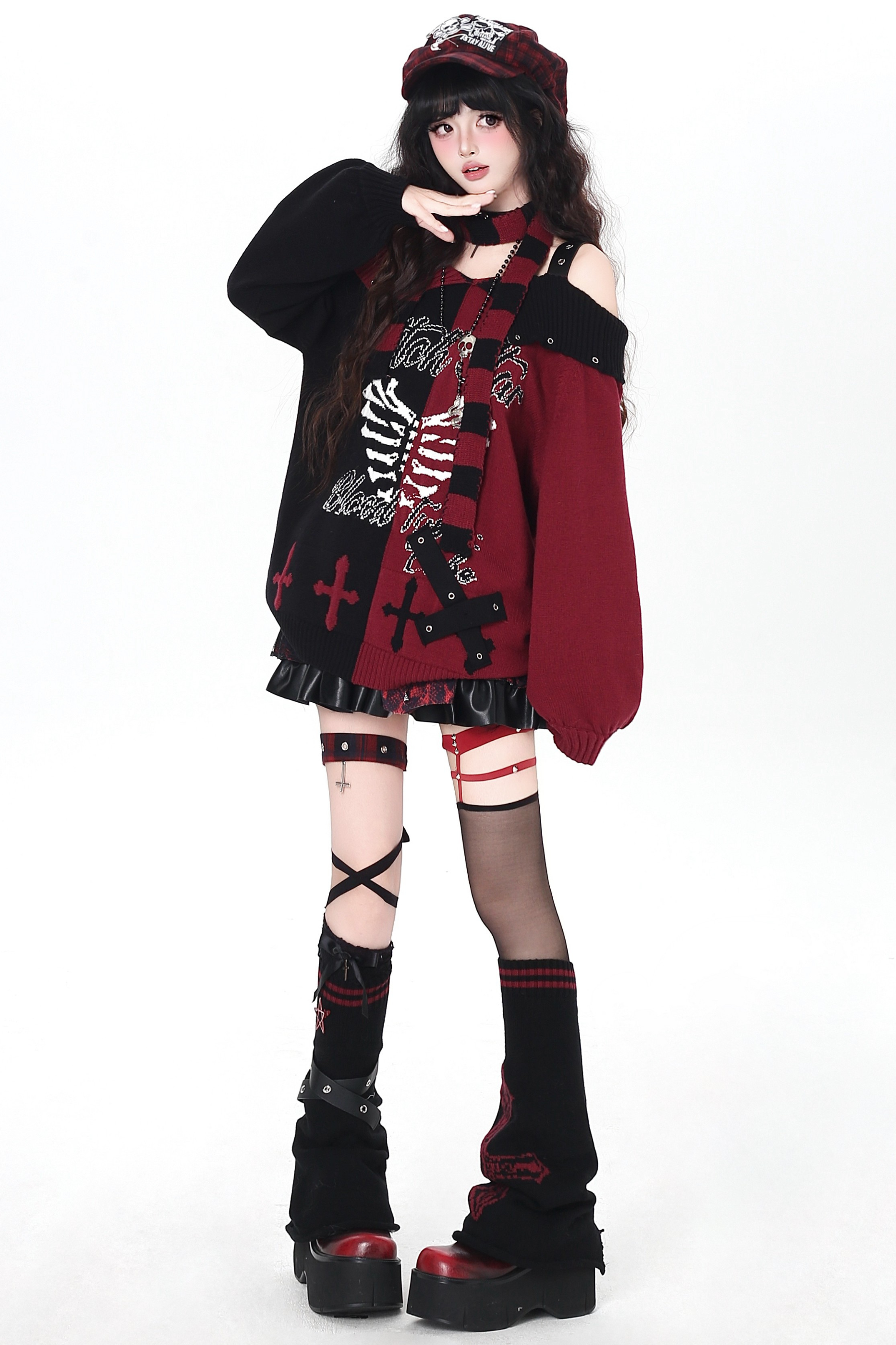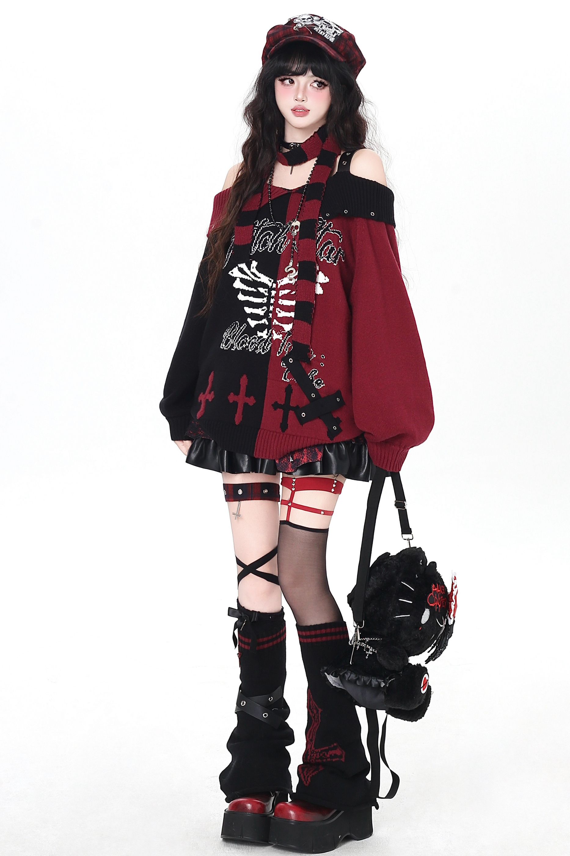 スカルボーンゴシックオフショルダートップス+スカーフ
