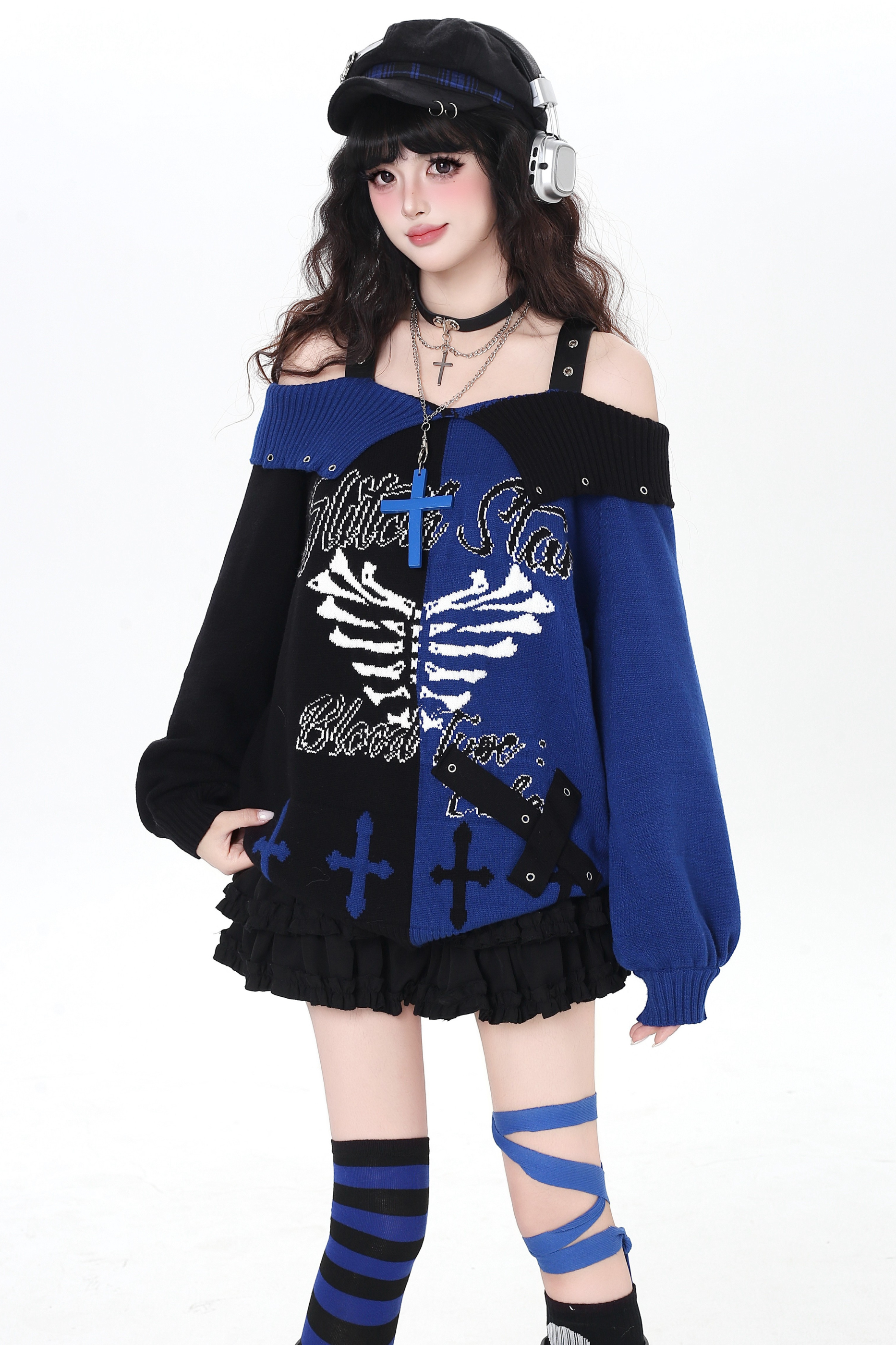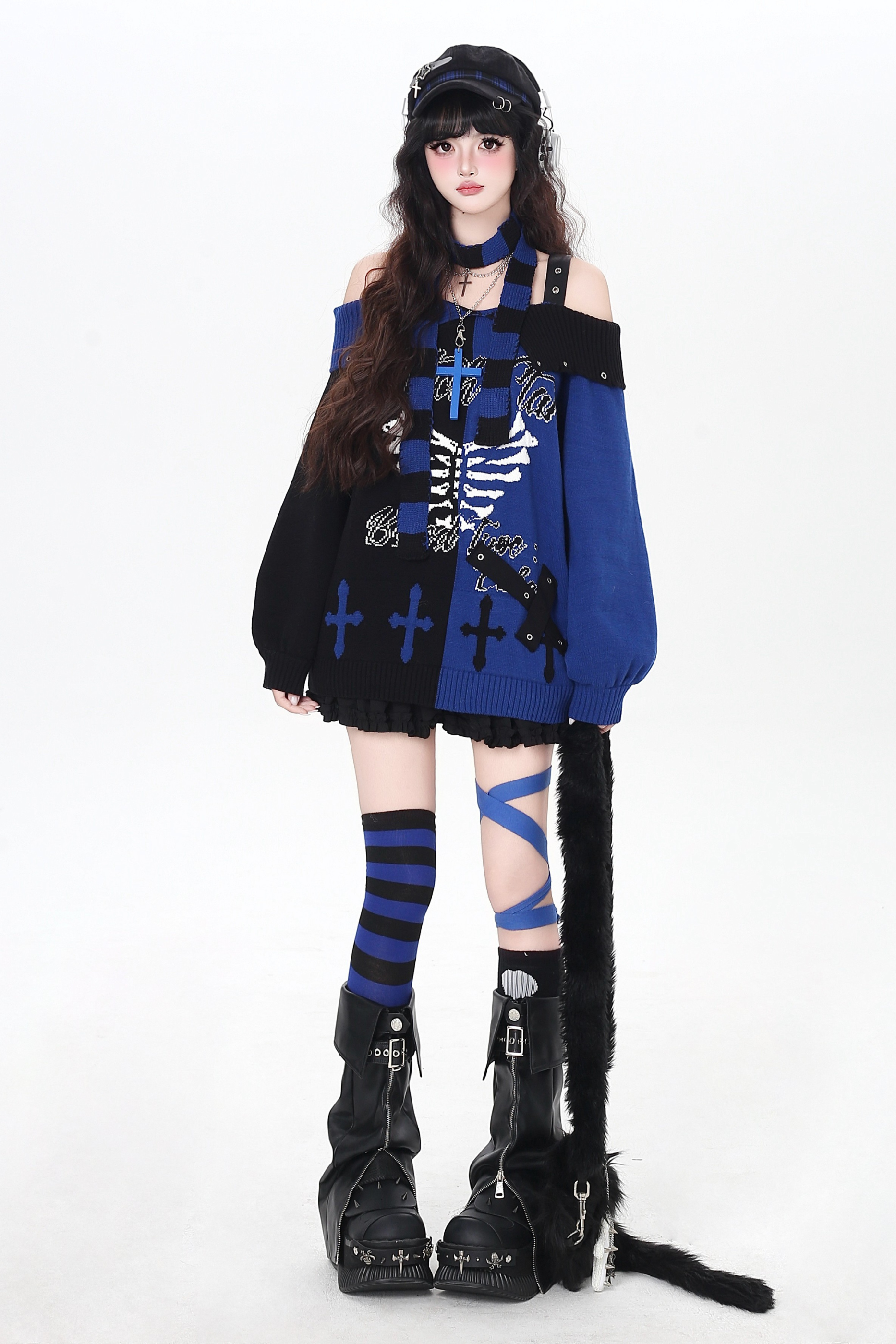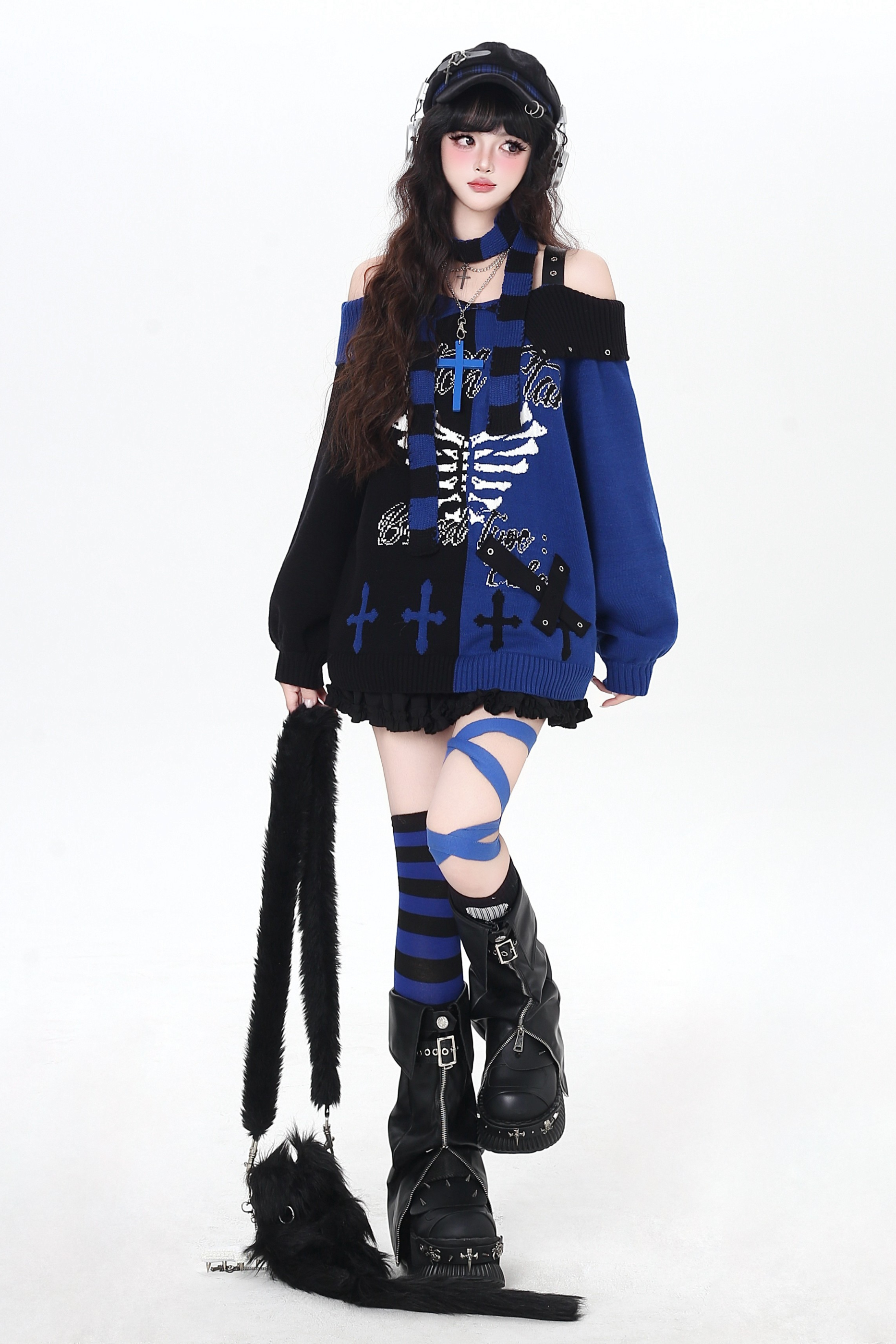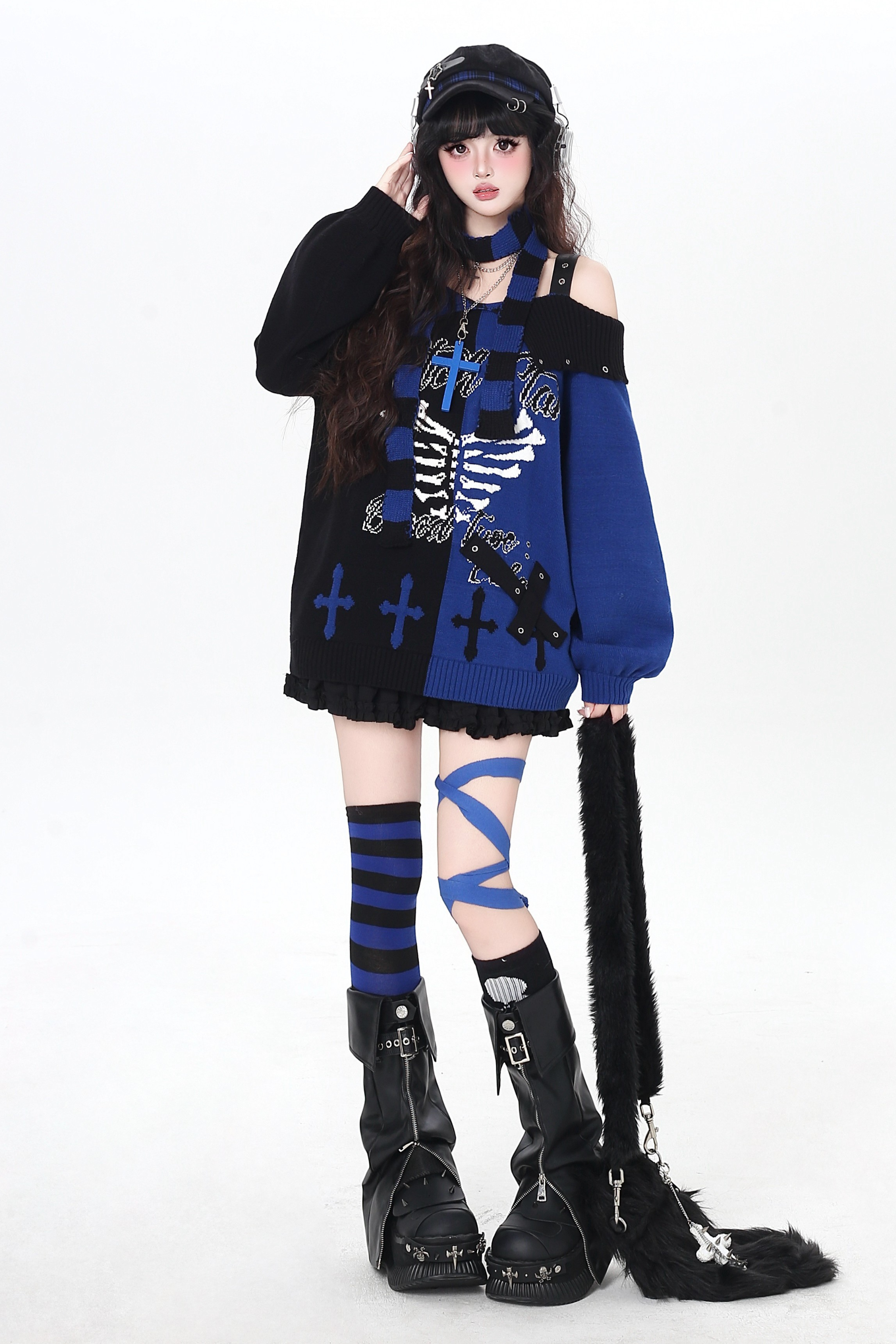 スカルボーンゴシックオフショルダートップス+スカーフ