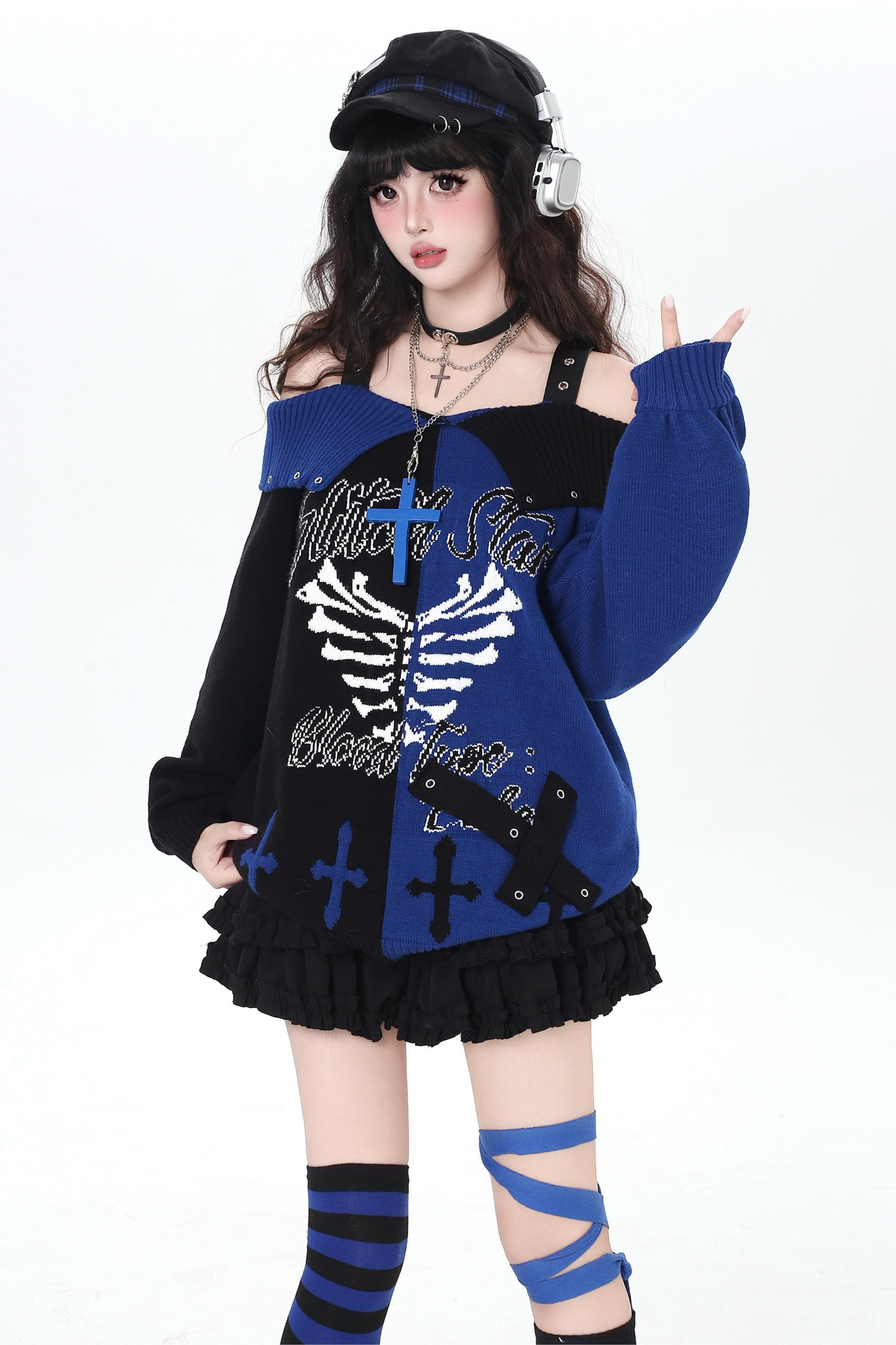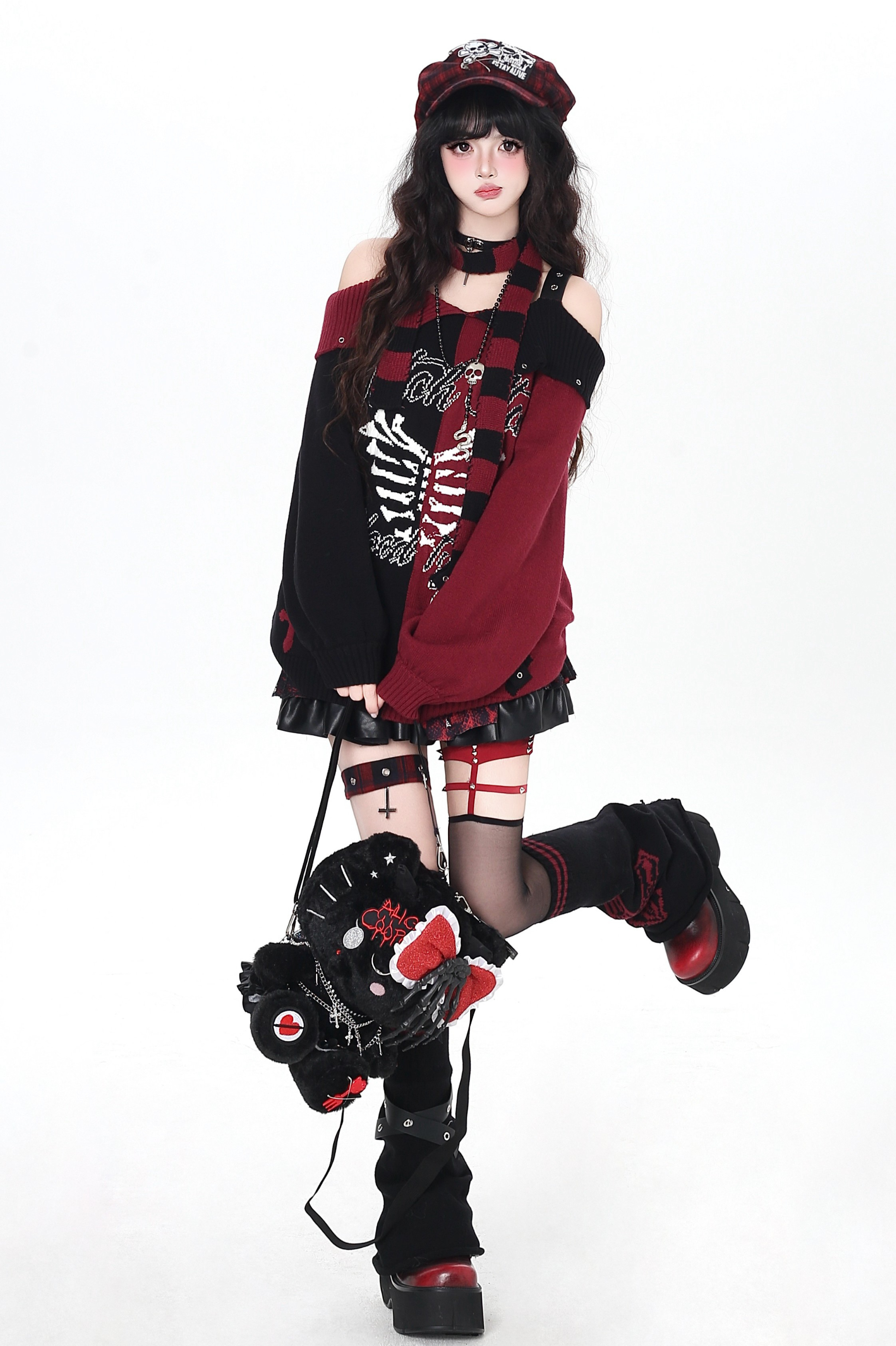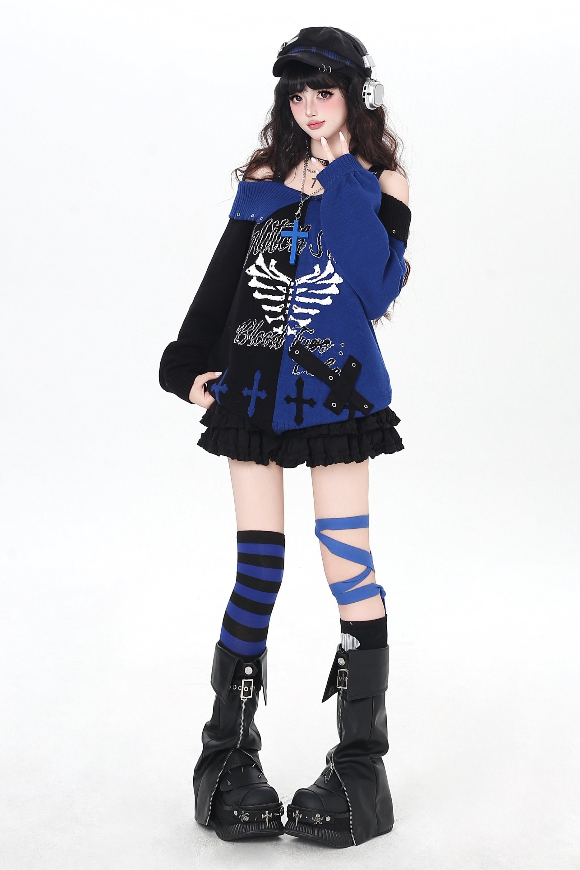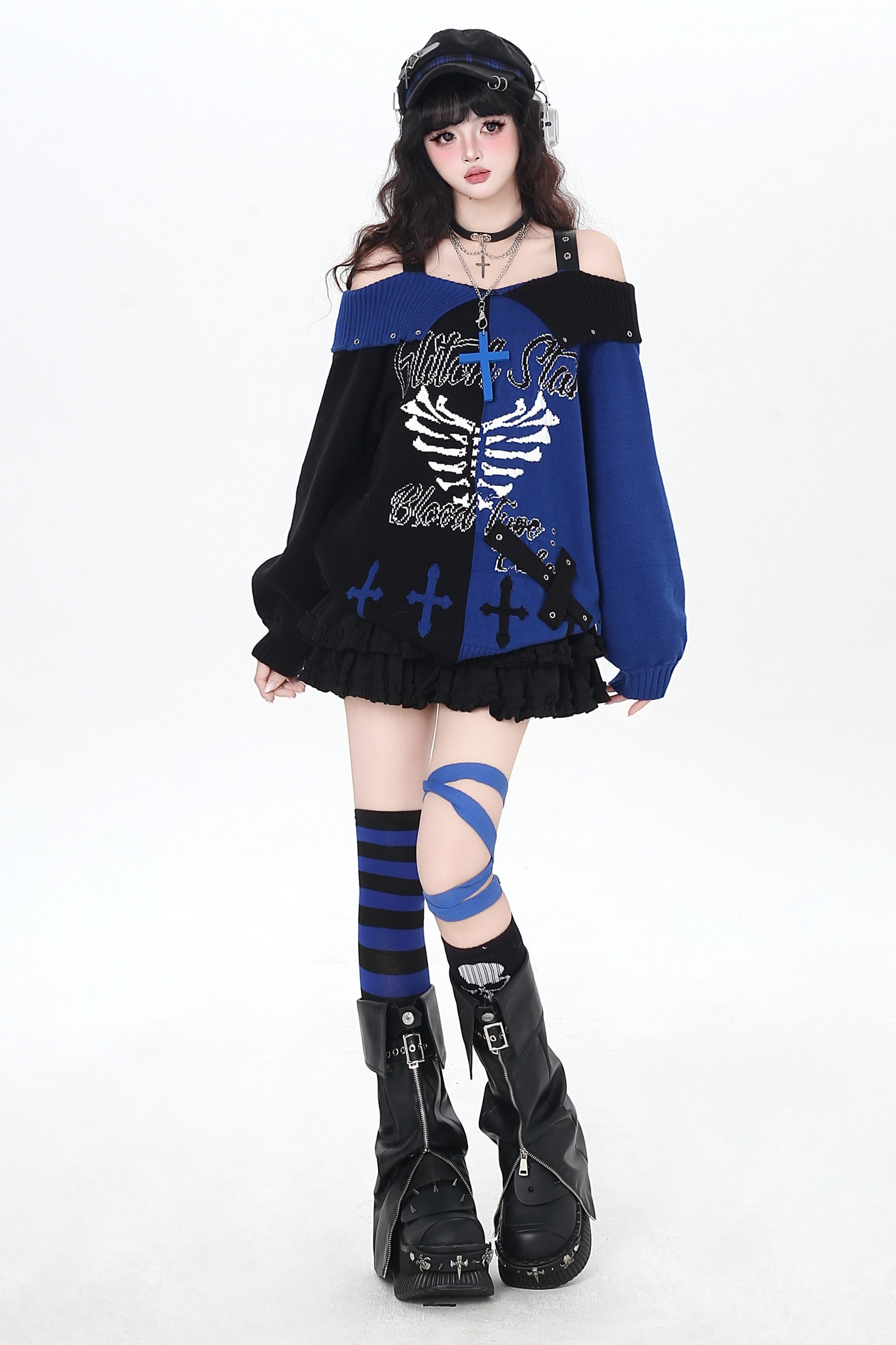 スカルボーンゴシックオフショルダートップス+スカーフ