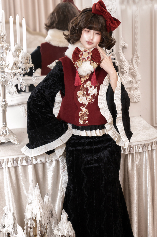 レトロフィッシュテールチャイナドレス+ベスト+ファースカーフ