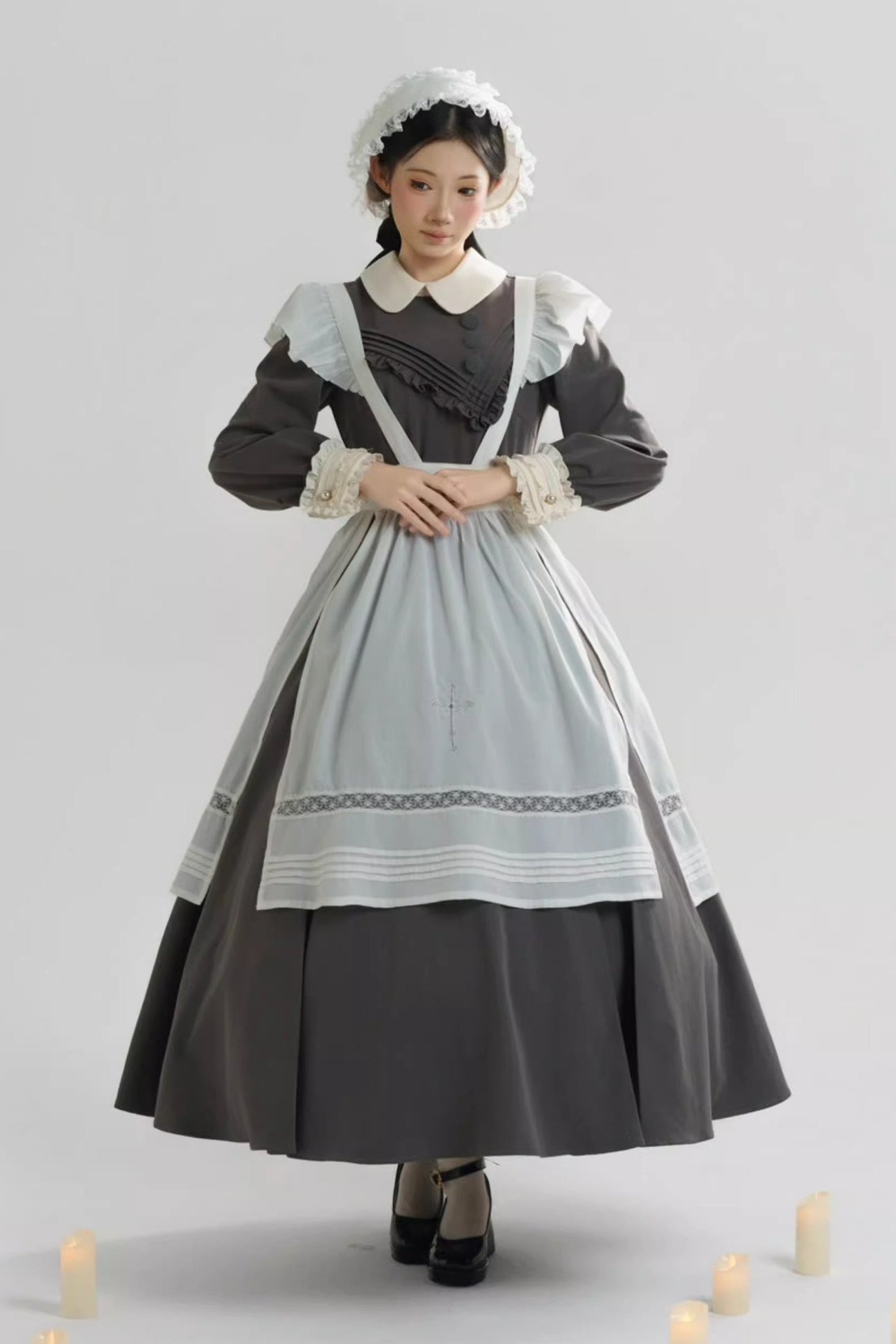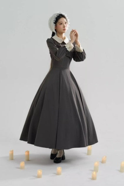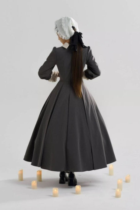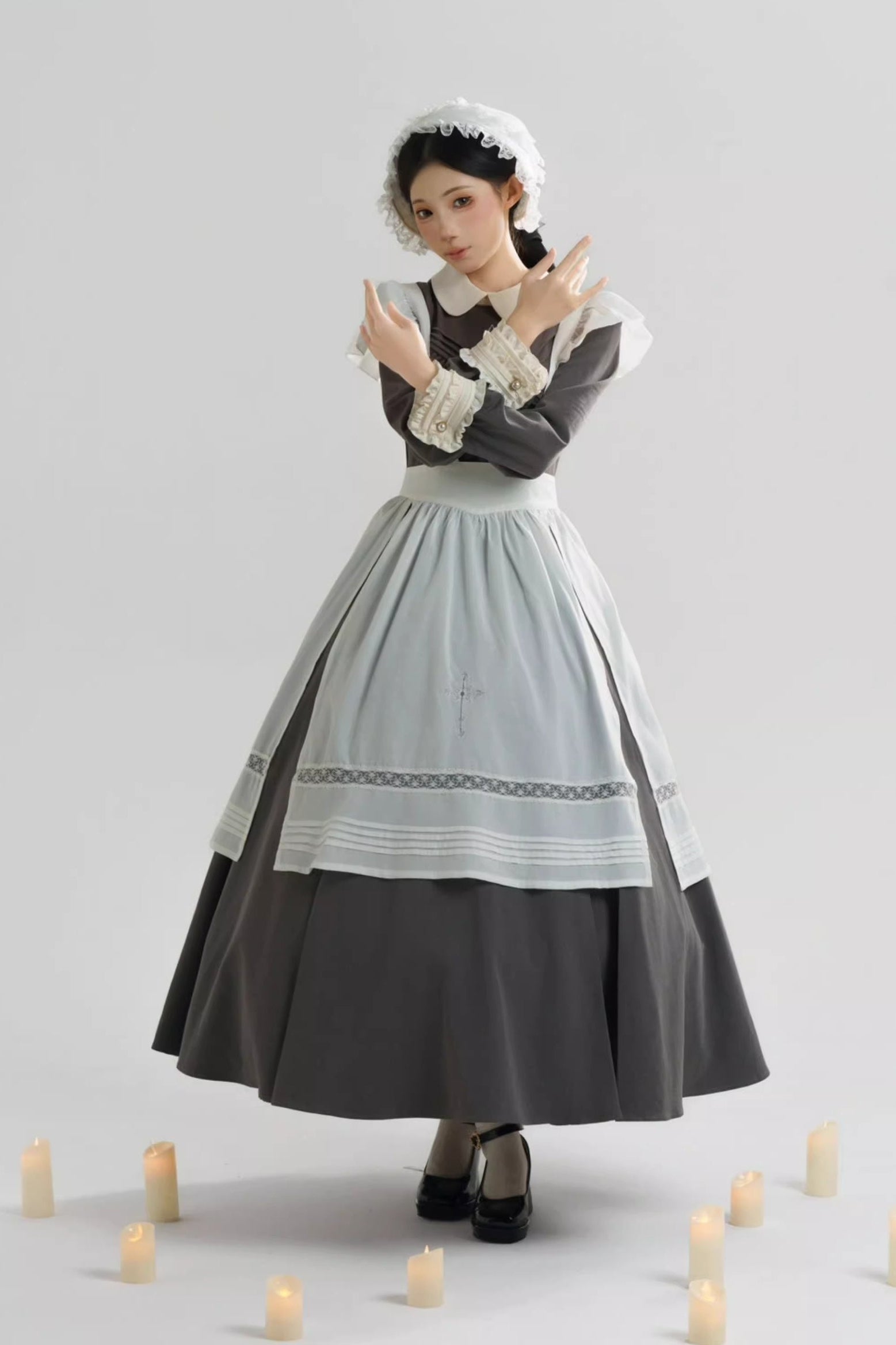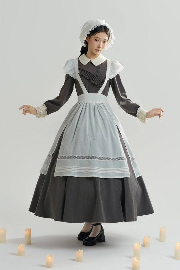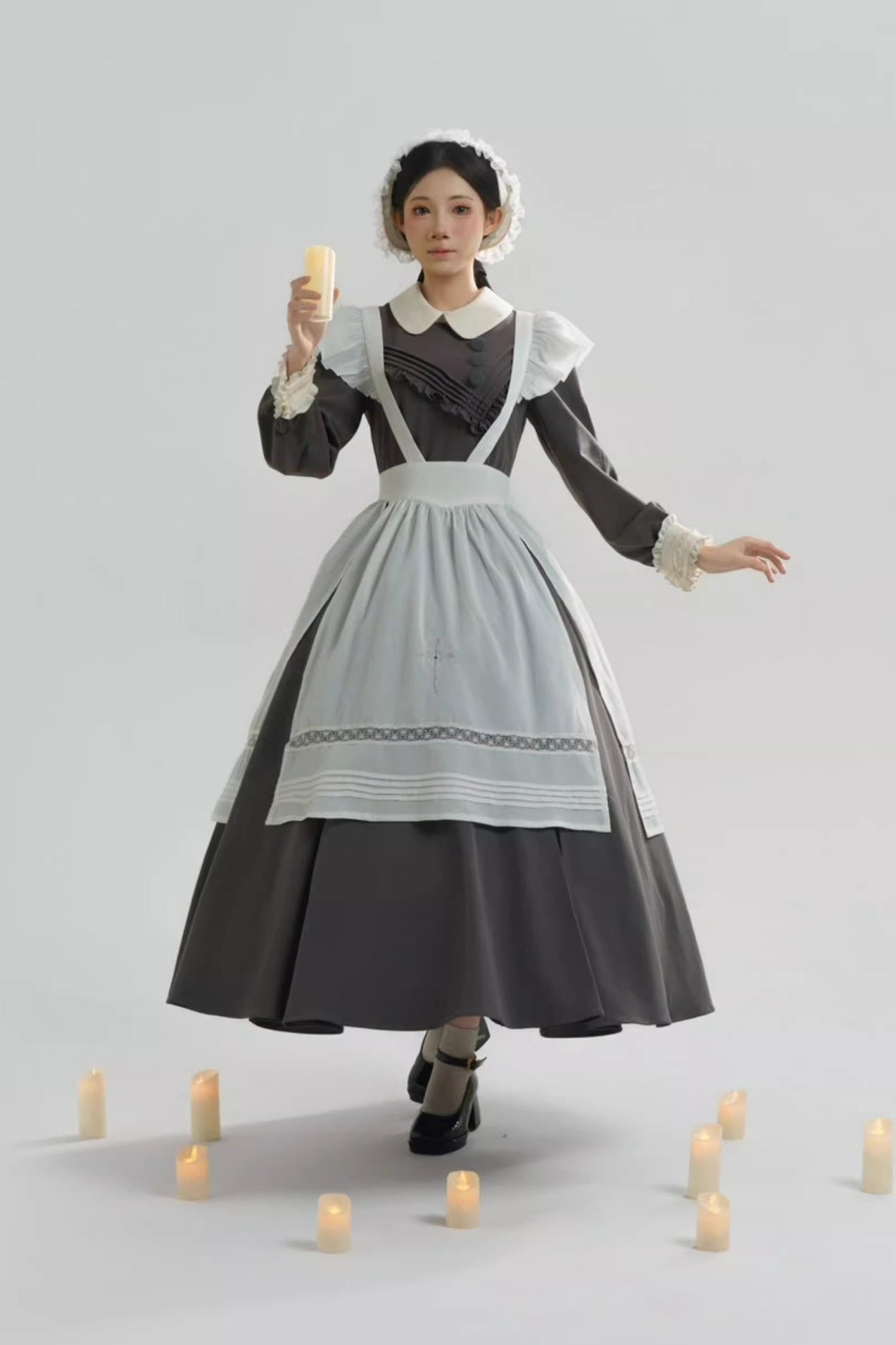 ❤︎【12月21日予約締切】クラシックロリータ修道女ロングドレス+クロスフリルエプロン+ボンネット❤︎                                                ⚠️人気商品のためお届けに4ヶ月ほどかかってしまう場合がございます