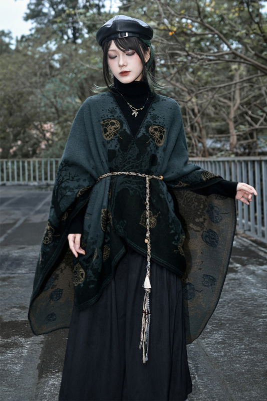 ダークチャイナフードトップス+ベルト+ケープ+ネックレス+スカート