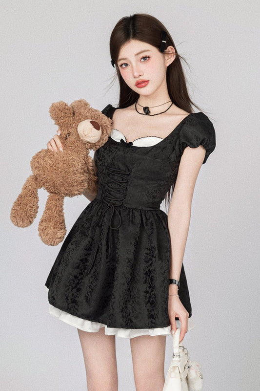 ソリッドカラ―キャットポウTシャツ+ショートスカート+ブラック プリーツ キュロット