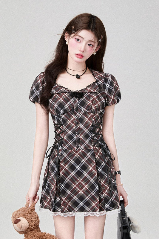 ミニボウプレッピーハイウエストスカート+ホワイトトップス