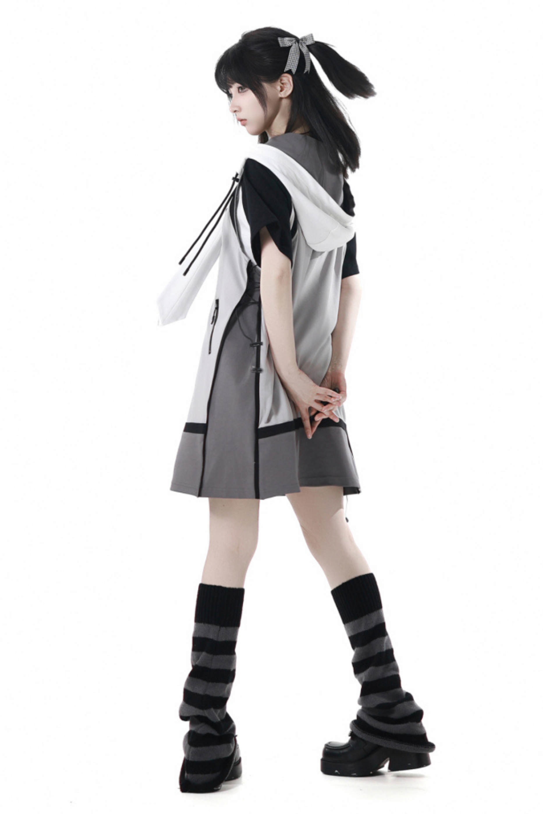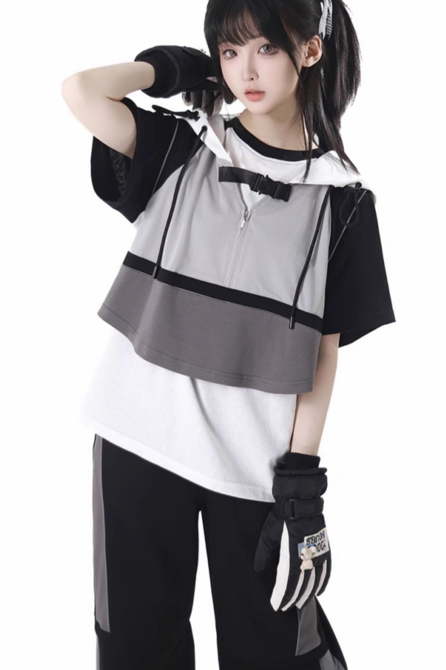 モードカジュアルレイヤードベスト+Tシャツ+ワイドパンツ+ワンピース