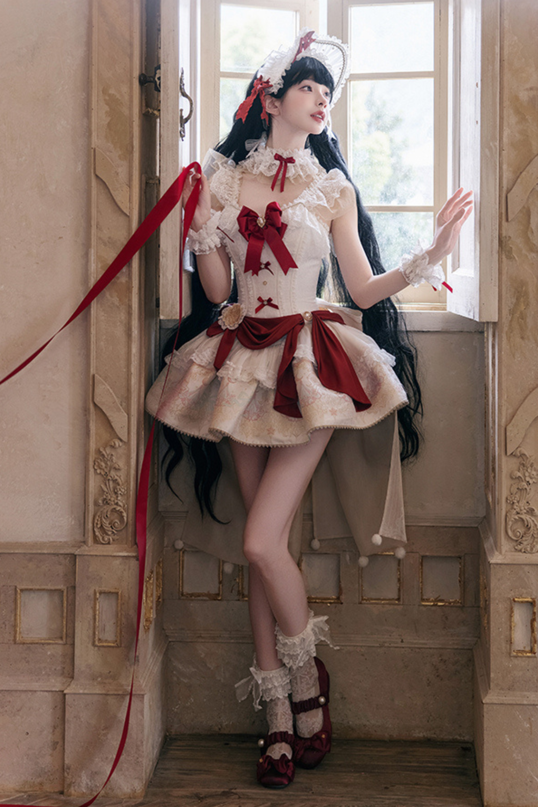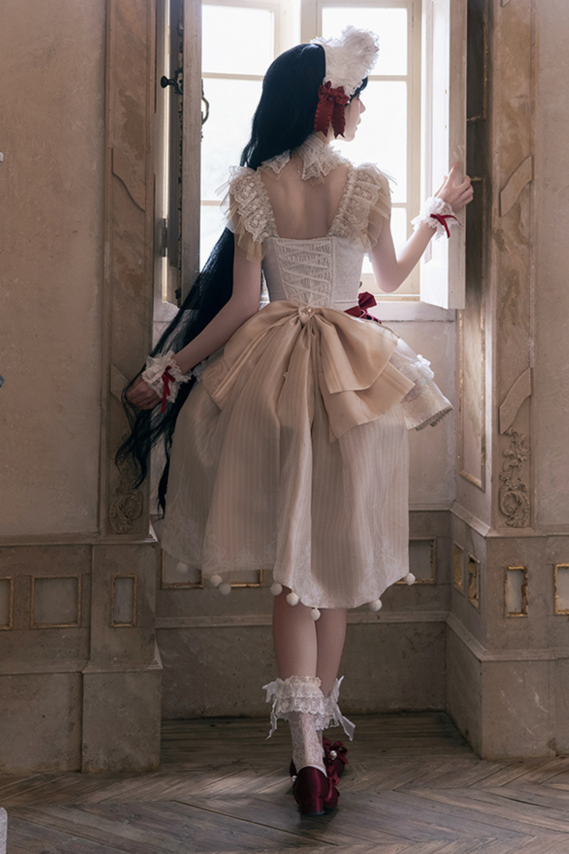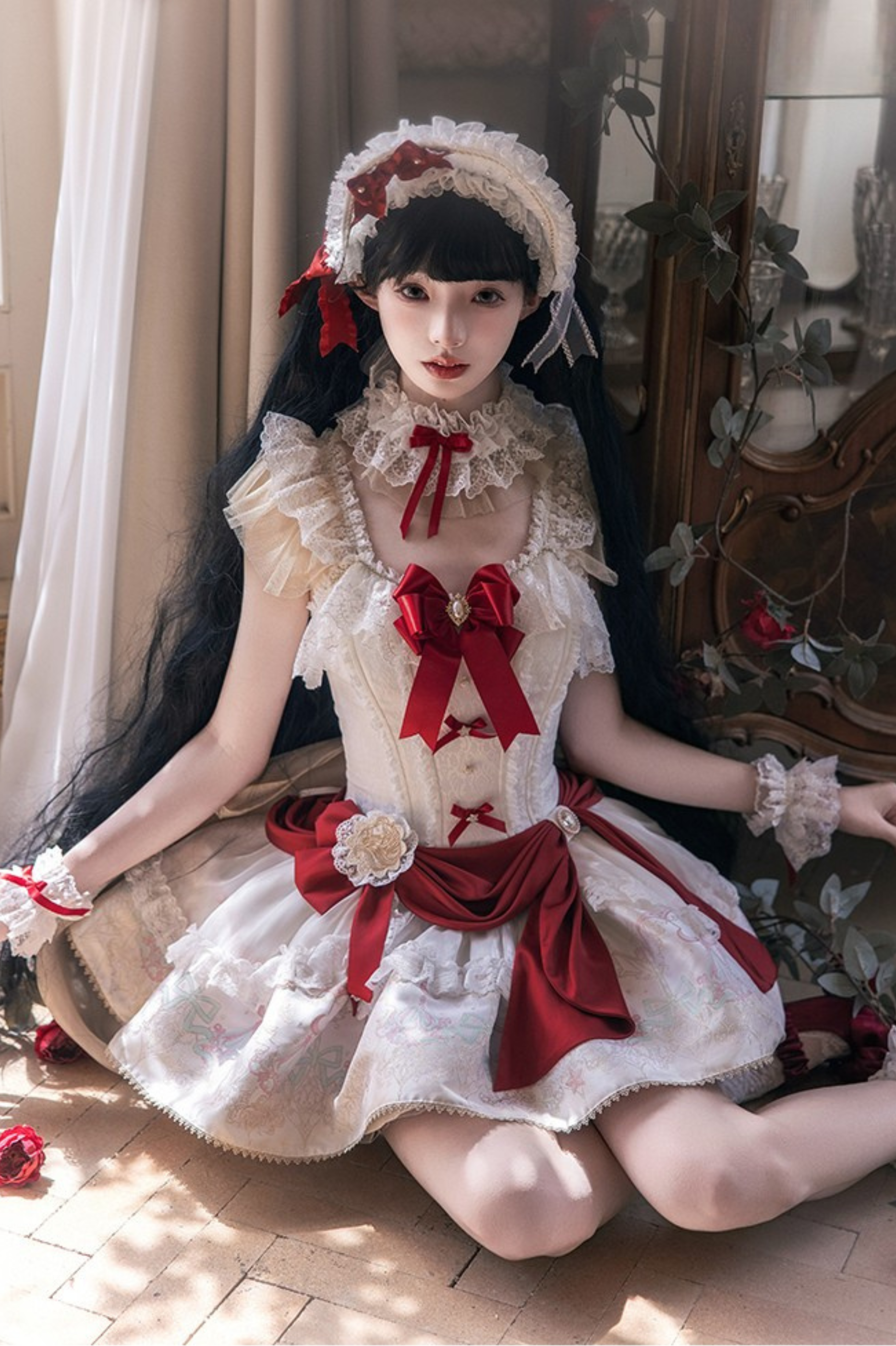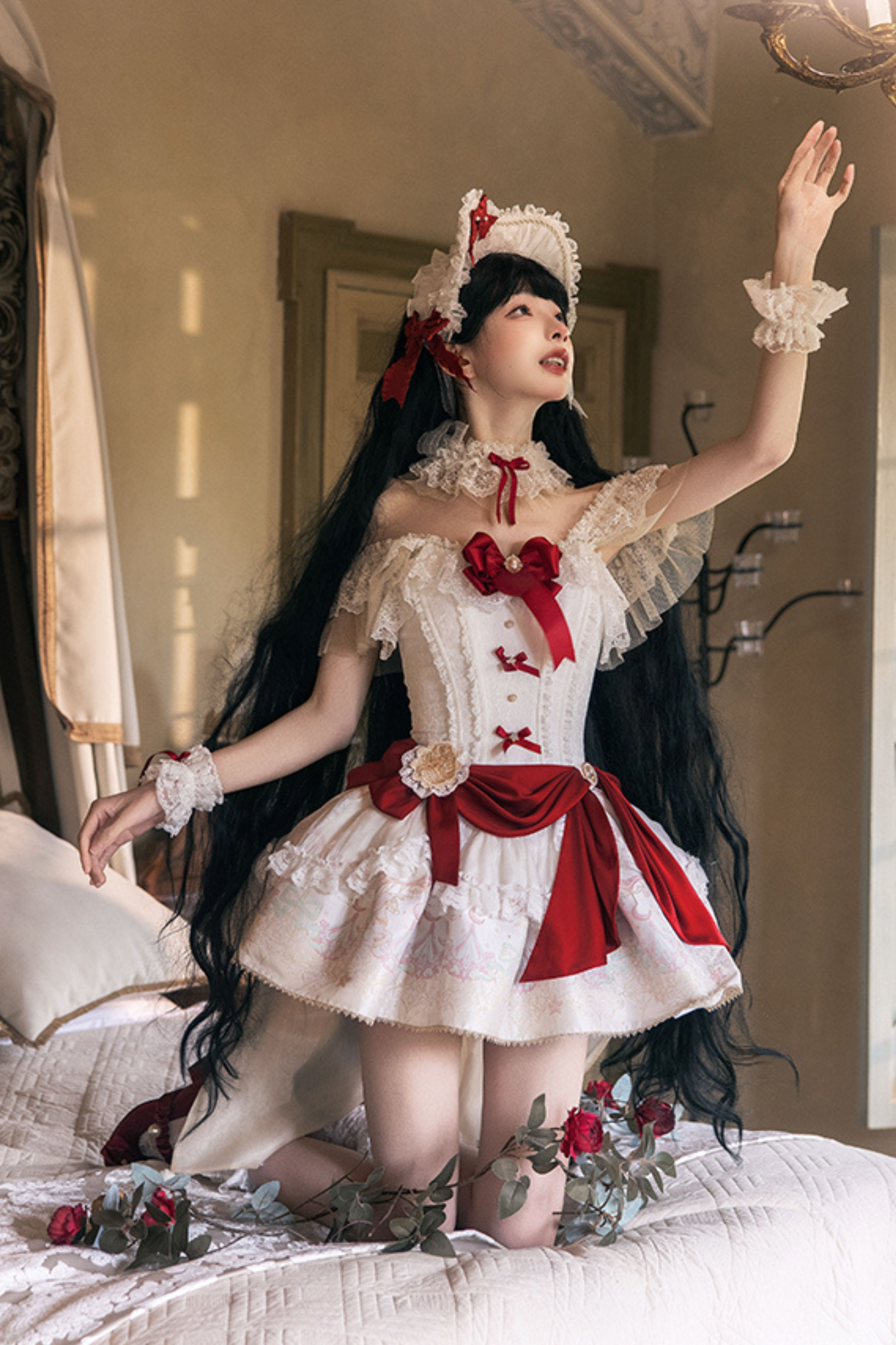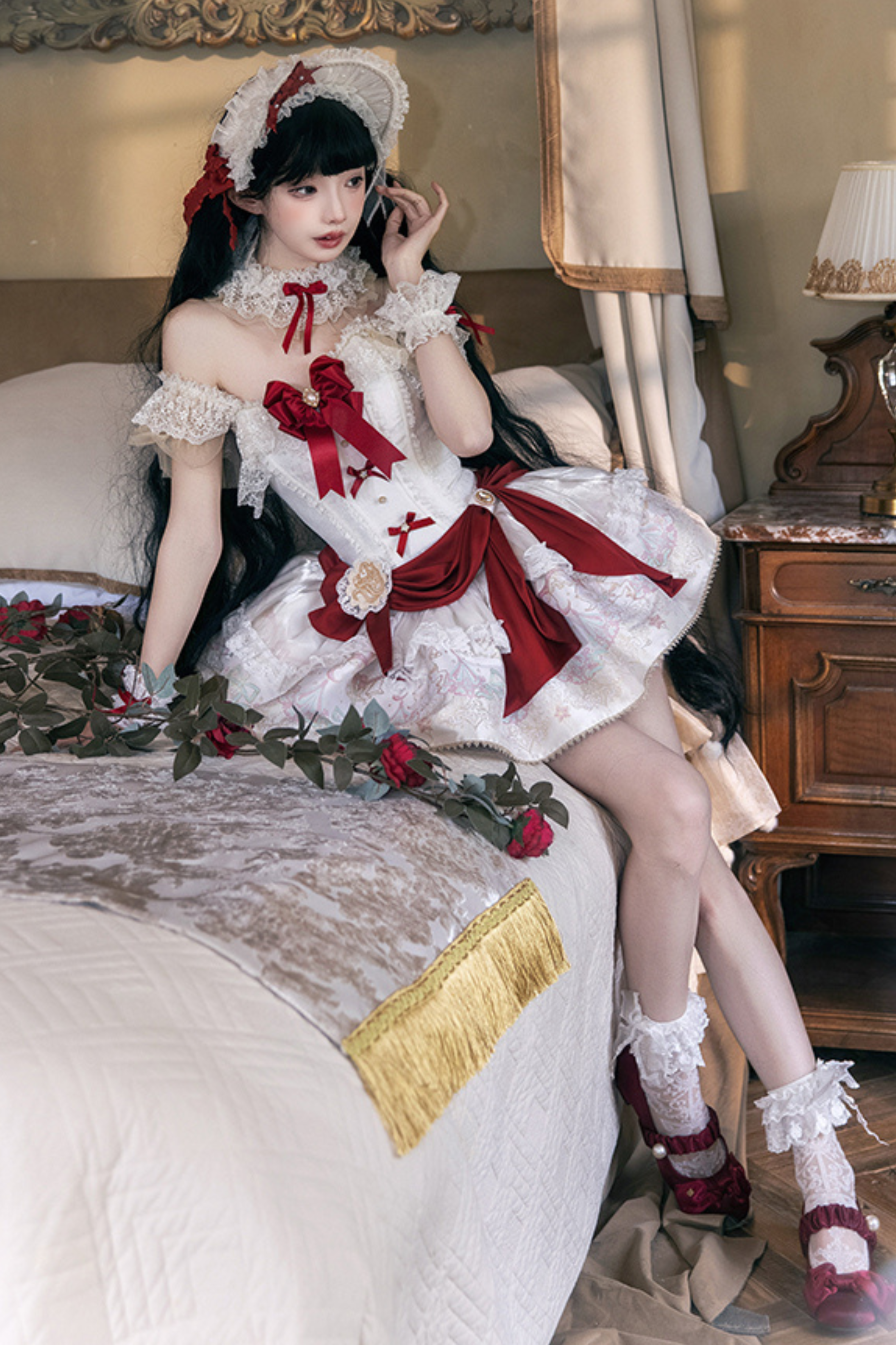 白雪プリンセスロリータドレス+ボンネット+レースチョーカー