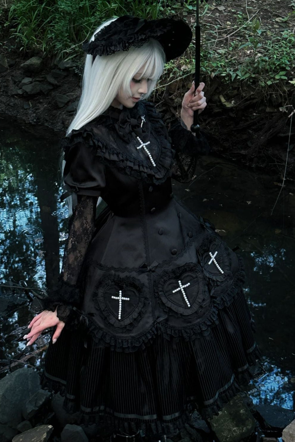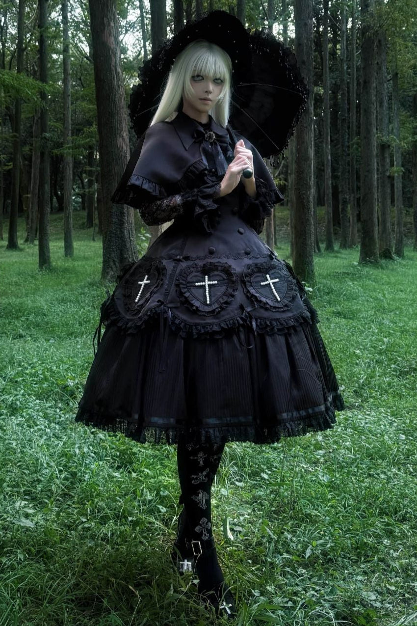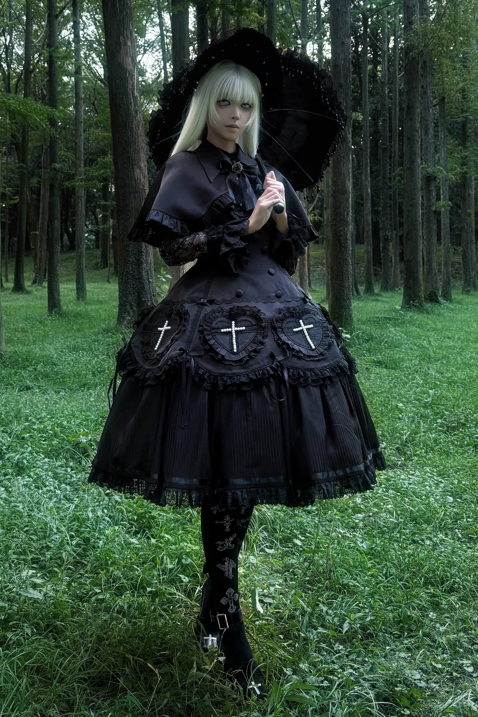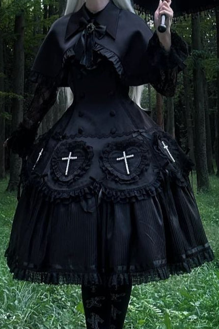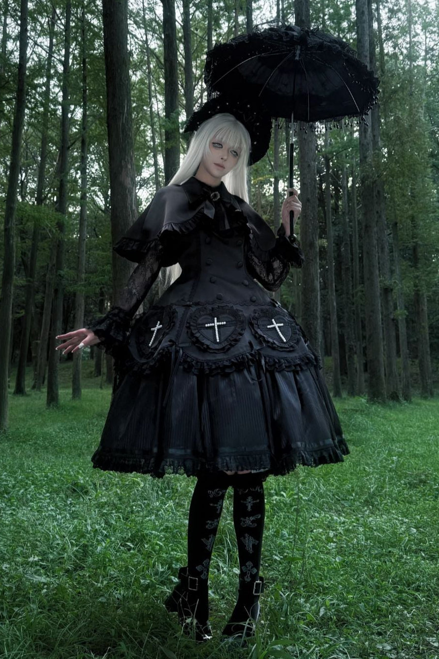 ❤︎【12月12日予約締切】Night Crossダークエレガントゴシックロリータジュエルリボンケープ+ロングドレスセット❤︎ ⚠️人気商品のためお届けに4ヶ月ほどかかってしまう場合がございます