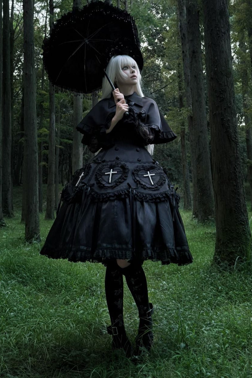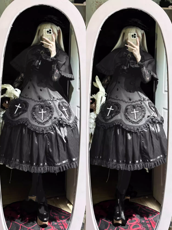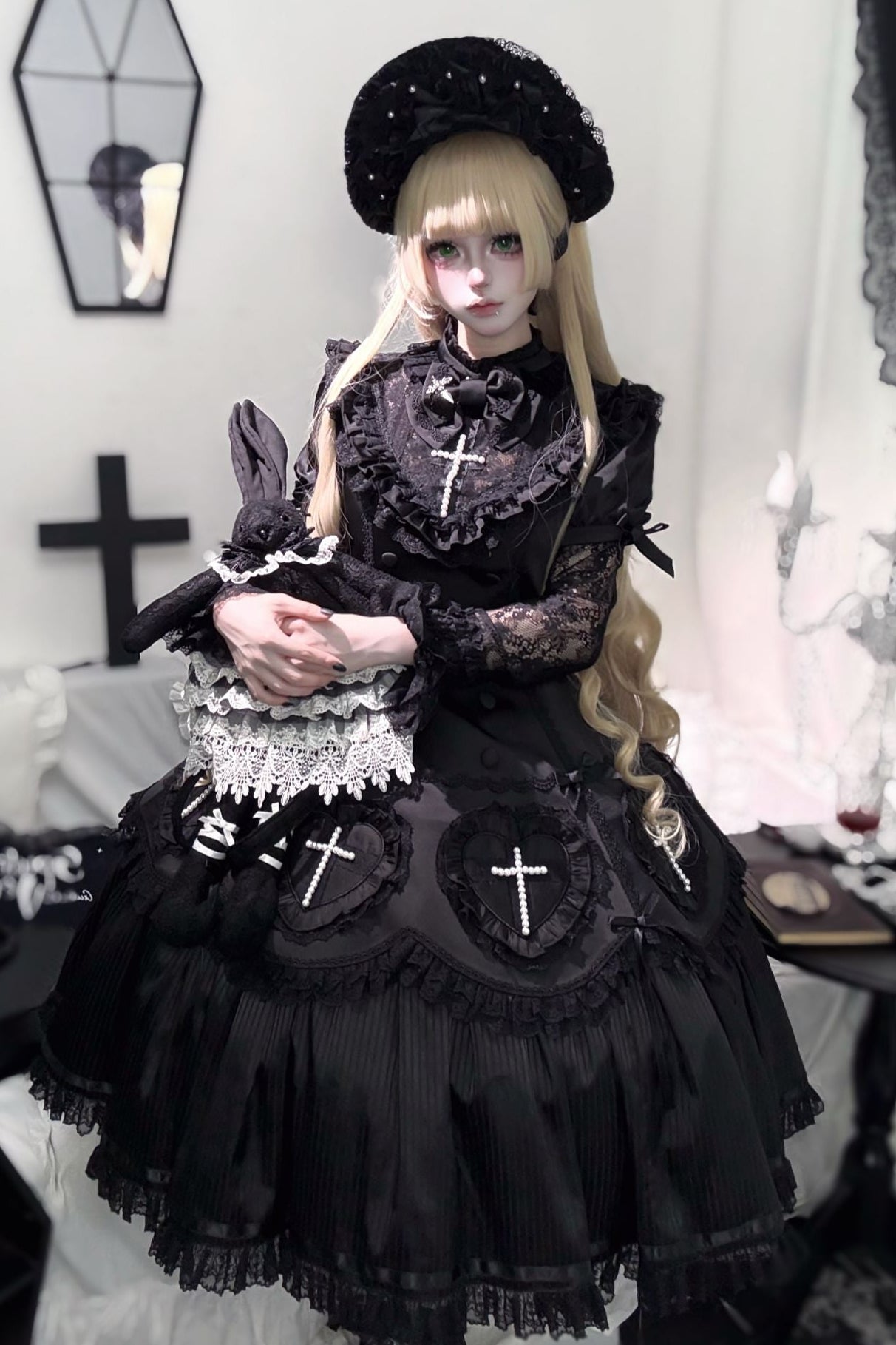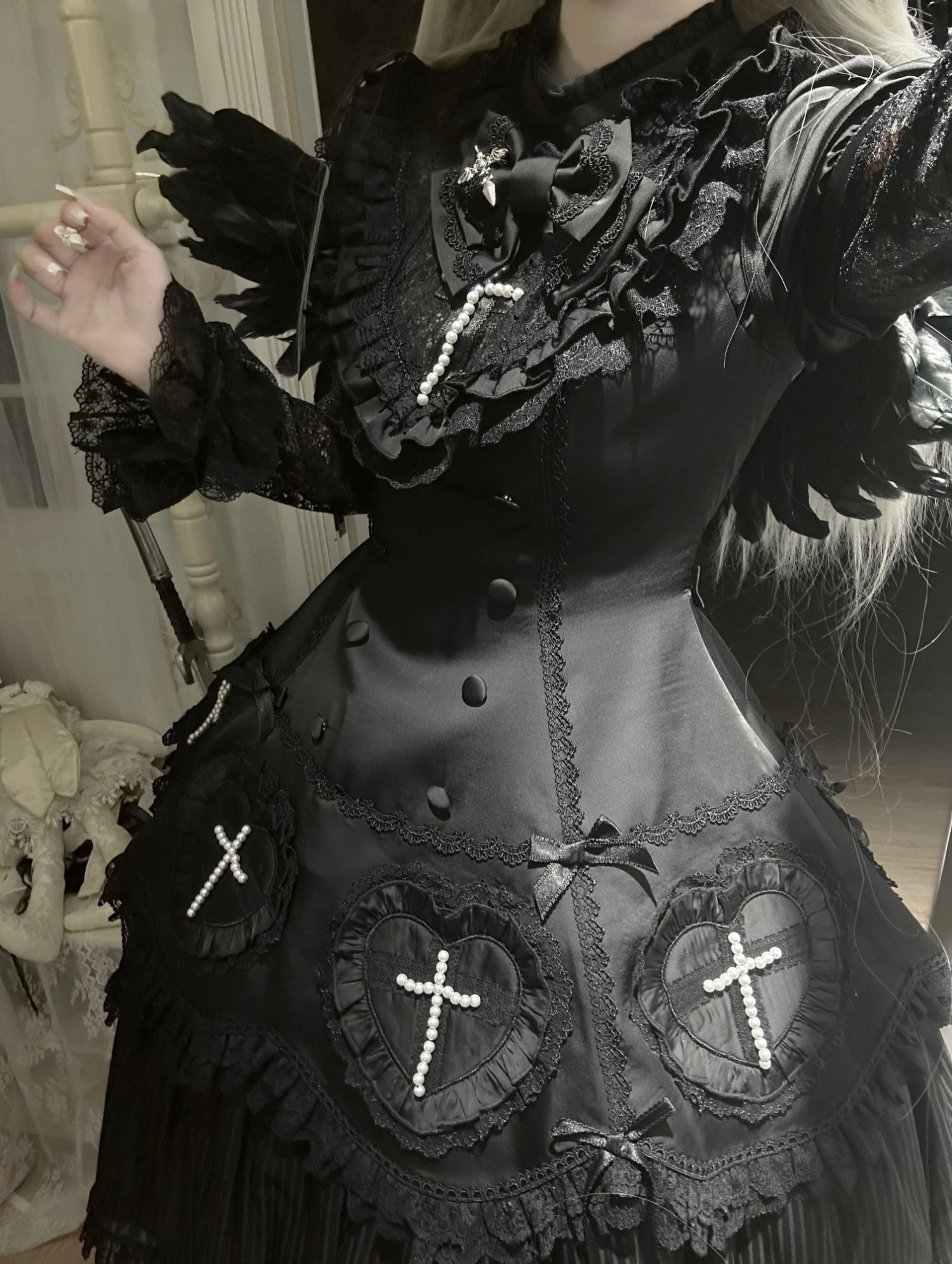 ❤︎【12月12日予約締切】Night Crossダークエレガントゴシックロリータジュエルリボンケープ+ロングドレスセット❤︎ ⚠️人気商品のためお届けに4ヶ月ほどかかってしまう場合がございます
