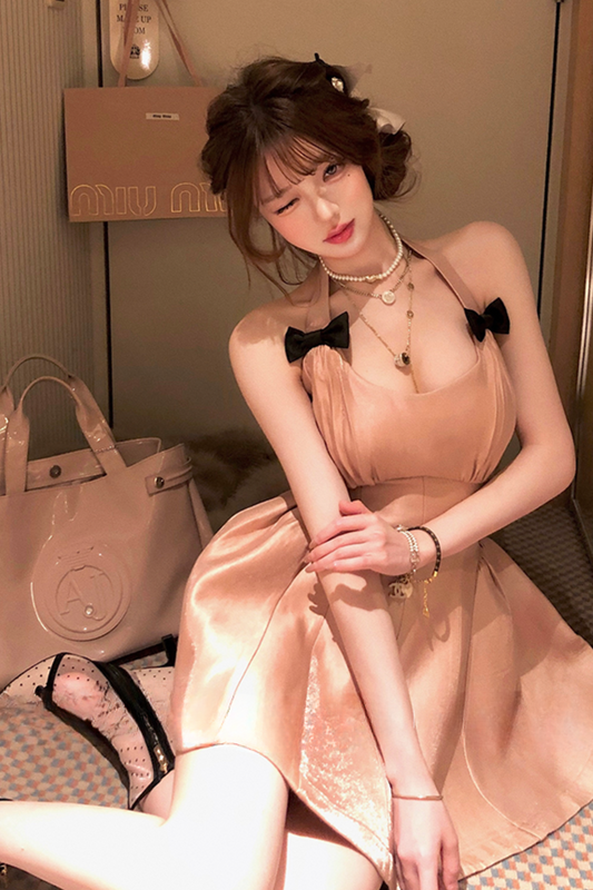 リボンホルターネックゴールデンパフピュアドレス