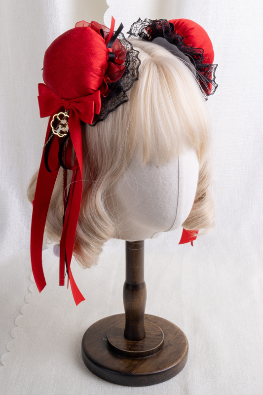 ダークフリルロリータヘアバンド+フラットハット+ハットクリップ+リボンクリップ+スリーブ