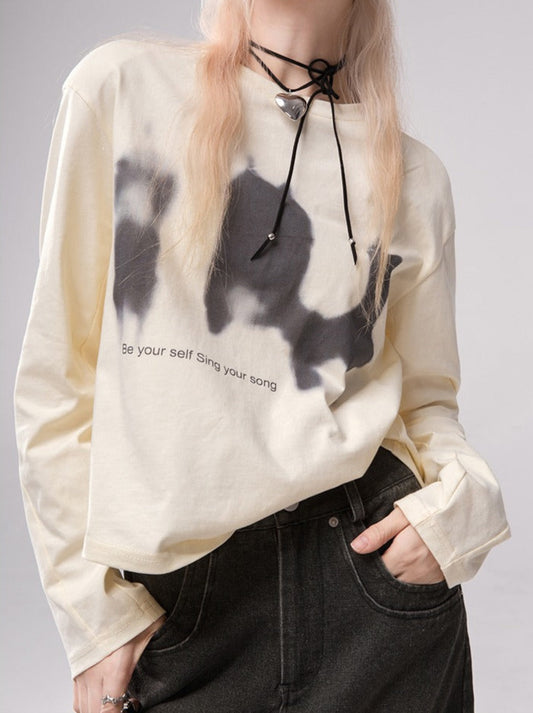 クリームライスラウンドネックルーズカジュアルプリントロング Tシャツ