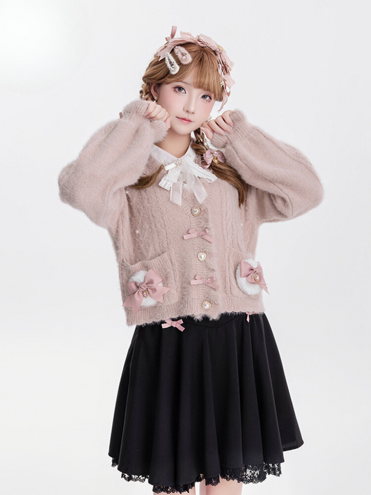 ガーリーリボンパフリボンイミテーションミンクセーターカーディガン