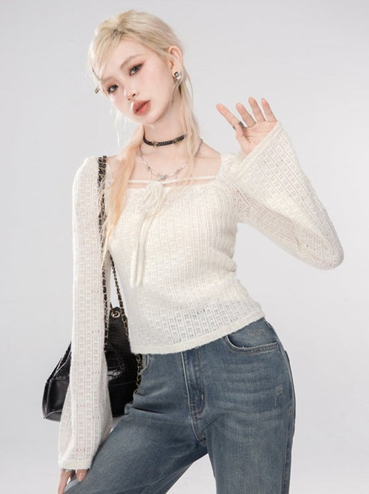 レースリボンオフショルダー V ネックルーズプルオーバーニット