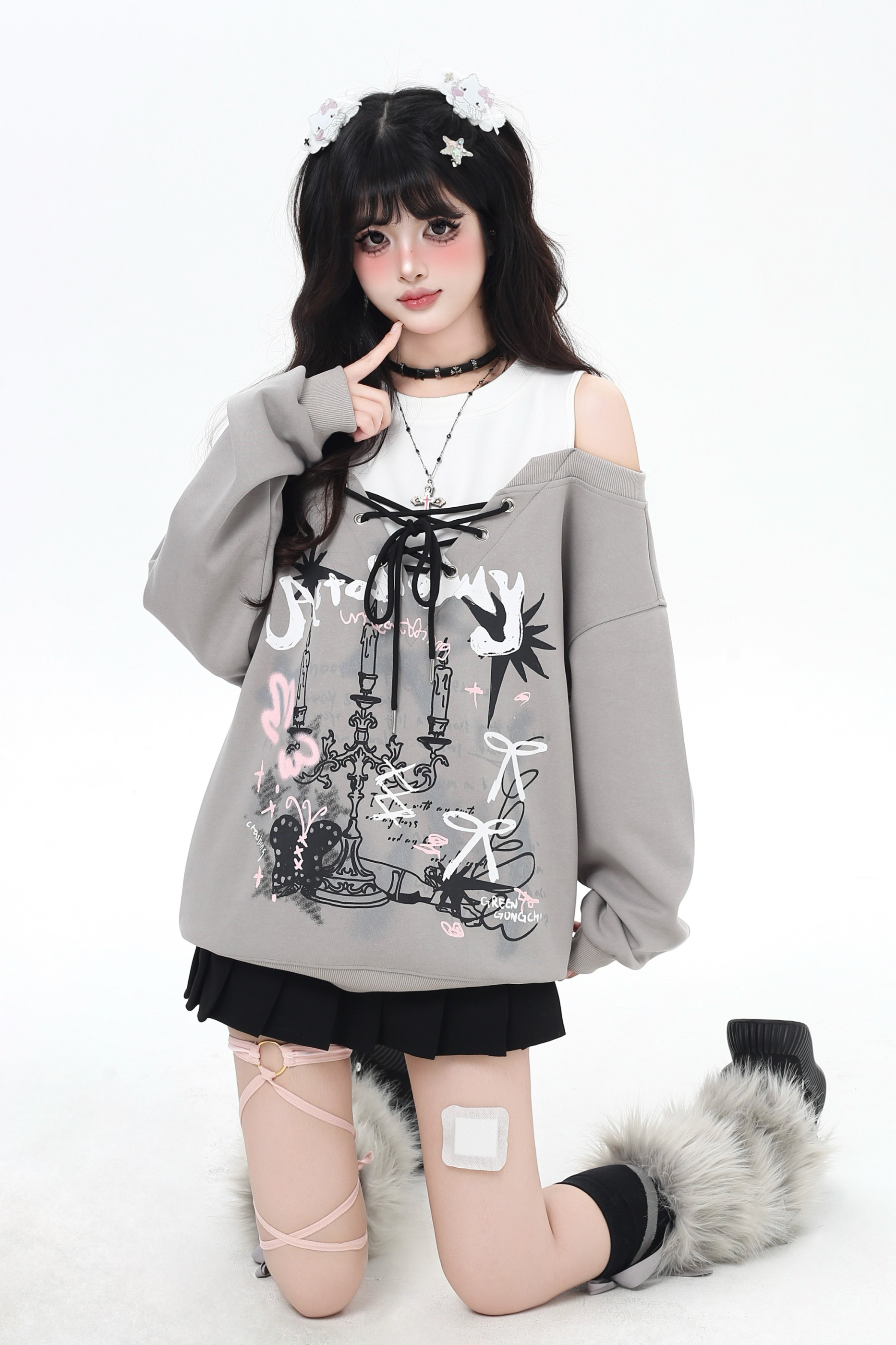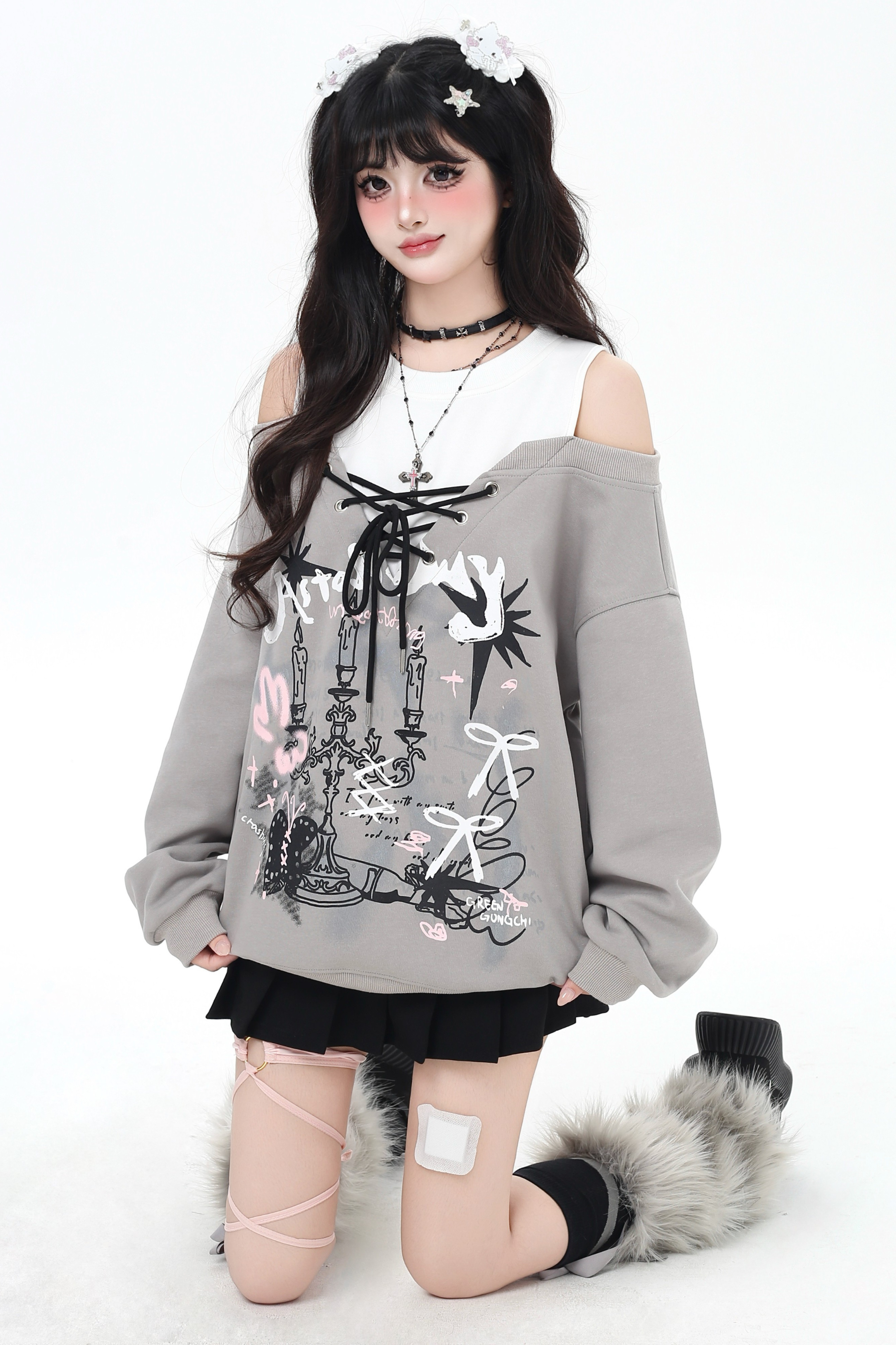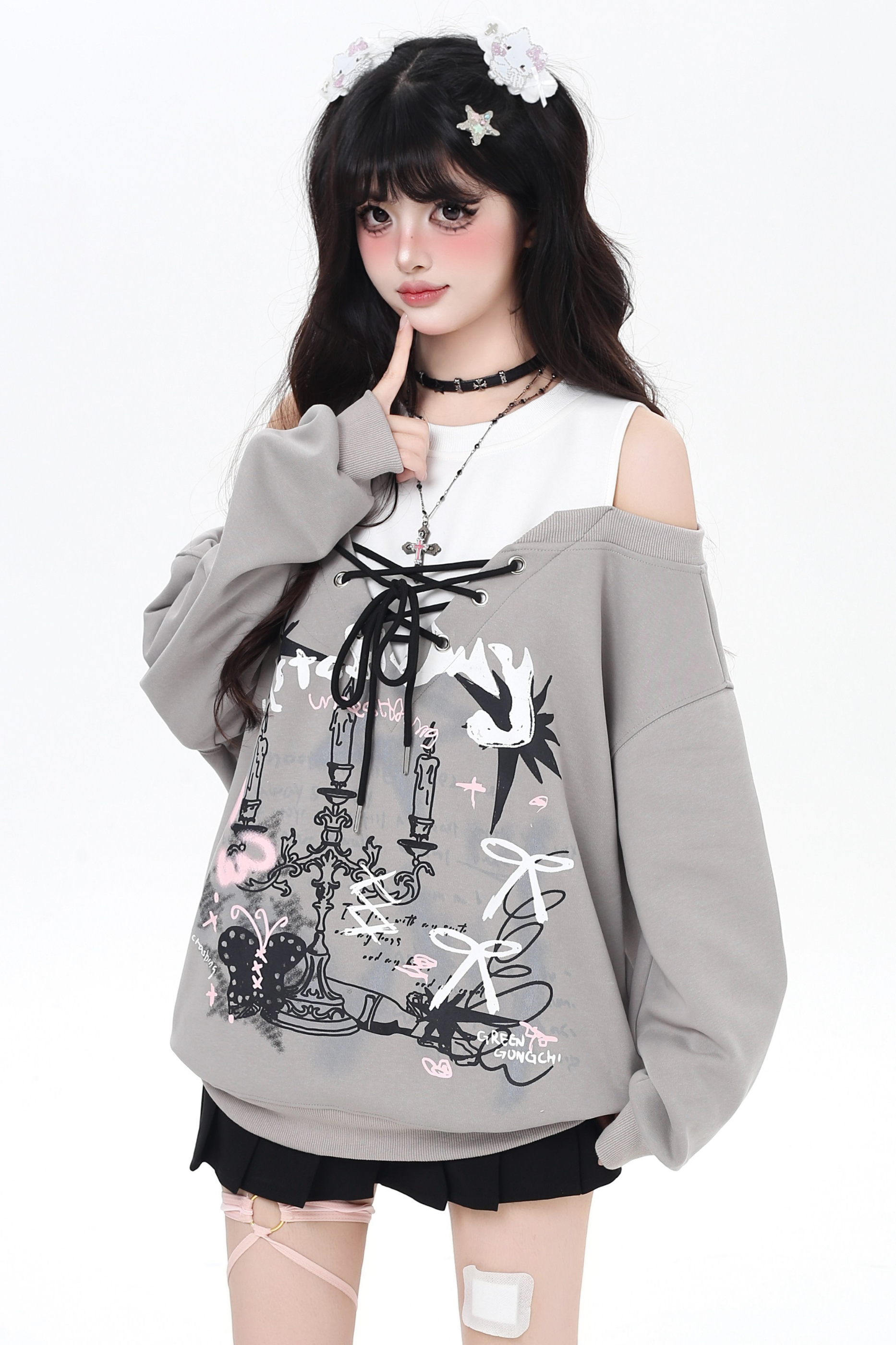 ❤スイートストラップフェイクツーピースオフショルダーデザインガーリースウェット❤