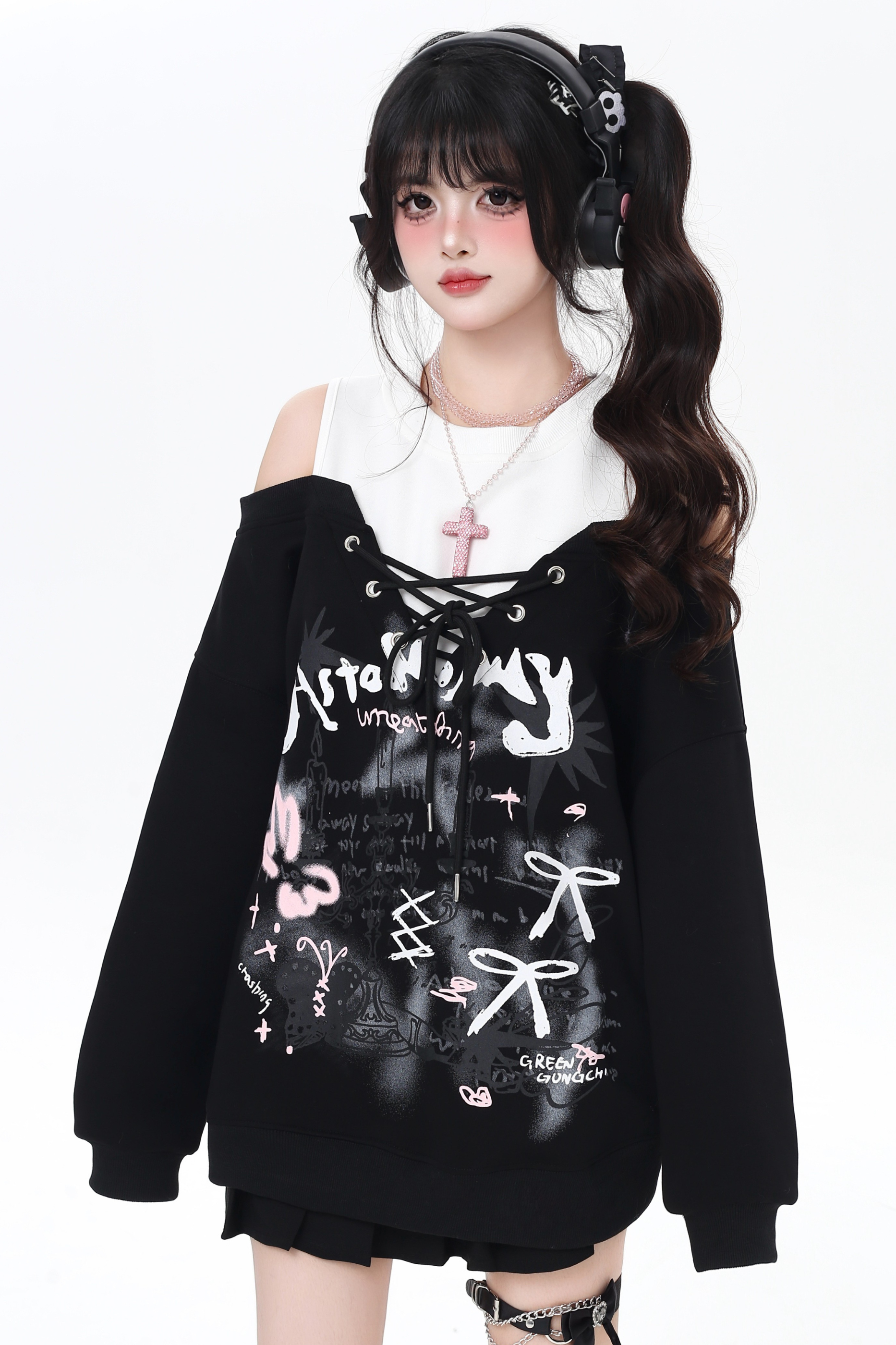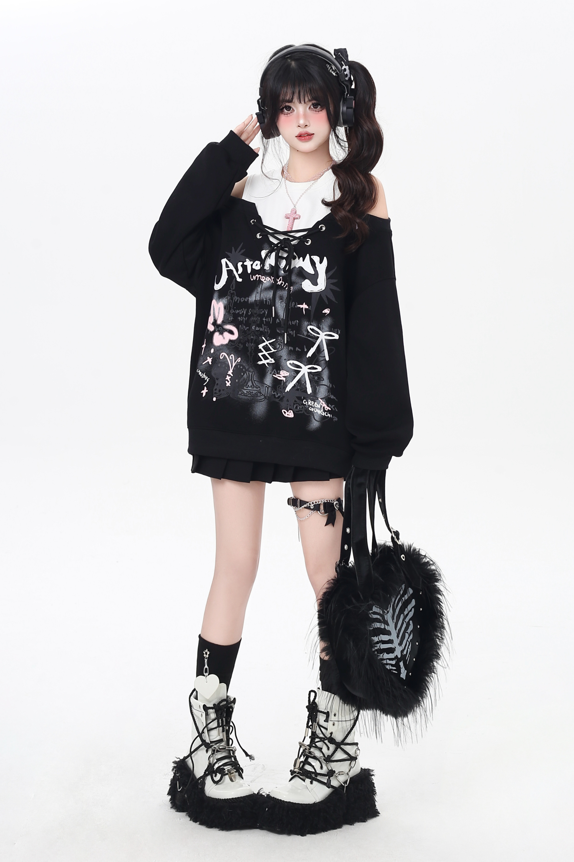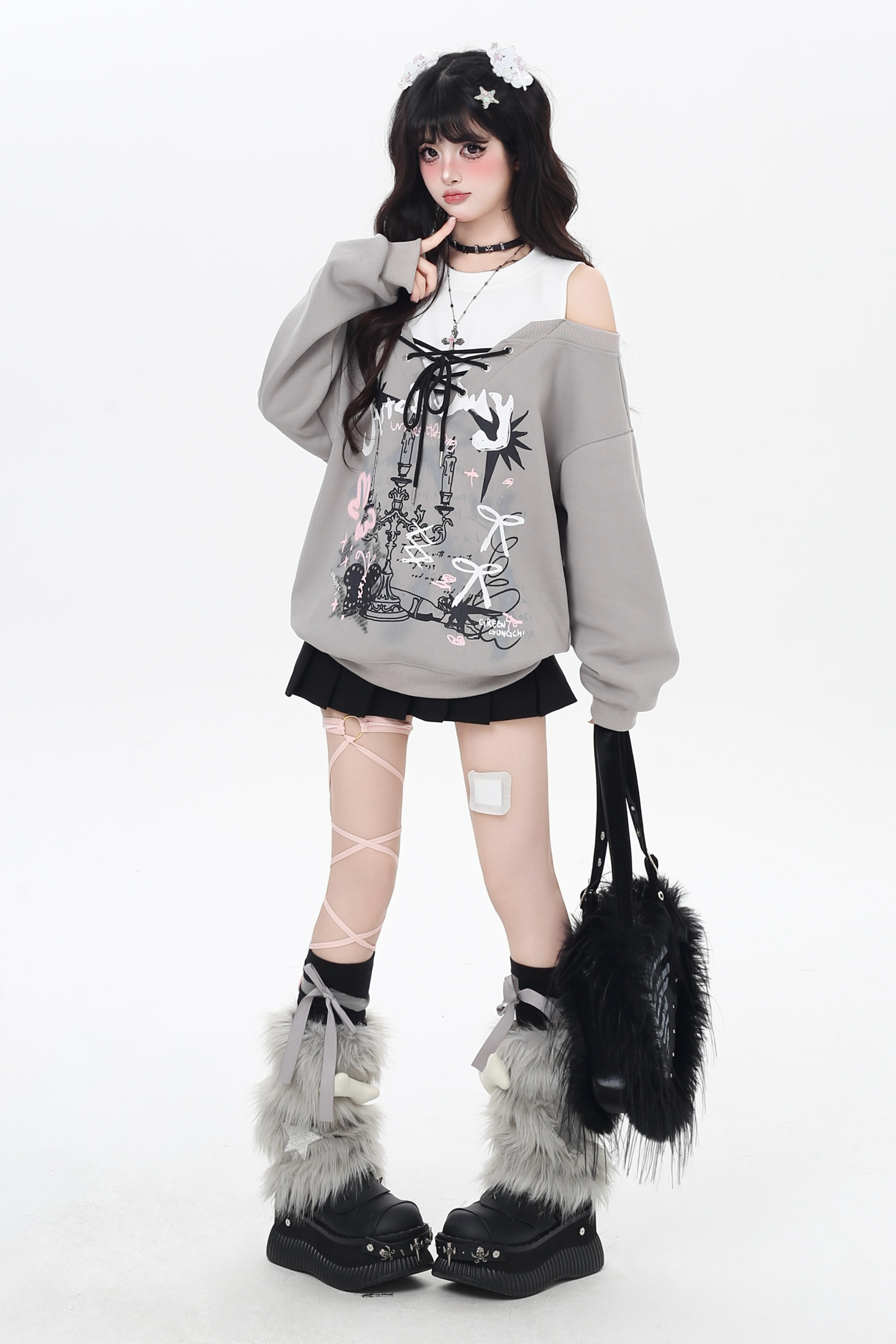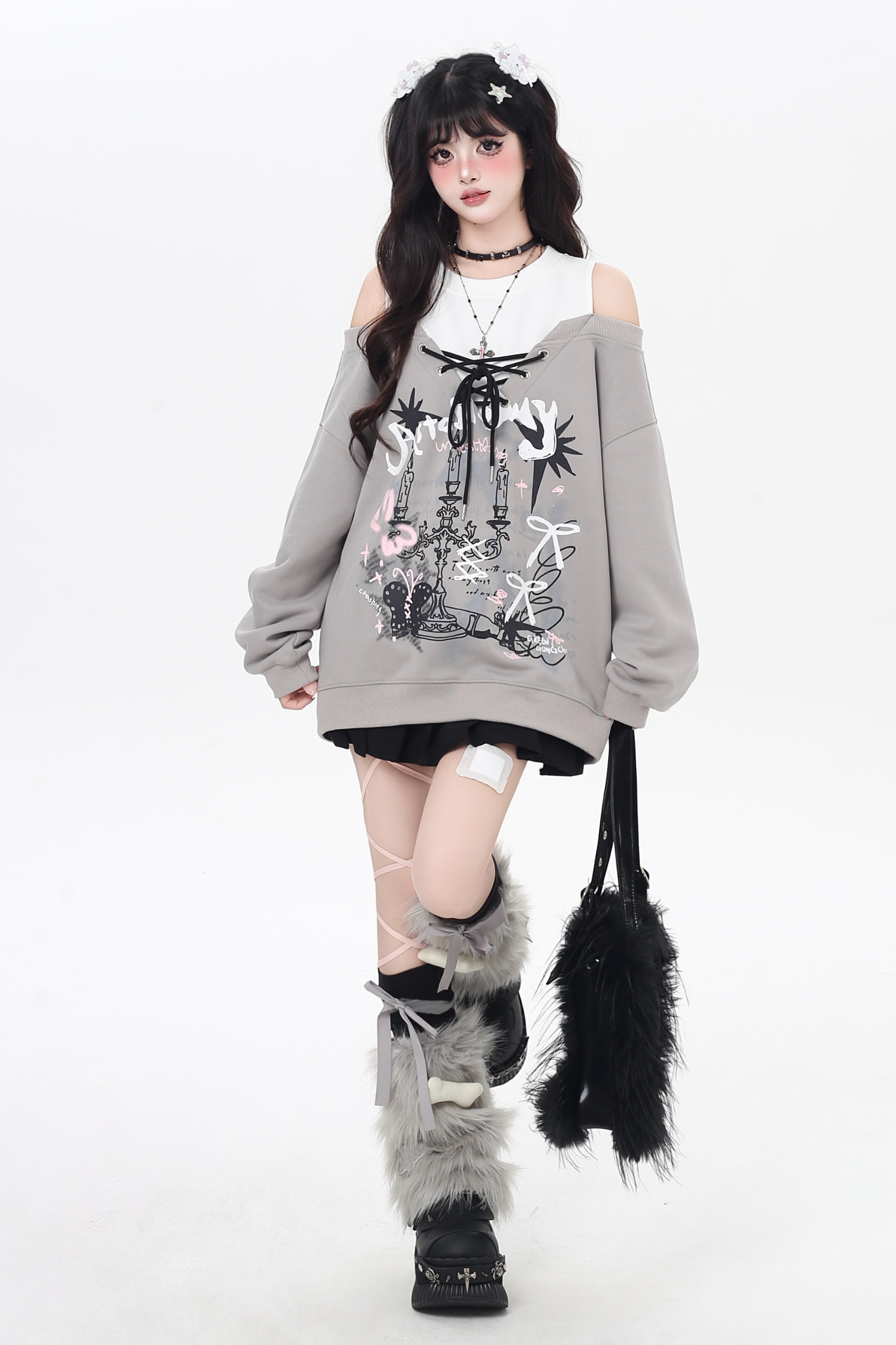 ❤スイートストラップフェイクツーピースオフショルダーデザインガーリースウェット❤