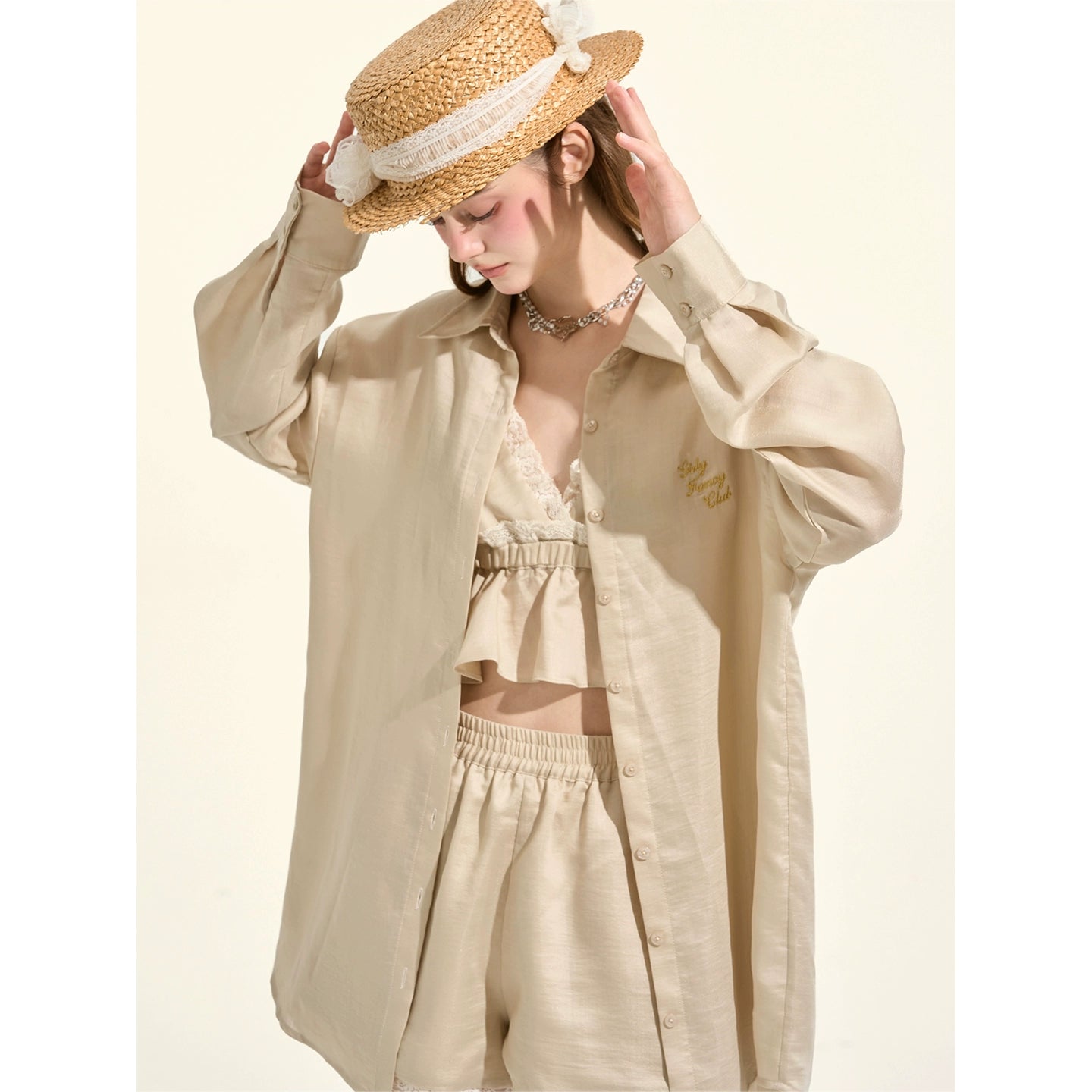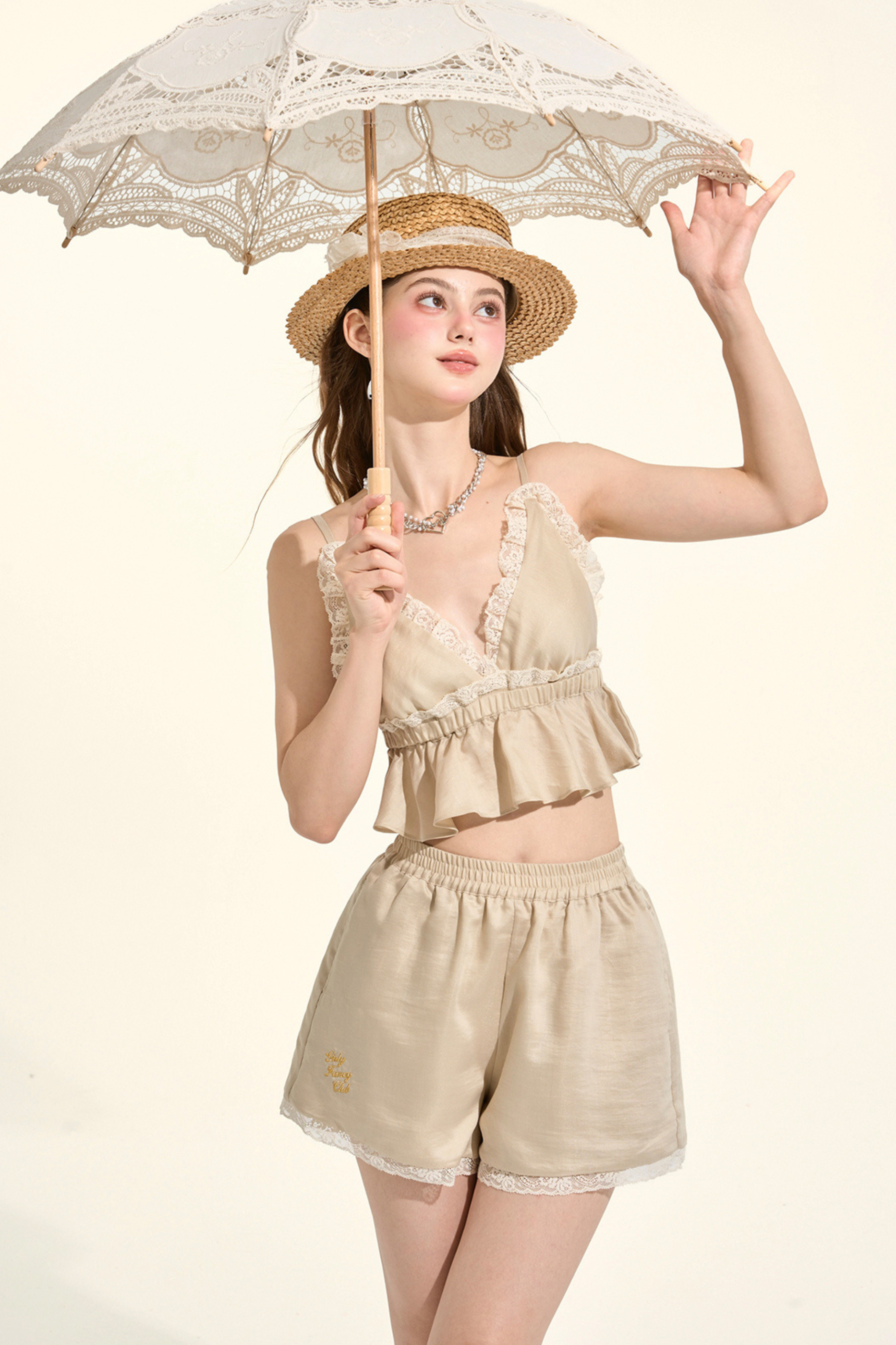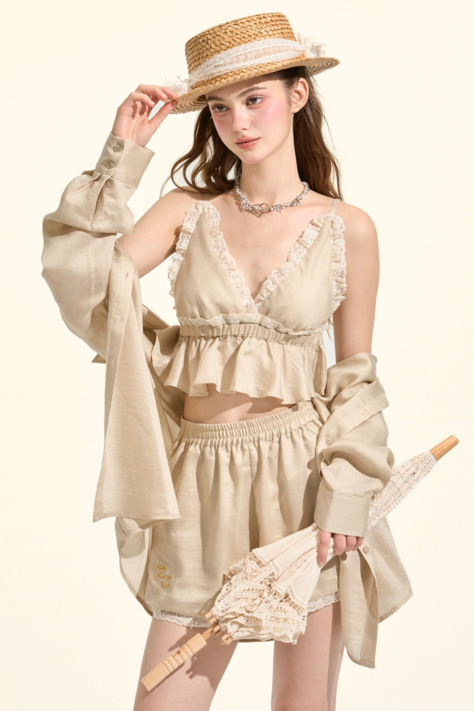 パスティルスタイルカーキレースキャミソール+シャツ +ショートパンツ
