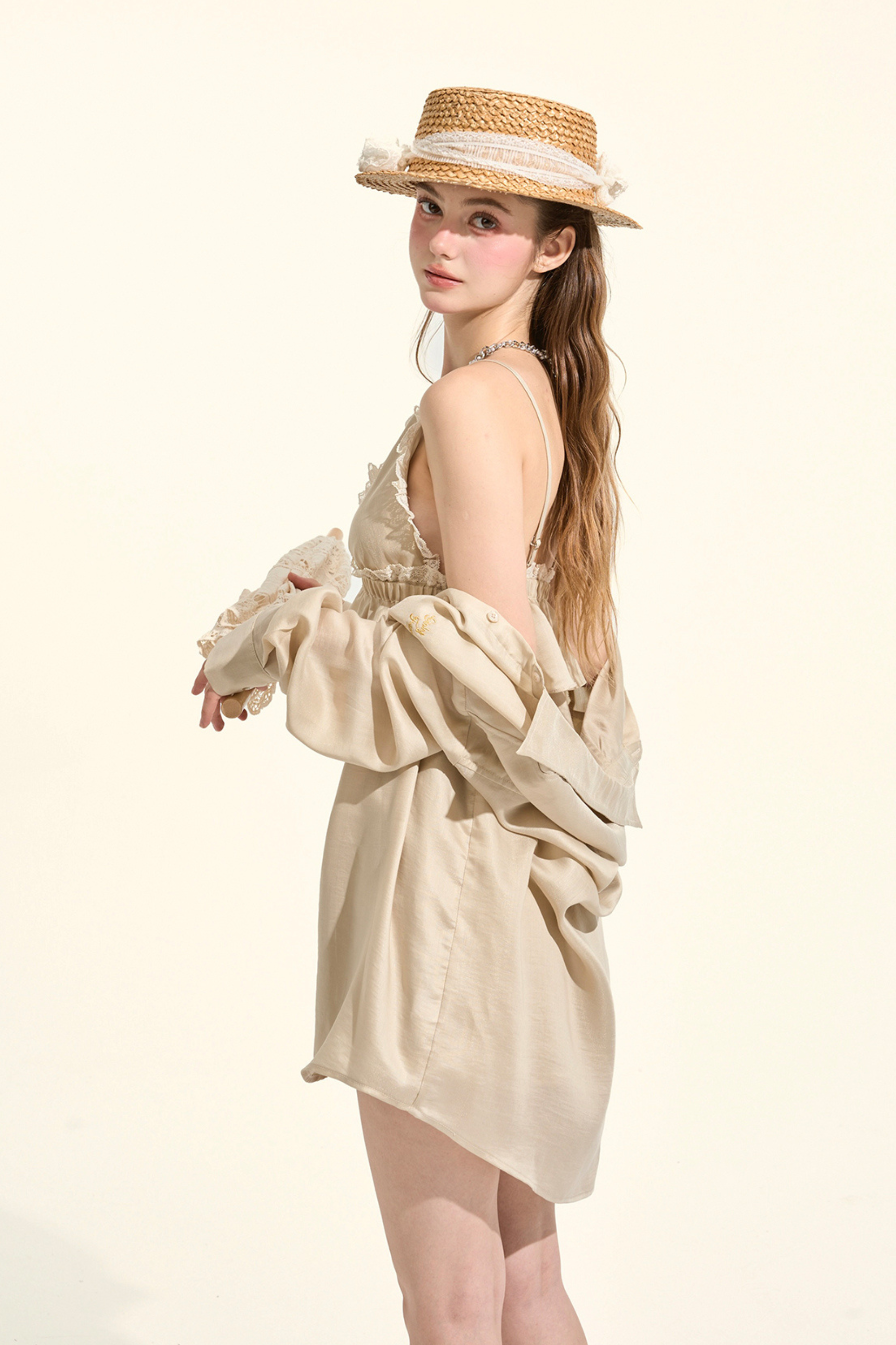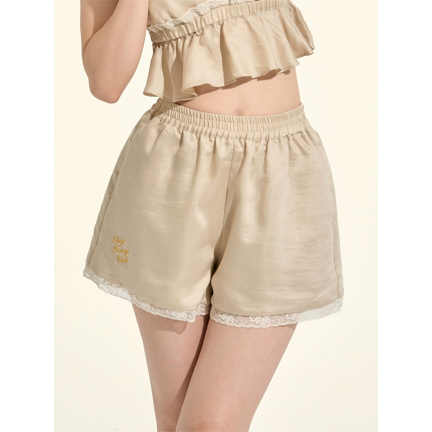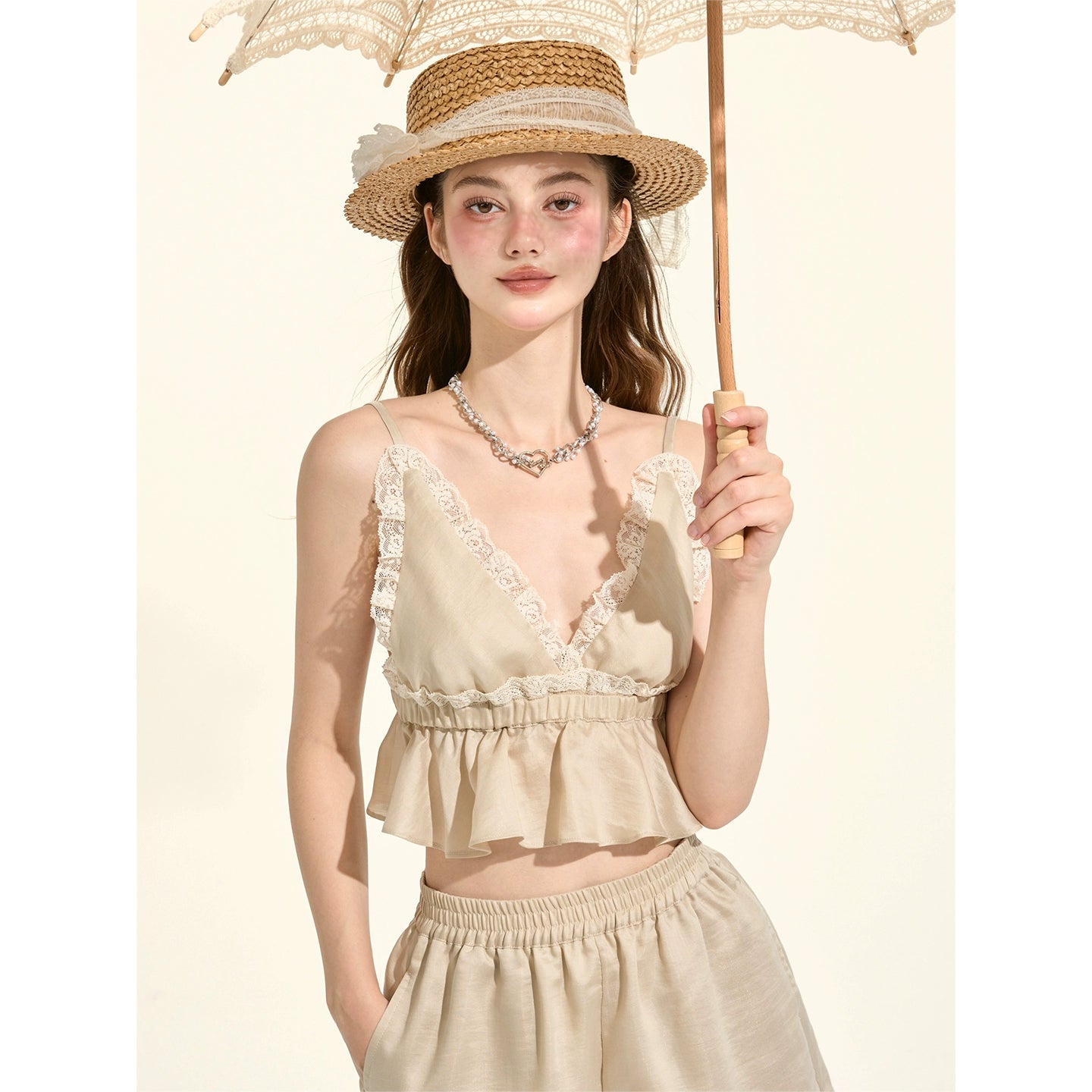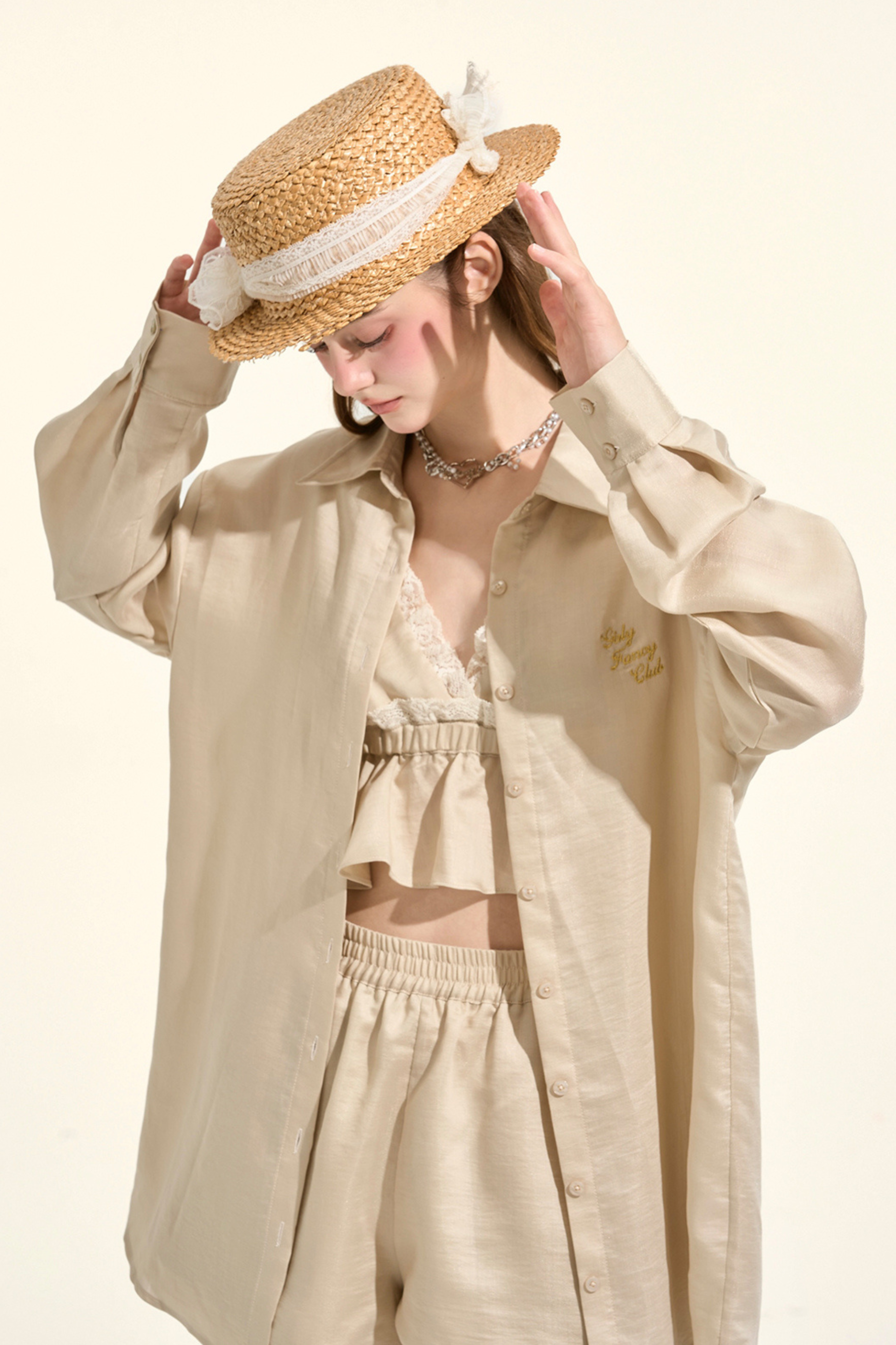 パスティルスタイルカーキレースキャミソール+シャツ +ショートパンツ