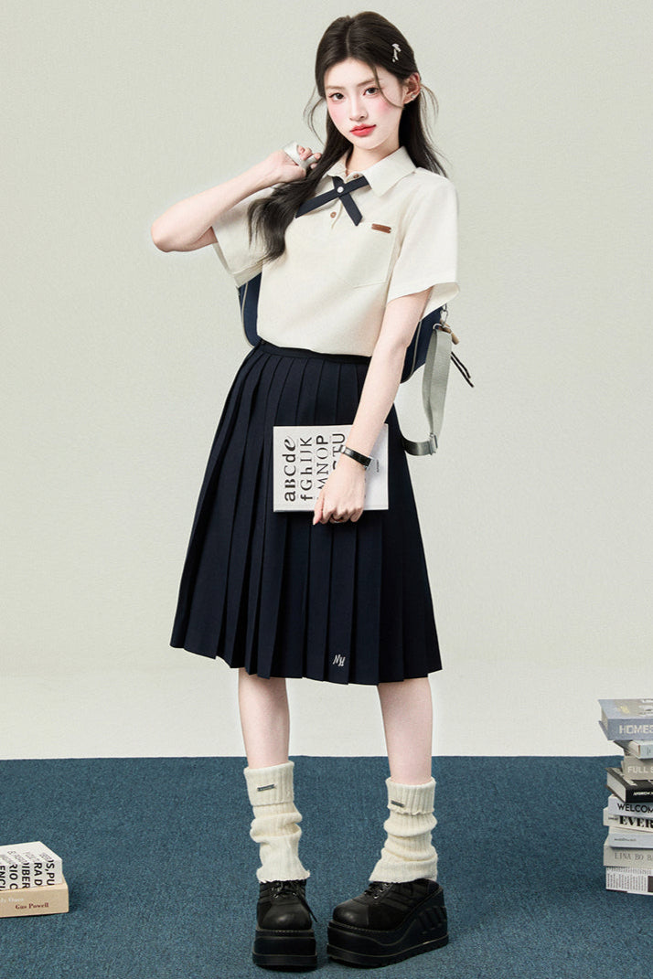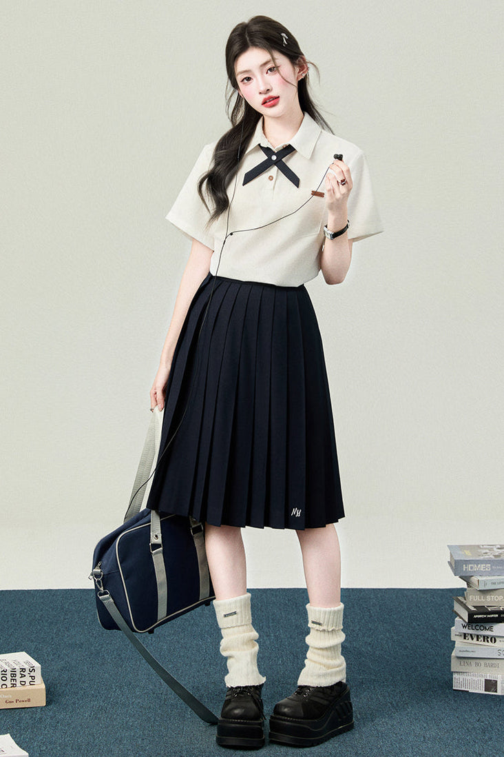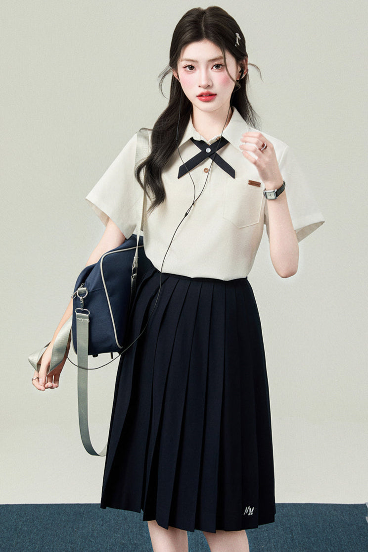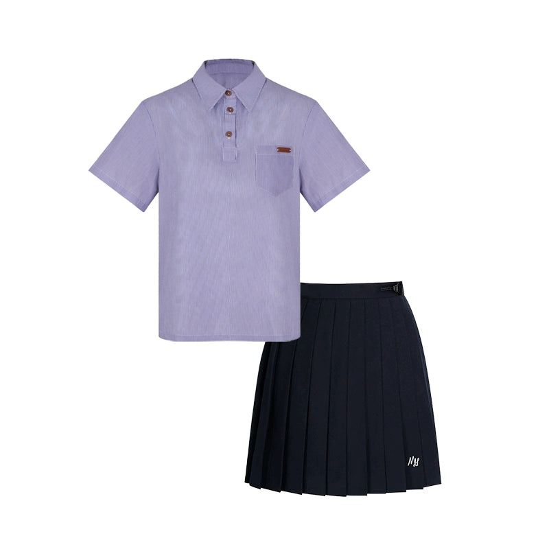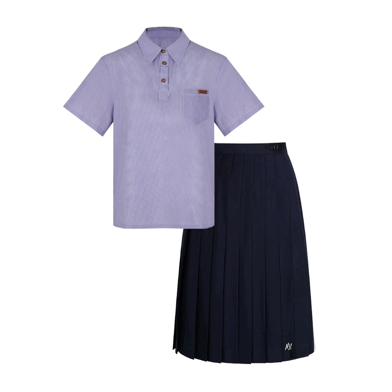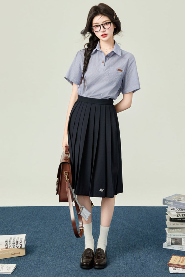 ❤カレッジポロカラーシャツ+ストライプシャツ+プリーツショートスカート+ベーシックロングスカート❤