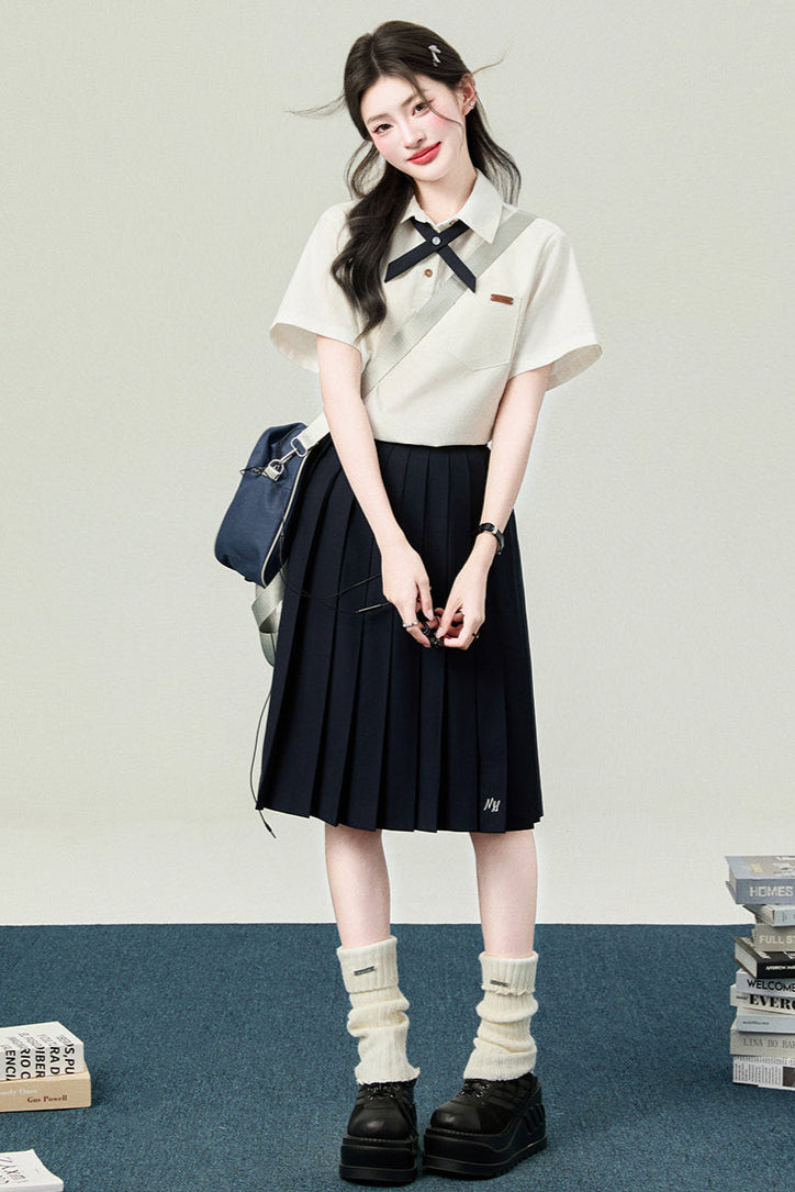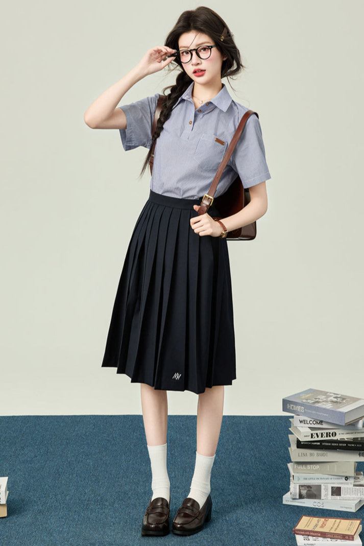 カレッジポロカラーシャツ+ストライプシャツ+プリーツショートスカート+ベーシックロングスカート