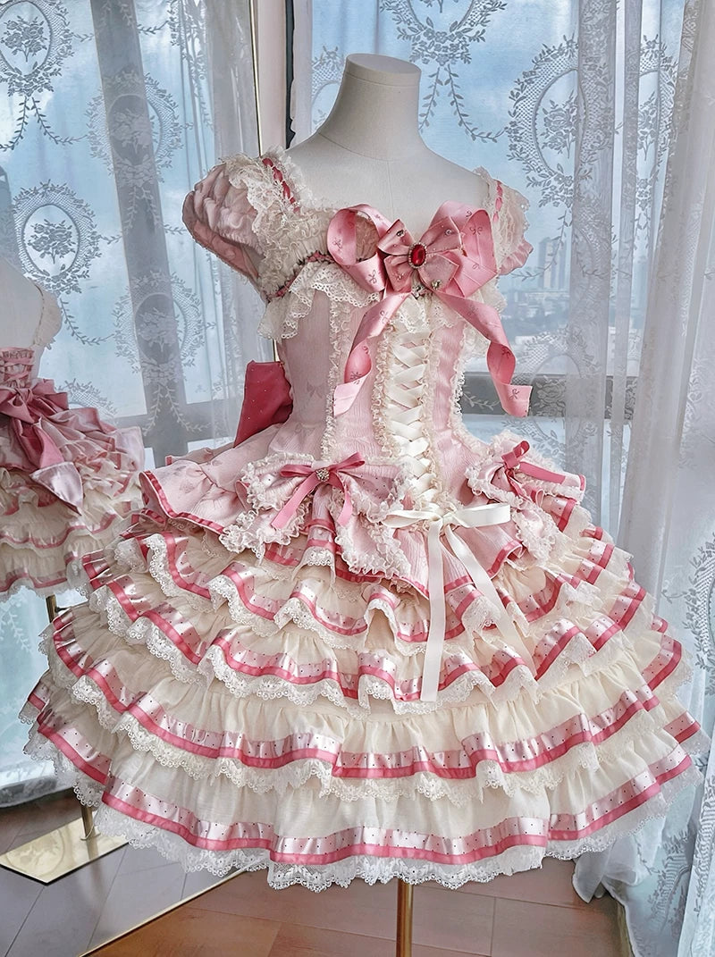 【4月30日予約締切】スウィートピンクロリータレースリボンコルセットティアードJSKドレス