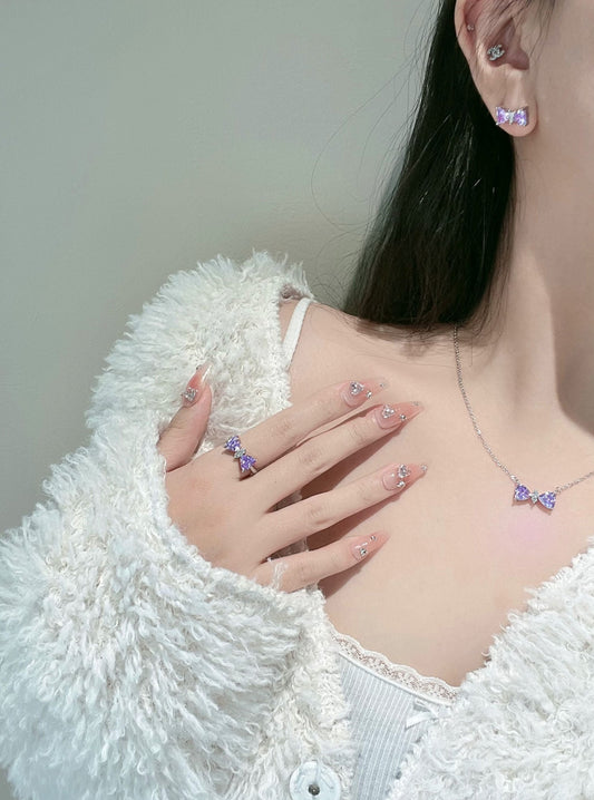 자주색 크리스탈 링 + 목걸이 + 귀걸이