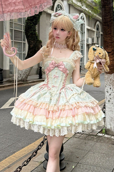 【予約商品】ピンクグリーンバレエスタイルロリータドレス+チュールベールリボン+チョーカー